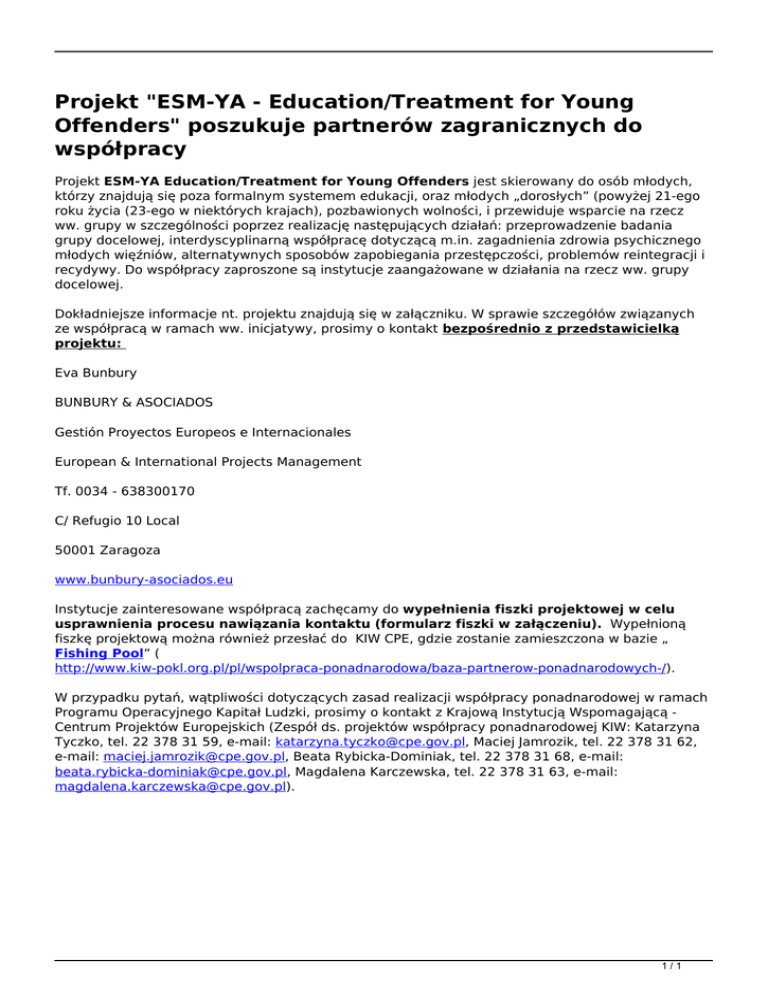 Projekt "ESM-YA - Education/Treatment for Young Offenders" poszukuje partnerów zagranicznych do współpracy Projekt ESM-YA Education/Treatment for Young Offenders jest skierowany do osób młodych, którzy znajdują się poza formalnym systemem edukacji, oraz młodych „dorosłych” (powyżej 21-ego roku życia (23-ego w niektórych krajach), pozbawionych wolności, i przewiduje wsparcie na rzecz ww. grupy w szczególności poprzez realizację następujących działań: przeprowadzenie badania grupy docelowej, interdyscyplinarną współpracę dotyczącą m.in. zagadnienia zdrowia psychicznego młodych więźniów, alternatywnych sposobów zapobiegania przestępczości, problemów reintegracji i recydywy. Do współpracy zaproszone są instytucje zaangażowane w działania na rzecz ww. grupy docelowej. Dokładniejsze informacje nt. projektu znajdują się w załączniku. W sprawie szczegółów związanych ze współpracą w ramach ww. inicjatywy, prosimy o kontakt bezpośrednio z przedstawicielką projektu: Eva Bunbury BUNBURY & ASOCIADOS Gestión Proyectos Europeos e Internacionales European & International Projects Management Tf. 0034 - 638300170 C/ Refugio 10 Local 50001 Zaragoza www.bunbury-asociados.eu Instytucje zainteresowane współpracą zachęcamy do wypełnienia fiszki projektowej w celu usprawnienia procesu nawiązania kontaktu (formularz fiszki w załączeniu). Wypełnioną fiszkę projektową można również przesłać do KIW CPE, gdzie zostanie zamieszczona w bazie „ Fishing Pool” ( http://www.kiw-pokl.org.pl/pl/wspolpraca-ponadnarodowa/baza-partnerow-ponadnarodowych-/). W przypadku pytań, wątpliwości dotyczących zasad realizacji współpracy ponadnarodowej w ramach Programu Operacyjnego Kapitał Ludzki, prosimy o kontakt z Krajową Instytucją Wspomagającą Centrum Projektów Europejskich (Zespół ds. projektów współpracy ponadnarodowej KIW: Katarzyna Tyczko, tel. 22 378 31 59, e-mail: [email protected], Maciej Jamrozik, tel. 22 378 31 62, e-mail: [email protected], Beata Rybicka-Dominiak, tel. 22 378 31 68, e-mail: [email protected], Magdalena Karczewska, tel. 22 378 31 63, e-mail: [email protected]). 1/1