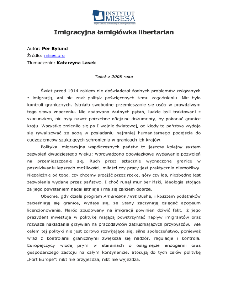 Imigracyjna łamigłówka libertarian Autor: Per Bylund Źródło: mises.org Tłumaczenie: Katarzyna Lasek Tekst z 2005 roku Świat przed 1914 rokiem nie doświadczał żadnych problemów związanych z imigracją, ani nie znał polityk poświęconych temu zagadnieniu. Nie było kontroli granicznych. Istniało swobodne przemieszanie się osób w prawdziwym tego słowa znaczeniu. Nie zadawano żadnych pytań, ludzie byli traktowani z szacunkiem, nie były nawet potrzebne oficjalne dokumenty, by pokonać granice kraju. Wszystko zmieniło się po I wojnie światowej, od kiedy to państwa wydają się rywalizować ze sobą w posiadaniu najmniej humanitarnego podejścia do cudzoziemców szukających schronienia w granicach ich krajów. Polityka imigracyjna współczesnych państw to jeszcze kolejny system zezwoleń dwudziestego wieku: wprowadzono obowiązkowe wydawanie pozwoleń na przemieszczanie się. Ruch przez sztucznie wyznaczone granice w poszukiwaniu lepszych możliwości, miłości czy pracy jest praktycznie niemożliwy. Niezależnie od tego, czy chcemy przejść przez rzekę, góry czy las, niezbędne jest zezwolenie wydane przez państwo. I choć runął mur berliński, ideologia stojąca za jego powstaniem nadal istnieje i ma się całkiem dobrze. Obecnie, gdy działa program Americans First Busha, i kosztem podatników zacieśniają się granice, wydaje się, że Stany zaczynają osiągać apogeum licencjonowania. Naród zbudowany na imigracji powinien dziwić fakt, iż jego prezydent inwestuje w politykę mającą powstrzymać napływ imigrantów oraz rozważa nakładanie grzywien na pracodawców zatrudniających przybyszów. Ale celem tej polityki nie jest zdrowo rozwijające się, silne społeczeństwo, ponieważ wraz z kontrolami granicznymi zwiększa się nadzór, regulacje i kontrola. Europejczycy wiodą prym w staraniach o osiągnięcie endogamii oraz gospodarczego zastoju na całym kontynencie. Stosują do tych celów politykę „Fort Europe”: nikt nie przyjeżdża, nikt nie wyjeżdża. Procedury przyznawania zezwoleń na migracje nie różnią się w żaden sposób od innych, mimo że uzyskały specjalną nazwę. Wydawanie zezwoleń ma ten sam skutek bez względu na to, na co są one wydawane: udzielanie pozwolenia lekarzom prowadzi do pogorszenia się opieki zdrowotnej, pomimo iż zwiększa jej koszty. Podobnie koncesje w branży taksówkarskiej prowadzą do spadku poziomu jakości usług i ich punktualności, a wzrostu cen. Wydawanie pozwoleń umożliwiających przemieszczanie się jest równoznaczne z ograniczeniem wolności oraz wyższymi podatkami (niezależnie czy będą one nałożone na pełnoprawnych obywateli czy obcokrajowców). Z punktu widzenia zwolenników libertarianizmu wydaje się dość jasne, że wszystkie koncesje powinny być zniesione, włączając te dotyczącą imigracji. Niestety sprawa imigracji wydaje się nieco dzielić libertarian, ponieważ istnieją dwa sprzeczne poglądy na temat, w jaki sposób radzić sobie z wzrostem populacji poprzez migracje. Z jednej strony, będąc zwolennikiem libertarianizmu, nie można popierać kontrolowanej polityki imigracyjnej, ponieważ rząd sam w sobie nie jest nigdy legalny. Jest to pewnego rodzaju klasyczne stanowisko libertarian w kwestii imigracji: otwarte granice. Z drugiej strony teoria o prawach naturalnych oraz, w szczególności, prawach własności prywatnej mówi nam, że każdy człowiek może przeprowadzić się w dowolnie wybrane miejsce, ale musi najpierw albo kupić kawałek ziemi, na której będzie mieszkał, albo chociaż uzyskać niezbędne pozwolenie od właściciela. W innym przypadku imigracja staje się naruszeniem naturalnych praw, wkroczeniem na zakazany teren. Taka jest interpretacja imigracji oparta na zasadach libertariańskich, którą parę lat temu zaprezentował Hans-Hermann Hoppe. Od tego czasu uzyskuje ona wzrastające poparcie oraz uznanie. Dla obserwatorów niebędących zwolennikami Partii Libertariańskiej, dyskusja na temat tych dwóch alternatyw musi wydawać się absurdalna. Jaki jest pożytek z libertariańskiej idei wolności, jeśli nie można porozumieć się w tak prostej kwestii jak imigracja? Pragnę pokazać, że idea libertariańska jest rzeczywiście tak silna jak twierdzimy, oraz że nie ma powodu, by nie udało się osiągnąć konsensusu w sprawie imigracji. Obie strony biorące udział w debacie: antyrządowa oraz ta wspierająca własność prywatną z jakiegoś powodu nie dostrzegają, że nie ma rzeczywistych sprzeczności między ich poglądami. Stanowisko nieuznające polityki rządowej w kwestii imigracji (inaczej: argumenatcja otwartych granic) oraz stanowisko odwołujące się do własności prywatnej to dwie strony tej samej monety: ich orędownicy zapomnieli jednak, że diabeł tkwi w szczegółach. Przyjrzyjmy się argumentom obu obozów i zidentyfikujmy mocne oraz słabe strony ich poglądów. Otwarte granice Osoby popierające ideę „otwartych granic” w kwestii imigracji twierdzą, że granice pomiędzy państwami to sztuczne twory oparte na przymusowej władzy państwa i dlatego w żaden sposób nie są zgodne z prawem. Biorąc pod uwagę bieg spraw, nie powinniśmy (albo nie możemy) kontrolować imigracji. Każdy ma prawo osiedlić się i mieszkać tam, gdzie chce. Jest to kwestia prawa naturalnego; nikt nie ma prawa zmusić mnie do czegoś, chyba że jest to akt samoobrony w sytuacji, gdy ja naruszam prawa danej osoby. W porządku świata opartym na prawach naturalnych tego typu twierdzenie byłoby prawdziwe. Złotą, a zarazem praktyczną zasadą, jest zachowanie polegające na tym, że jeśli ktoś zostawi mnie w spokoju, to ja odwdzięczę się tym samym. Jeśli natomiast ktoś będzie próbował zaatakować mnie albo zmusić mnie do czegoś, mam prawo użyć siły, aby bronić siebie i tego, co do mnie przynależy. Wydaje mi się, że wszyscy zgodzimy się, że jest to fundamentalny argument podsumowujący idee libertariańsk