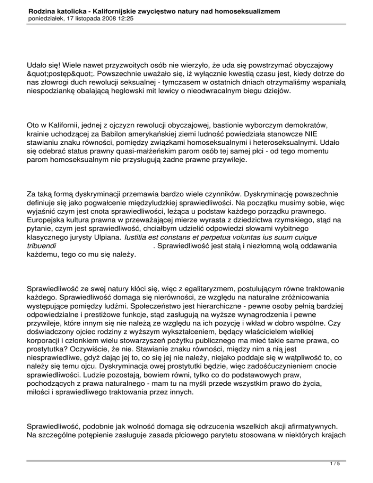 Rodzina katolicka - Kalifornijskie zwycięstwo natury nad homoseksualizmem poniedziałek, 17 listopada 2008 12:25 Udało się! Wiele nawet przyzwoitych osób nie wierzyło, że uda się powstrzymać obyczajowy "postęp". Powszechnie uważało się, iż wyłącznie kwestią czasu jest, kiedy dotrze do nas złowrogi duch rewolucji seksualnej - tymczasem w ostatnich dniach otrzymaliśmy wspaniałą niespodziankę obalającą heglowski mit lewicy o nieodwracalnym biegu dziejów. Oto w Kalifornii, jednej z ojczyzn rewolucji obyczajowej, bastionie wyborczym demokratów, krainie uchodzącej za Babilon amerykańskiej ziemi ludność powiedziała stanowcze NIE stawianiu znaku równości, pomiędzy związkami homoseksualnymi i heteroseksualnymi. Udało się odebrać status prawny quasi-małżeńskim parom osób tej samej płci - od tego momentu parom homoseksualnym nie przysługują żadne prawne przywileje. Za taką formą dyskryminacji przemawia bardzo wiele czynników. Dyskryminację powszechnie definiuje się jako pogwałcenie międzyludzkiej sprawiedliwości. Na początku musimy sobie, więc wyjaśnić czym jest cnota sprawiedliwości, leżąca u podstaw każdego porządku prawnego. Europejska kultura prawna w przeważającej mierze wyrasta z dziedzictwa rzymskiego, stąd na pytanie, czym jest sprawiedliwość, chciałbym udzielić odpowiedzi słowami wybitnego klasycznego jurysty Ulpiana. Iustitia est constans et perpetua voluntas ius suum cuique tribuendi . Sprawiedliwość jest stałą i niezłomną wolą oddawania każdemu, tego co mu się należy. Sprawiedliwość ze swej natury kłóci się, więc z egalitaryzmem, postulującym równe traktowanie każdego. Sprawiedliwość domaga się nierówności, ze względu na naturalne zróżnicowania występujące pomiędzy ludźmi. Społeczeństwo jest hierarchiczne - pewne osoby pełnią bardziej odpowiedzialne i prestiżowe funkcje, stąd zasługują na wyższe wynagrodzenia i pewne przywileje, które innym się nie należą ze względu na ich pozycję i wkład w dobro wspólne. Czy doświadczony ojciec rodziny z wyższym wykształceniem, będący właścicielem wielkiej korporacji i członkiem wielu stowarzyszeń pożytku publicznego ma mieć takie same prawa, co prostytutka? Oczywiście, że nie. Stawianie znaku równości, między nim a nią jest niesprawiedliwe, gdyż dając jej to, co się jej nie należy, niejako poddaje się w wątpliwość to, co należy się temu ojcu. Dyskryminacja owej prostytutki będzie, więc zadośćuczynieniem cnocie sprawiedliwości. Ludzie pozostają, bowiem równi, tylko co do podstawowych praw, pochodzących z prawa naturalnego - mam tu na myśli przede wszystkim prawo do życia, miłości i sprawiedliwego traktowania przez innych. Sprawiedliwość, podobnie jak wolność domaga się odrzucenia wszelkich akcji afirmatywnych. Na szczególne potępienie zasługuje zasada płciowego parytetu stosowana w niektórych krajach 1/5 Rodzina katolicka - Kalifornijskie zwycięstwo natury nad homoseksualizmem poniedziałek, 17 listopada 2008 12:25 i instytucjach. Polega ona na obsadzaniu określonych stanowisk nie według rzeczywistych kompetencji, ale według płci. W ten sposób menadżerem w firmie nie zostanie dobrze wykształcony i uzdolniony mężczyzna - jego posadę dostanie kobieta, za to tylko, że jest kobietą. Z resztą, czy nie jest pewną niesprawiedliwością wobec wspólnoty takie samo traktowanie kobiet i mężczyzn? Czyż nikt nie zadał sobie trudu zrozumieć, że emancypacja kobiet doprowadziła do kryzysu macierzyństwa i rodziny? Sprawiedliwość jako cnota społeczna musi osadzać się w kategorii dobra wspólnego, stąd klasyczna zasada suum cuique tribuendi nie może pozostawać postulatem formalnym - powinna ona znajdować swoje odzwierciedlenie materialne, wskazywane przez rozum. Rozum dyktuje nam, zaś że czasami dla dobra wspólnego, będącego dobrem człowieka jako istoty społecznej jest konieczne stosowanie mechanizmów dyskryminacyjnych. Pełna dyskryminacja homoseksualistów we wszystkich możliwych sferach życia nie ma oczywiście najmniejszego sensu, a co więcej jest niesprawiedliwa - np. zwolnienie z pracy dobrego lekarza za to, że jest gejem. Takie zachowanie kłóci się z zasadą suum cuique tribuendi. Orientacja seksualna nie ma tutaj żadnego związku z wykonywaną pracą, stąd jako kwalifikacja do wykonywania zawodu zachowuje charakter neutralny. Inaczej oczywiście wygląda sytuacja geja, będącego nauczycielem i stykającego się na codzień w pracy z nastoletnimi chłopcami. Ktoś taki nie ma kwalifikacji do pracy z młodzieżą (zwłaszcza męską), dlatego zwolnienie jego będzie jak najbardziej sprawiedliwe. Szczególnie wrażliwe normy odnoszą się do związku małżeńskiego i związanych z nim przywilejów prawnych. Ochrona i opieka nad heteroseksualnym małżeństwem oznacza wyróżnienie tego rodzaju związku, spośród innych związków międzyludzkich (np. konkubinatów) polegające na jego afirmacji i uprzywilejowaniu względem nich. Związek małżeński zakłada trwałe pożycie, między mężczyzną i kobietą, nastawione na prokreację, będącą przyczyną istnienia rodziny, stanowiącej poprzez proces socjalizacji jednostek podstawową komórkę społeczną. Norma konstytucyjna w sposób jednoznaczny łączy związek małżeński z rodzicielstwem, możliwym tylko i wyłącznie w ramach zbliżeń heteroseksualnych. Tylko małżeństwo stanowi, bowiem społecznie aprobowaną formę pożycia, w której moralnie dopuszczalne są zbliżenia seksualne - poza nim przyczyniają się one do społecznej atomizacji, wiążąc się z rozbijaniem kluczowych dla dobra wspólnego więzi międzyludzkich. Jeżeli zaspokajanie popędu seksualnego (remedium concupiscenciae) wymyka się spod ram małżeńskich, wówczas dochodzi do zaburzenia społecznego ładu i osłabienia trwałości wspólnoty rodzinnej, z czym nierozerwalnie związane jest osłabienie socjalizacyj