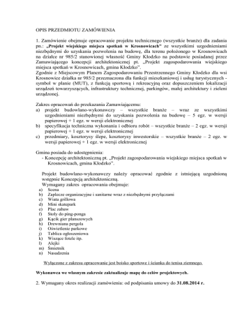 OPIS PRZEDMIOTU ZAMÓWIENIA 1. Zamówienie obejmuje opracowanie projektu technicznego (wszystkie branże) dla zadania pn.: „Projekt wiejskiego miejsca spotkań w Krosnowicach” ze wszystkimi uzgodnieniami niezbędnymi do uzyskania pozwolenia na budowę, dla terenu położonego w Krosnowicach na działce nr 985/2 stanowionej własność Gminy Kłodzko na podstawie posiadanej przez Zamawiającego koncepcji architektonicznej pt. „Projekt zagospodarowania wiejskiego miejsca spotkań w Krosnowicach, gmina Kłodzko”. Zgodnie z Miejscowym Planem Zagospodarowaniu Przestrzennego Gminy Kłodzko dla wsi Krosnowice działka nr 985/2 przeznaczona dla funkcji mieszkaniowej i usług turystycznych symbol w planie (MUT), z funkcją sportową i rekreacyjną oraz dopuszczeniem lokalizacji urządzeń towarzyszących, infrastruktury technicznej, parkingów, małej architektury i zieleni urządzonej. Zakres opracowań do przekazania Zamawiającemu: a) projekt budowlano-wykonawczy – wszystkie branże – wraz ze wszystkimi uzgodnieniami niezbędnymi do uzyskania pozwolenia na budowę – 5 egz. w wersji papierowej + 1 egz. w wersji elektronicznej b) specyfikacja techniczna wykonania i odbioru robót – wszystkie branże – 2 egz. w wersji papierowej + 1 egz. w wersji elektronicznej c) przedmiary, kosztorysy ślepe, kosztorysy inwestorskie – wszystkie branże – 2 egz. w wersji papierowej + 1 egz. w wersji elektronicznej Gmina posiada do udostępnienia: - Koncepcję architektoniczną pt. „Projekt zagospodarowania wiejskiego miejsca spotkań w Krosnowicach, gmina Kłodzko”. Projekt budowlano-wykonawczy należy opracować zgodnie z istniejącą uzgodnioną wstępnie Koncepcją architektoniczną. Wymagany zakres opracowania obejmuje: a) b) c) d) e) f) g) h) i) j) k) l) m) n) Scena Zaplecze organizacyjne i sanitarne wraz z niezbędnymi przyłączami Wiata grillowa Mini skatepark Plac zabaw Stoły do ping-ponga Kącik gier planszowych Drewniana pergola Oświetlenie parkowe Tablica ogłoszeniowa Wiszące fotele itp. Alejki Śmietnik Nasadzenia Wyłączone z zakresu opracowanie jest boisko sportowe i ścianka do tenisa ziemnego. Wykonawca we własnym zakresie zaktualizuje mapę do celów projektowych. 2. Wymagany okres realizacji zamówienia: od podpisania umowy do 31.08.2014 r. 3. Każdy z wykonawców winien odwiedzić miejsce projektowanego zagospodarowania terenu celem sprawdzenia warunków związanych z wykonaniem prac będących przedmiotem przetargu oraz celem uzyskania jakichkolwiek dodatkowych informacji koniecznych i przydatnych do oceny prac, gdyż wyklucza się możliwość roszczeń Wykonawcy z tytułu błędnego skalkulowania ceny lub pominięcia elementów niezbędnych do wykonania umowy. Koszty odwiedzenia miejsca, którego dotyczy opracowanie poniesie wykonawca. 4. Szczegółowo opis przedmiotu zamówienia przedstawiono w dołączonym do niniejszego zapytania ofertowego „Projekcie zagospodarowania wiejskiego miejsca spotkań w Krosnowicach, gmina Kłodzko”. 5. Pozostałe warunki zostały przedstawione w projekcie Umowy stanowiącym załącznik do niniejszej specyfikacji.