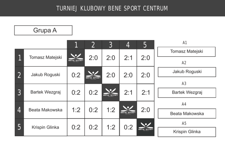 TURNIEJ KLUBOWY BENE SPORT CENTRUM Grupa A 1 2 3 4 5 A1 Tomasz Matejski 1 Tomasz Matejski 2 Jakub Roguski 2:0 0:2 2:0 2:0 2:1 2:0 2:0 2:0 A2 Jakub Roguski A3 3 Bartek Wezgraj 0:2 0:2 2:1 2:1 Bartek Wezgraj A4 4 5 Beata Makowska Krispin Glinka 1:2 0:2 0:2 0:2 2:0 1:2 1:2 0:2 Beata Makowska A5 Krispin Glinka TURNIEJ KLUBOWY BENE SPORT CENTRUM Grupa B 1 2 3 4 5 B1 Wojciech Górecki 1 Wojciech Górecki 2 Kacper Bobala 2:1 2:0 2:0 1:2 2:0 2:0 2:1 2:0 B2 Kacper Bobala B3 3 Rafał Chabowski 0:2 0:2 2:0 2:1 Rafał Chabowski B4 4 5 Piotr Dowlasz Artur Szczurowski 0:2 1:2 0:2 0:2 0:2 0:2 1:2 2:0 Artur Szczurowski B5 Piotr Dowlasz TURNIEJ KLUBOWY BENE SPORT CENTRUM Grupa C 1 2 3 4 5 C1 Adam Saganowski 1 Grigoris Ikonomu 2 Adam Saganowski 0:2 2:0 2:0 2:0 2:1 2:0 2:0 2:0 C2 Grigoris Ikonomu C3 3 Daniel Szostak 0:2 0:2 2:0 2:0 Daniel Szostak C4 4 5 Filip Wilkowiecki Dominik Zdulski 1:2 0:2 0:2 0:2 2:0 0:2 0:2 0:2 Filip Wilkowiecki C5 Dominik Zdulski TURNIEJ KLUBOWY BENE SPORT CENTRUM Grupa D 1 2 3 4 5 D1 Krzysztof Romański 1 Krzysztof Romański 2 Peter Robb 2:0 0:2 2:1 1:2 2:1 2:0 2:0 2:0 D2 Sebastian Piszczek D3 3 Sebastian Piszczek 1:2 2:1 2:1 2:0 Peter Robb D4 4 5 Janek Wiśniewski Małgorzata Żak 1:2 0:2 0:2 0:2 2:0 1:2 0:2 0:2 Janek Wiśniewski A5 Małgorzata Żak TURNIEJ KLUBOWY BENE SPORT CENTRUM A1 Tomasz Matejski Tomasz Matejski C2 Grigoris Ikonomu Tomasz Matejski B2 Kacper Bobala Kacper Bobala D1 Krzysztof Romański Tomasz Matejski C1 Adam Saganowski Wojciech Górecki Jakub Roguski A2 1 2 Jakub Roguski Wojciech Górecki D2 Sebastian Piszczek Wojciech Górecki B1 Wojciech Górecki Kacper Bobala Jakub Roguski 3 Jakub Roguski Kacper Bobala 4 Grigoris Ikonomu Grigoris Ikonomu Krzysztof Romański Grigoris Ikonomu 5 Adam Saganowski Adam Saganowski Adam Saganowski 6 Sebastian Piszczek Krzysztof Romański Sebastian Piszczek 7 Sebastian Piszczek Krzysztof Romański 8 TURNIEJ KLUBOWY BENE SPORT CENTRUM A3 Bartek Wezgraj Bartek Wezgraj C4 Filip Wilkowiecki Peter Robb B4 Artur Szczurowski Peter Robb D3 Peter Robb Peter Robb C3 Daniel Szostak Beata Makowska Beata Makowska A4 9 10 Beata Makowska Beata Makowska D4 Filip Wilkowiecki Rafał Chabowski B3 Rafał Chabowski Bartek Wezgraj Rafał Chabowski 11 Rafał Chabowski Bartek Wezgraj 12 Filip Wilkowiecki Filip Wilkowiecki Artur Szczurowski Janek Wiśniewski 13 Daniel Szostak Janek Wiśniewski Filip Wilkowiecki 14 Janek Wiśniewski Artur Szczurowski Daniel Szostak 15 Daniel Szostak Artur Szczurowski 16 TURNIEJ KLUBOWY BENE SPORT CENTRUM A5 Krispin Glinka Krispin Glinka C5 Dominik Zdulski Krispin Glinka D5 Małgorzata Żak Piotr Dowlasz B5 17 Piotr Dowlasz Piotr Dowlasz 18 Dominik Zdulski Dominik Zdulski 19 Małgorzata Żak Małgorzata Żak 20