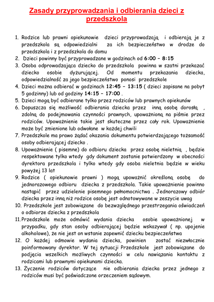 Zasady przyprowadzania i odbierania dzieci z przedszkola 1. Rodzice lub prawni opiekunowie dzieci przyprowadzają i odbierają je z przedszkola są odpowiedzialni za ich bezpieczeństwo w drodze do przedszkola i z przedszkola do domu 2. Dzieci powinny być przyprowadzane w godzinach od 6:00 – 8:15 3. Osoba odprowadzająca dziecko do przedszkola powinna w szatni przekazać dziecko osobie dyżurującej. Od momentu przekazania dziecka, odpowiedzialność za jego bezpieczeństwo ponosi przedszkole 4. Dzieci można odbierać w godzinach 12:45 – 13:15 ( dzieci zapisane na pobyt 5 godzinny) lub od godziny 14:15 – 17:00 . 5. Dzieci mogą być odbierane tylko przez rodziców lub prawnych opiekunów 6. Dopuszcza się możliwość odbierania dziecka przez inną osobę dorosłą , zdolną do podejmowania czynności prawnych, upoważnioną na piśmie przez rodziców. Upoważnienie takie jest skuteczne przez cały rok. Upoważnienie może być zmienione lub odwołane w każdej chwili 7. Przedszkole ma prawo żądać okazania dokumentu potwierdzającego tożsamość osoby odbierającej dziecko . 8. Upoważnienie ( pisemne) do odbioru dziecka przez osobę nieletnią , będzie respektowane tylko wtedy gdy dokument zostanie potwierdzony w obecności dyrektora przedszkola i tylko wtedy gdy osoba nieletnia będzie w wieku powyżej 13 lat 9. Rodzice ( opiekunowie prawni ) mogą upoważnić określoną osobę do jednorazowego odbioru dziecka z przedszkola. Takie upoważnienie powinno nastąpić przez udzielenie pisemnego pełnomocnictwa . Jednorazowy odbiór dziecka przez inną niż rodzice osobę jest odnotowywane w zeszycie uwag 10. Przedszkole jest zobowiązane do bezwzględnego przestrzegania oświadczeń o odbiorze dziecka z przedszkola 11. Przedszkole może odmówić wydania dziecka osobie upoważnionej w przypadku, gdy stan osoby odbierającej będzie wskazywał ( np. upojenie alkoholowe), że nie jest on wstanie zapewnić dziecku bezpieczeństwa 12. O każdej odmowie wydania dziecka, powinien zostać niezwłocznie poinformowany dyrektor. W tej sytuacji Przedszkole jest zobowiązane do podjęcia wszelkich możliwych czynności w celu nawiązania kontaktu z rodzicami lub prawnymi opiekunami dziecka. 13. Życzenie rodziców dotyczące nie odbierania dziecka przez jednego z rodziców musi być poświadczone orzeczeniem sądowym. 14. Dziecko należy odebrać z przedszkola do godziny 17;00. W przypadku nie odebrania dziecka do ustalonej godziny, nauczyciel dyżurny powinien niezwłocznie powiadomić rodziców o zaistniałym fakcie oraz zapewnić opiekę dziecku do czasu przybycia rodziców 15. W przypadku gdy pod wskazanym numerem telefonu nie można uzyskać informacji o miejscu pobytu rodziców lub prawnych opiekunów, nauczyciel oczekuje z dzieckiem w przedszkolu przez jedną godzinę. Po upływie tego czasu, nauczyciel powiadamia najbliższy komisariat policji o niemożliwości skontaktowania się z rodzicami lub prawnymi opiekunami. 16. Każda rozpoczęta godzina po godzinie 17:00 jest dodatkowo opłacana przez rodziców wg stawki ustalonej na początku roku szkolnego. Płatność następuje w terminach wnoszenia opłat za przedszkole 17.Spóźnienia rodziców są odnotowywane w zeszycie uwag ( adnotacje służą do naliczania dodatkowej opłaty ) 18. Osoba odbierająca dziecko , zgłasza to nauczycielce przez domofon. Dziecko pod opieką personelu przedszkola jest przygotowywane do wyjścia i przekazane rodzicowi. ( z wyjątkiem dzieci z grupy najmłodszej) Od tego momentu osoba odbierająca dziecko, jest za nie odpowiedzialna . Dzieci z grupy najmłodszej są rozbierane i ubierane przez rodziców 19. W celu zapewnienia dzieciom pełnego bezpieczeństwa rodzice są zobowiązani do przestrzegania godzin przyprowadzania i odbierania dzieci.