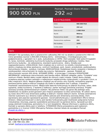 DOM NA SPRZEDAŻ 900 000 Poznań, Poznań-Stare Miasto PLN 292 m2 12/3762/ODS Cena 900 000 PLN Powierzchnia 292 m2 Cena za m2 3 082 PLN Rynek Wtórny Powierzchnia działki 450 m2 Powierzchnia użytkowa 292 Rok budowy 1976 Liczba pięter 1 Opis OKAZJA!!! Do sprzedaży dom o powierzchni całkowitej 292 m2 na działce o powierzchni 450 m2. Cena sprzedaży wynosi 1,050,000 zł.Rodzaj domu - wolnostojący, 2-kondygnacyjny,bez podpiwniczenia, z garażem na 1 auto, wybudowany w 1976r. Dom posiada: ilość pokoi 8 (sypialni 5), taras, kominek, oddzielna kuchnia.Do budynku prowadzi droga asfaltowa / kostka. Stan techniczny budynku - do odświeżenia, standard wykończenia - dobry. Działka jest zagospodarowana. LOKALIZACJA: Dom znajduje się w centrum na osiedlu mieszkaniowym. W okolicy znajdują się sklep spożywczy, centrum handlowe, park, basen, przedszkole, podstawówka. Komunikacja miejska - autobus, tramwaj. EKSPLOATACJA: Dodatkowe koszty związane z bieżącym użytkowaniem nieruchomości to media wg zużycia. Ogrzewanie - gazowe. Podatek od nieruchomości wynosi 450 zł/rok. WYDANIE DOMU - w przeciągu 1 miesiąca DODATKOWE INFORMACJE: Lokalizacja nieruchomości jest bardzo dobra. Bliskość sklepów, parku "Cytadela" oraz centrum miasta. Bardzo dobry szybki dojazd do różnych części miasta. Całość domu została ocieplona poprzez system swisspor o najwyższym współczynniku izolacyjności, o grubości 12cm, w kilku miejscach 10cm. Wejście główne znajduje się od strony ulicy Żytniej, wchodzimy poprzez pomieszczenie/ pokój w którym znajduje się szafa w zabudowie oraz 3 pokoje, 2 łazienki i możliwość zaaranżowania kuchni. Właściciele obecnie funkcjonują na piętrze (kuchnia, salon, dwie sypialnie, aneks kuchenny, 2 łazienki,2 balkony). parter wymaga ponownej aranżacji. Projekt aranżacji prześlę zainteresowanym osobom. Na parterze mieści się garaż dla jednego auta. Dodatkowo na działce przed garażem jest miejsce postojowe na dwa samochody. W całości domu są nowe okna PCV oraz drewniane podłogi w dobrym i bardzo dobrym stanie. Schody wewnętrzne również wykonane są z drewna.Część sufitów pokryta jest drewnianą sosnową deską. Dom ogrzewany jest poprzez ogrzewanie gazowe - kocioł jednofunkcyjny z zasobnikiem (Micro Genus Ariston). Układ pomieszczeń w domu jest bardzo funkcjonalny,jest możliwość połączenia funkcji mieszkalnej z biurową, poprzez wydzielenie pomieszczeń na parterze domu. Sprawdź już dziś swoją zdolność kredytową, pomożemy Ci w tym bezpłatnie. Więcej informacji u opiekuna oferty. Kontakt w sprawie oferty pod nr telefonu: 570940540 Oferta prowadzona pod nadzorem pośrednika o nr licencji 11942 Oferujemy Państwu również lokale do wynajęcia Poznań Przejdź do oferty » Barbara Koniarek tel. +48 790 331 293 email: [email protected] NINIEJSZE WARUNKI MAJĄ CHARAKTER INFORMACYJNY ORAZ NIE STANOWIĄ OFERTY ZAWARCIA JAKIEJKOLWIEK UMOWY W ROZUMIENIU PRZEPISÓW USTAW Z DNIA 23 KWIETNIA 1964 ROKU KODEKS CYWILNY (DZ.U. Z 1964 ROKU, NR 16, POZ. 93 Z PÓŹNIEJSZYMI ZMIANAMI. Powered by TCPDF (www.tcpdf.org)