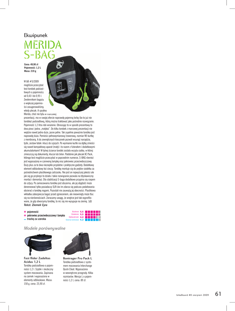 Ekwipunek Przygoda: Trójmiasto MERIDA S-BAG Cena: 49,90 zł Pojemność: 1,2 L Masa: 219 g W bB #3/2009 mogliście przeczytać test torebek podsiodłowych o pojemności od 0,43 l do 0,95 l. Zwolennikom bagażu o większej pojemności zasugerowaliśmy wtedy plecak. A sprytna Merida, choć nie była w marcowej prezentacji, ma w swojej ofercie naprawdę pojemną torbę (bo to już nie torebka) podsiodłową, którą można traktować jako pośrednie rozwiązanie. Pojemność 1,2 litra robi wrażenie. Obrazując to w sposób procentowy to dwa piwa i jedna „małpka”. Do kilku torebek z marcowej prezentacji nie wejdzie nawet jedno duże, jasne pełne. Tak zupełnie poważnie torebka jest naprawdę duża. Pomieści pełnowymiarową (rowerową, rozmiar M) kurtkę z membraną. A do zewnętrznych kieszonek pozwoli wsunąć narzędzia, łyżki, zestaw łatek i klucz do szprych. Po wymianie kurtki na dętkę zmieści się nawet kompaktowy aparat (mały) i to razem z futerałem i dodatkowymi akumulatorkami! W tylnej ściance torebki została wszyta siatka, w której zmieszczą się dokumenty, klucze lub bilon. Podobnie jak plecak XC Pack, którego test mogliście przeczytać w poprzednim numerze, S-BAG również jest wyposażony w czerwoną lampkę oraz pokrowiec przeciwdeszczowy. Duży plus za te dwa niezwykle przydatne i praktyczne gadżety. Dodatkowy element odblaskowy też cieszy. Torebkę montuje się do prętów siodełka za pośrednictwem plastikowego zatrzasku. Nie jest on najwyższej jakości ale jak się go przykręci to działa i takie rozwiązanie pozwala na błyskawiczny montaż i demontaż. Dla stabilizacji S-baga dodatkowo przypina się rzepem do sztycy. Po zamocowaniu torebka jest obszerna, ale jej objętość może denerwować tylko posiadaczy SLR-ów im zdarza się podczas pedałowania obcierać o torebkę nogami, Pozostali nie zauważą jej obecności. Plastikowa wkładka zabezpiecza bagaż przed zgnieceniem, ale nieowinięty może tłuc się na nierównościach. Zwracamy uwagę, że wnętrze jest tak wyprofilowane, że gdy otworzymy torebkę, to nic się nie wysypuje na ziemię. Tekst: Ziemek Cyra pojemność pokrowiec przeciwdeszczowy i lampka trochę za szeroka Budowa Działanie Opłacalność Ocena końcowa 5,5 5,5 4,2 5,2 Modele porównywalne Fast Rider Zadeltas Acidus 1,2 L Torebka podsiodłowa o pojemności 1,2 l. Szybki i skuteczny system mocowania. Zapinana na zamek i wyposażona w elementy odblaskowe. Masa: 150 g, cena: 25,90 zł. Bontrager Pro Pack L Torebka podsiodłowa z systemem mocowania Interchange Quick Cleat. Wyposażona w wewnętrzne przegrody. Kilka rozmiarów. Wersja L o pojemności 1,2 l, cena: 89 zł. bi ke Boa r d # 8 s i er p i eń 2 0 0 9 61