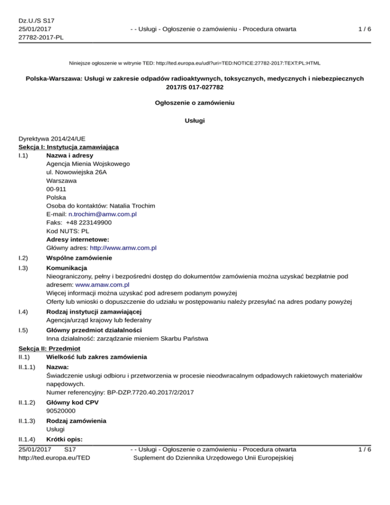 Dz.U./S S17 25/01/2017 27782-2017-PL - - Usługi - Ogłoszenie o zamówieniu - Procedura otwarta 1/6 Niniejsze ogłoszenie w witrynie TED: http://ted.europa.eu/udl?uri=TED:NOTICE:27782-2017:TEXT:PL:HTML Polska-Warszawa: Usługi w zakresie odpadów radioaktywnych, toksycznych, medycznych i niebezpiecznych 2017/S 017-027782 Ogłoszenie o zamówieniu Usługi Dyrektywa 2014/24/UE Sekcja I: Instytucja zamawiająca I.1) Nazwa i adresy Agencja Mienia Wojskowego ul. Nowowiejska 26A Warszawa 00-911 Polska Osoba do kontaktów: Natalia Trochim E-mail: [email protected] Faks: +48 223149900 Kod NUTS: PL Adresy internetowe: Główny adres: http://www.amw.com.pl I.2) Wspólne zamówienie I.3) Komunikacja Nieograniczony, pełny i bezpośredni dostęp do dokumentów zamówienia można uzyskać bezpłatnie pod adresem: www.amaw.com.pl Więcej informacji można uzyskać pod adresem podanym powyżej Oferty lub wnioski o dopuszczenie do udziału w postępowaniu należy przesyłać na adres podany powyżej I.4) Rodzaj instytucji zamawiającej Agencja/urząd krajowy lub federalny I.5) Główny przedmiot działalności Inna działalność: zarządzanie mieniem Skarbu Państwa Sekcja II: Przedmiot II.1) Wielkość lub zakres zamówienia II.1.1) Nazwa: Świadczenie usługi odbioru i przetworzenia w procesie nieodwracalnym odpadowych rakietowych materiałów napędowych. Numer referencyjny: BP-DZP.7720.40.2017/2/2017 II.1.2) Główny kod CPV 90520000 II.1.3) Rodzaj zamówienia Usługi II.1.4) Krótki opis: 25/01/2017 S17 http://ted.europa.eu/TED - - Usługi - Ogłoszenie o zamówieniu - Procedura otwarta Suplement do Dziennika Urzędowego Unii Europejskiej 1/6 Dz.U./S S17 25/01/2017 27782-2017-PL - - Usługi - Ogłoszenie o zamówieniu - Procedura otwarta 2/6 Przedmiotem zamówienia jest świadczenie usługi odbioru i przetworzenia w procesie nieodwracalnym odpadowych rakietowych materiałów napędowych (RMN): utleniacza paliwa rakietowego AK 20k i paliwa rakietowego TG-02 (saminy). II.1.5) Szacunkowa całkowita wartość II.1.6) Informacje o częściach To zamówienie podzielone jest na części: nie II.2) Opis II.2.1) Nazwa: II.2.2) Dodatkowy kod lub kody CPV II.2.3) Miejsce świadczenia usług Kod NUTS: PL II.2.4) Opis zamówienia: Świadczenie usługi odbioru i przetworzenia w procesie nieodwracalnym odpadowych rakietowych materiałów napędowych (RMN): utleniacza paliwa rakietowego AK 20k i paliwa rakietowego TG-02 (saminy). II.2.5) Kryteria udzielenia zamówienia Cena nie jest jedynym kryterium udzielenia zamówienia; wszystkie kryteria są wymienione tylko w dokumentacji zamówienia II.2.6) Szacunkowa wartość II.2.7) Okres obowiązywania zamówienia, umowy ramowej lub dynamicznego systemu zakupów Okres w dniach: 120 Niniejsze zamówienie podlega wznowieniu: nie II.2.10) Informacje o ofertach wariantowych Dopuszcza się składanie ofert wariantowych: nie II.2.11) Informacje o opcjach Opcje: nie II.2.12) Informacje na temat katalogów elektronicznych II.2.13) Informacje o funduszach Unii Europejskiej Zamówienie dotyczy projektu/programu finansowanego ze środków Unii Europejskiej: nie II.2.14) Informacje dodatkowe Wykonawca obowiązany jest do wniesienia wadium w kwocie: 20 000 PLN. Sekcja III: Informacje o charakterze prawnym, ekonomicznym, finansowym i technicznym III.1) Warunki udziału III.1.1) Zdolność do prowadzenia działalności zawodowej, w tym wymogi związane z wpisem do rejestru zawodowego lub handlowego Wykaz i krótki opis warunków: 1. O udzielenie zamówienia może ubiegać się Wykonawca, który nie podlega wykluczeniu w okolicznościach, o których mowa w art. 24 ust. 1 ustawy. 2. O udzielenie zamówienia może ubiegać się Wykonawca, który spełnia warunki udziału w postępowaniu, o których mowa w art. 22 ust. 1b ustawy dotyczące kompetencji lub uprawnień do prowadzenia określonej działalności zawodowej, o ile wynika to z odrębnych przepisów tj. posiada uprawnienia do prowadzenia działalności w zakresie przetworzenia odpadów niebezpiecznych o kodach 06 01 05* oraz 16 03 05*.Warunki udziału w postępowaniu, o których mowa powyżej zostaną uznane za spełnione, jeżeli Wykonawca: 25/01/2017 S17 http://ted.europa.eu/TED - - Usługi - Ogłoszenie o zamówieniu - Procedura otwarta Suplement do Dziennika Urzędowego Unii Europejskiej 2/6 Dz.U./S S17 25/01/2017 27782-2017-PL - - Usługi - Ogłoszenie o zamówieniu - Procedura otwarta 3/6 A) W przypadku wykonawców realizujących usługę na terytorium RP: obowiązujące na czas składania oferty i realizacji usługi zezwolenie obejmujące prowadzenie działalności w zakresie przetwarzania odpadów o kodach 06 01 05* oraz 16 03 05*, określonych zgodnie z Rozporządzeniem Ministra Środowiska z dnia 9 grudnia 2014 r. w sprawie katalogu odpadów (Dz. U. z 2014 r., poz. 1923) i w ilościach odpowiadających co najmniej ilościom określonym w załączniku nr 1 do SIWZ, B) W przypadku wykonawców realizujących usługę poza terytorium RP: dokument potwierdzający, że Wykonawca posiada – na czas składania oferty i realizacji usługi – uprawnienia do prowadzenia działalności gospodarczej w zakresie przetwarzania odpadów o kodach 06 01 05* oraz 16 03 05* i w ilościach odpowiadających co najmniej ilościom określonym w załączniku nr 1 do SIWZ przypisanym do poszczególnych kodów odpadów, wydane zgodnie z obowiązującymi przepisami prawa, właściwymi dla danego kraju. 3. Wstępnym potwierdzeniem wykazania braku podstaw wykluczenia będzie złożone wraz z Formularzem oferty oświadczenie w formie JEDZ (załącznik nr 5 do SIWZ), w części III: „Podstawy wykluczenia”: — sekcji A: „Podstawy związane z wyrokami skazującymi za przestępstwo”, — sekcji B: „Podstawy związane z płatnością podatków lub składek na ubezpieczenie społeczne”, — sekcji C: „Podstawy związane z niewypłacalnością, konfliktem interesów lub wykroczeniami zawodowymi”, we wskazanym zakresie, — sekcji D: „In