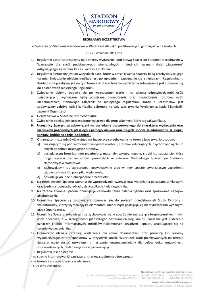 REGULAMIN UCZESTNICTWA w Spacerze po Stadionie Narodowym w Warszawie dla szkół podstawowych, gimnazjalnych i średnich 18 i 25 września 2011 rok 1. Regulamin został sporządzony na potrzeby wydarzenia pod nazwą Spacer po Stadionie Narodowym w Warszawie dla szkół podstawowych, gimnazjalnych i średnich, zwanym dalej „Spacerem” odbywającego się w dniu 18 i 25 września 2011 roku. 2. Regulamin kierowany jest do wszystkich osób, które w czasie trwania Spaceru będą przebywały na jego terenie. Zwiedzanie obiektu możliwe jest po uprzednim zapoznaniu się z niniejszym Regulaminem. Każda osoba przebywająca na tym terenie w czasie trwania wydarzenia zobowiązana jest stosować się do postanowień niniejszego Regulaminu. 3. Zwiedzanie obiektu odbywa się po wyznaczonej trasie i na własną odpowiedzialność osób zwiedzających, wymagane będą podpisane oświadczenia oraz oświadczenia rodziców osób niepełnoletnich, stanowiące załącznik do niniejszego regulaminu. Każdy z uczestników jest zobowiązany założyć kask i kamizelkę ochronną na cały czas trwania Wydarzenia. Kaski i kamizelki zapewni Organizator. 4. Uczestnictwo w Spacerze jest nieodpłatne. 5. Zwiedzanie obiektu jest przeznaczone wyłącznie dla grup szkolnych, które się zakwalifikują. 6. Uczestnicy Spaceru są zobowiązani do posiadania dostosowanego do charakteru wydarzenia oraz warunków pogodowych płaskiego i pełnego obuwia oraz długich spodni. Niedozwolone są klapki, sandały, krótkie spodnie i spódniczki. 7. Organizator może odmówić wstępu na Spacer oraz przebywania na terenie jego trwania osobom: a) znajdującym się pod widocznym wpływem alkoholu, środków odurzających, psychotropowych lub innych podobnie działających środków, b) posiadającym broń lub inne przedmioty, materiały, wyroby, napoje, środki lub substancje, które mogą zagrażać bezpieczeństwu pozostałych uczestników Niedzielnego Spaceru po Stadionie Narodowym w Warszawie, c) zachowującym się agresywnie, prowokacyjnie albo w inny sposób stwarzającym zagrożenie bezpieczeństwa lub porządku wydarzenia, d) posiadającym inne niebezpieczne przedmioty. 8. Na teren trwania Spaceru zabrania się wprowadzania zwierząt oraz wjeżdżania pojazdami silnikowymi oraz jazdy na rowerach, rolkach, deskorolkach, hulajnogach, itp. 9. Na terenie trwania Spaceru obowiązuje całkowity zakaz palenia tytoniu oraz spożywania napojów alkoholowych. 10. Uczestnicy Spaceru są zobowiązani stosować się do poleceń przedstawicieli Służb Ochrony i wolontariuszy, którzy wyróżniają się elementami ubioru bądź posługują się identyfikatorami wydanymi przez Organizatora. 11. Uczestnicy Spaceru zobowiązani są zachowywać się w sposób nie zagrażający bezpieczeństwu innych osób obecnych, a w szczególności przestrzegać postanowień Regulaminu. Zakazane jest niszczenie oznaczeń i tablic informacyjnych, nośników reklamowych, urządzeń i sprzętu znajdującego się na terenie wydarzenia, itp. 12. Organizator utrwala przebieg wydarzenia dla celów dokumentacji oraz promocji lub reklamy wydarzeń/organizatora/sponsorów w przyszłych latach. Wizerunek osób przebywających na terenie Spaceru może zostać utrwalony, a następnie rozpowszechniany dla celów dokumentacyjnych, sprawozdawczych, reklamowych oraz promocyjnych. 13. Regulamin jest dostępny: - na stronie internetowej Organizatora, tj. www.stadionnarodowy.org.pl - na terenie i w czasie trwania wydarzenia. 14. Zasady kwalifikacji: - Każdy Uczestnik ma obowiązek przyjść z wypełnionym oświadczeniem swoim bądź rodzica. - Spacer organizowany jest dla szkół podstawowych, gimnazjalnych i średnich, każda szkoła może wydelegować maximum 2 klasy/grupy. - Reszta klas/grup z danej szkoły jest wpisana na listę rezerwową i będzie zaproszona w przypadku rezygnacji wcześniej zakwalifikowanych grup. - Klasa/grupa może liczyć maximum 30 osób (wraz z 4 opiekunami). - Zgłoszenia są przyjmowane pod adresem [email protected] i powinny zawierać nazwę szkoły, klasę, oraz numer telefonu do osoby kontaktowej. - Zgłoszenia są przyjmowane do wyczerpania limitu klas/grup. - Każde zgłoszenie, które wpłynie do tego momentu otrzyma informację zwrotną o zakwalifikowaniu i potwierdzeniu godziny zbiórki.