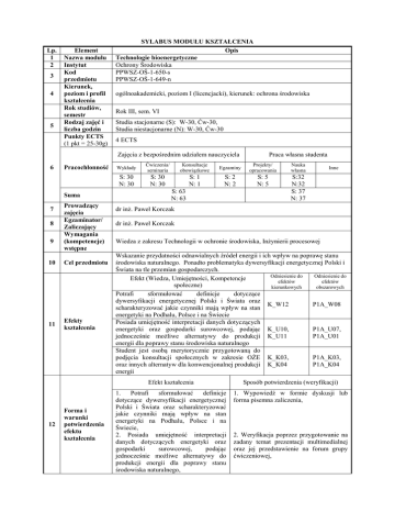 Lp. 1 2 3 4 5 Element Nazwa modułu Instytut Kod przedmiotu Kierunek, poziom i profil kształcenia Rok studiów, semestr Rodzaj zajęć i liczba godzin Punkty ECTS (1 pkt = 25-30g) SYLABUS MODUŁU KSZTAŁCENIA Opis Technologie bioenergetyczne Ochrony Środowiska PPWSZ-OŚ-1-650-s PPWSZ-OŚ-1-649-n ogólnoakademicki, poziom I (licencjacki), kierunek: ochrona środowiska Rok III, sem. VI Studia stacjonarne (S): W-30, Ćw-30, Studia niestacjonarne (N): W-30, Ćw-30 4 ECTS Zajęcia z bezpośrednim udziałem nauczyciela 6 Pracochłonność Suma 7 8 9 Prowadzący zajęcia Egzaminator/ Zaliczający Wymagania (kompetencje) wstępne 10 Cel przedmiotu 11 Efekty kształcenia 12 Forma i warunki potwierdzenia efektu kształcenia Praca własna studenta Wykłady Ćwiczenia/ seminaria Konsultacje obowiązkowe Egzaminy Projekty/ opracowania Nauka własna S: 30 N: 30 S: 30 N: 30 S: 1 N: 1 S: 2 N: 2 S: 5 N: 5 S:32 N:32 S: 37 N: 37 S: 63 N: 63 Inne dr inż. Paweł Korczak dr inż. Paweł Korczak Wiedza z zakresu Technologii w ochronie środowiska, Inżynierii procesowej Wskazanie przydatności odnawialnych źródeł energii i ich wpływ na poprawę stanu środowiska naturalnego. Ponadto problematyka dywersyfikacji energetycznej Polski i Świata na tle przemian gospodarczych. Odniesienie do Odniesienie do Efekt (Wiedza, Umiejętności, Kompetencje efektów efektów społeczne) kierunkowych obszarowych Potrafi sformułować definicje dotyczące dywersyfikacji energetycznej Polski i Świata oraz K_W12 P1A_W08 scharakteryzować jakie czynniki mają wpływ na stan energetyki na Podhalu, Polsce i na Świecie Posiada umiejętność interpretacji danych dotyczących energetyki oraz gospodarki surowcowej, podając K_U10, P1A_U07, jednocześnie możliwe alternatywy do produkcji K_U11 P1A_U01 energii dla poprawy stanu środowiska naturalnego Student jest osobą merytorycznie przygotowaną do podjęcia konsultacji społecznych w zakresie OŻE K_K03, P1A_K03, oraz innych alternatyw dla konwencjonalnej produkcji K_K04 P1A_K04 energii Efekt kształcenia Sposób potwierdzenia (weryfikacji) 1. Potrafi sformułować definicje dotyczące dywersyfikacji energetycznej Polski i Świata oraz scharakteryzować jakie czynniki mają wpływ na stan energetyki na Podhalu, Polsce i na Świecie, 2. Posiada umiejętność interpretacji danych dotyczących energetyki oraz gospodarki surowcowej, podając jednocześnie możliwe alternatywy do produkcji energii dla poprawy stanu środowiska naturalnego, 1. Wypowiedź w formie dyskusji lub forma pisemna zaliczenia, 2. Weryfikacja poprzez przygotowanie na zadany temat prezentacji multimedialnej oraz jej przedstawienie na forum grupy ćwiczeniowej, 13 Treści merytoryczne przedmiotu 14 Wykaz literatury podstawowej 15 Wykaz literatury uzupełniającej (pomocniczej) 3. Student jest osobą merytorycznie 3.Rozmowa/dyskusja na forum grupy przygotowaną do podjęcia konsultacji ćwiczeniowej z wykorzystaniem społecznych w zakresie OŻE oraz innych materiałów multimedialnych, alternatyw dla konwencjonalnej produkcji energii Bezpieczeństwo energetyczne świata i Polski. Źródła energii. Energia a środowisko i gospodarka. Zasoby i charakterystyka odnawialnych źródeł (OZE) ze szczególnym uwzględnieniem biomasy. Ogniwa paliwowe. Światowe, unijne i krajowe trendy wykorzystania OZE. Energia z biomasy – bioenergia/agroenergia. Surowce pochodzenia rolniczego do produkcji biopaliw płynnych – bioetanolu, estrów wyższych, kwasów tłuszczowych oraz paliw niepłynnych. Specyfika agrotechniczna surowców na biokomponenty – zaplecze do wytwarzania i technologie przetwarzania. Pozyskiwanie biomasy na paliwa stałe – zrębki, brykiety, pelety oraz wtórne nośniki energii (gazowe i płynne). Technologie produkcji wieloletnich roślin jako surowców liglino-celulozowych do termochemicznej konwersji biomasy (otrzymywania tlenku węgla, biometanolu) oraz mikrobiologicznego przetwarzania biomasy (do uzyskiwania metanu). Beztlenowa fermentacja ścieków, mleczarskich i browarnych. Przedsiębiorstwa produkcji roślin energetycznych, monitoring plantacji energetycznych, struktura produkcji surowca. Układy rolniczo-energetyczne i ciepłownicze. Logistyka zaopatrzenia energetyki i ciepłownictwa w biomasę. Projektowanie potencjału energetycznego OZE i ich wykorzystywanie na poziomie lokalnym. Uwarunkowania prawne i ekonomia wytwarzania i użytkowania energii ze źródeł konwencjonalnych i odnawialnych. pod red. Bałazego S. i Gmiąta A.: „Ochrona środowiska rolniczego w świetle programów rolno-środowiskowych Unii Europejskiej”, Inst. Nauk o Środowisku UJ, Kraków 2007, Kucowski J., Laudyn D., Przekwas M.: „Energetyka a ochrona środowiska”, Wyd. Naukowo Techniczne, Warszawa 1997, Witt J.: „Lokalne systemy ciepłownicze na obszarach nowo zabudowywanych : nowe możliwości tanich rozwiązań”, Wyd. Cibet, Warszawa 1997. j.w.
