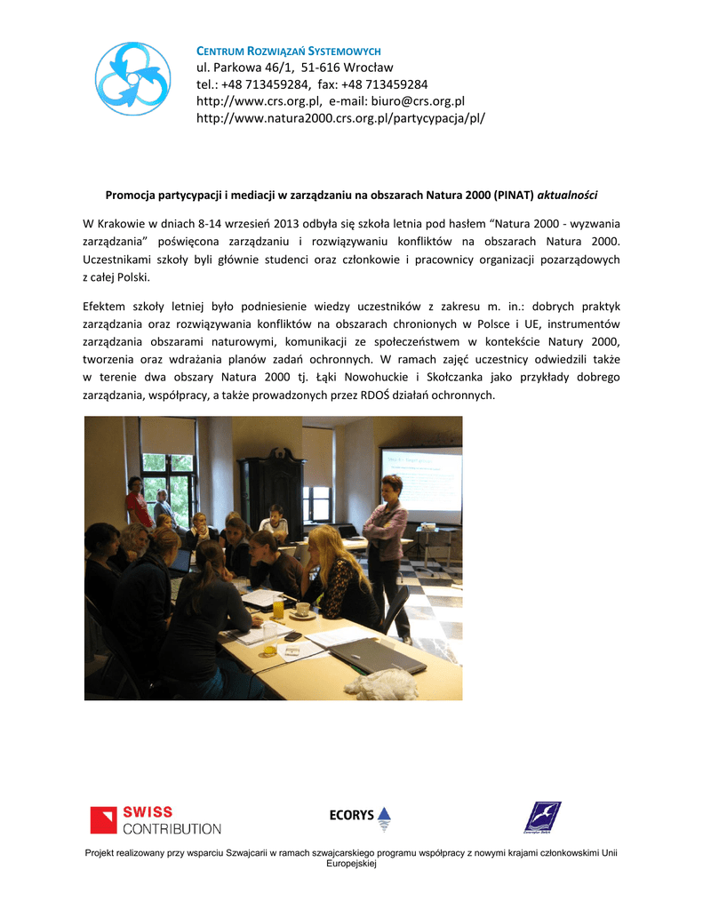CENTRUM ROZWIĄZAŃ SYSTEMOWYCH ul. Parkowa 46/1, 51-616 Wrocław tel.: +48 713459284, fax: +48 713459284 http://www.crs.org.pl, e-mail: [email protected] http://www.natura2000.crs.org.pl/partycypacja/pl/ Promocja partycypacji i mediacji w zarządzaniu na obszarach Natura 2000 (PINAT) aktualności W Krakowie w dniach 8-14 wrzesień 2013 odbyła się szkoła letnia pod hasłem “Natura 2000 - wyzwania zarządzania” poświęcona zarządzaniu i rozwiązywaniu konfliktów na obszarach Natura 2000. Uczestnikami szkoły byli głównie studenci oraz członkowie i pracownicy organizacji pozarządowych z całej Polski. Efektem szkoły letniej było podniesienie wiedzy uczestników z zakresu m. in.: dobrych praktyk zarządzania oraz rozwiązywania konfliktów na obszarach chronionych w Polsce i UE, instrumentów zarządzania obszarami naturowymi, komunikacji ze społeczeństwem w kontekście Natury 2000, tworzenia oraz wdrażania planów zadań ochronnych. W ramach zajęć uczestnicy odwiedzili także w terenie dwa obszary Natura 2000 tj. Łąki Nowohuckie i Skołczanka jako przykłady dobrego zarządzania, współpracy, a także prowadzonych przez RDOŚ działań ochronnych. Projekt realizowany przy wsparciu Szwajcarii w ramach szwajcarskiego programu współpracy z nowymi krajami członkowskimi Unii Europejskiej Szkoła letnia została zorganizowana w ramach projektu „Promocja partycypacji i mediacji w zarządzaniu środowiskiem na obszarach Natura 2000” (PINAT), który ma na celu wypracowanie oraz promocję mechanizmów partycypacji i rozwiązywania sporów wielostronnych na obszarach chronionych w ramach sieci Natura 2000. Projekt jest w całości finansowany przez Szwajcarię w ramach szwajcarskiego programu współpracy z nowymi krajami członkowskimi Unii Europejskiej. Naszymi partnerami w projekcie są: Oegut – Austrian Society for Technology and Environment, Dialogue Matters z Wielkiej Brytanii oraz Fundacja Dobrych Rozwiązań. Kolejnym i ostatnim już działaniem w projekcie będzie konferencja pod hasłem “Wyzwania zarządzania na obszarach Natura 2000 w Polsce”, która odbędzie się pod koniec listopada 2013 r. w Krakowie. Tematyka konferencji koncentrować się będzie wokół problemów związanych z zarządzaniem obszarami Natura 2000, a zwłaszcza konfliktami społecznymi, jakie pojawiają się w trakcie opracowywania np. planów zadań ochronnych. Głównym celem konferencji jest wymiana dobrych doświadczeń w powyższym zakresie oraz próba wypracowania metod i wskazówek wspomagających skuteczne zarządzanie obszarami Natura 2000. Projekt realizowany przy wsparciu Szwajcarii w ramach szwajcarskiego programu współpracy z nowymi krajami członkowskimi Unii Europejskiej