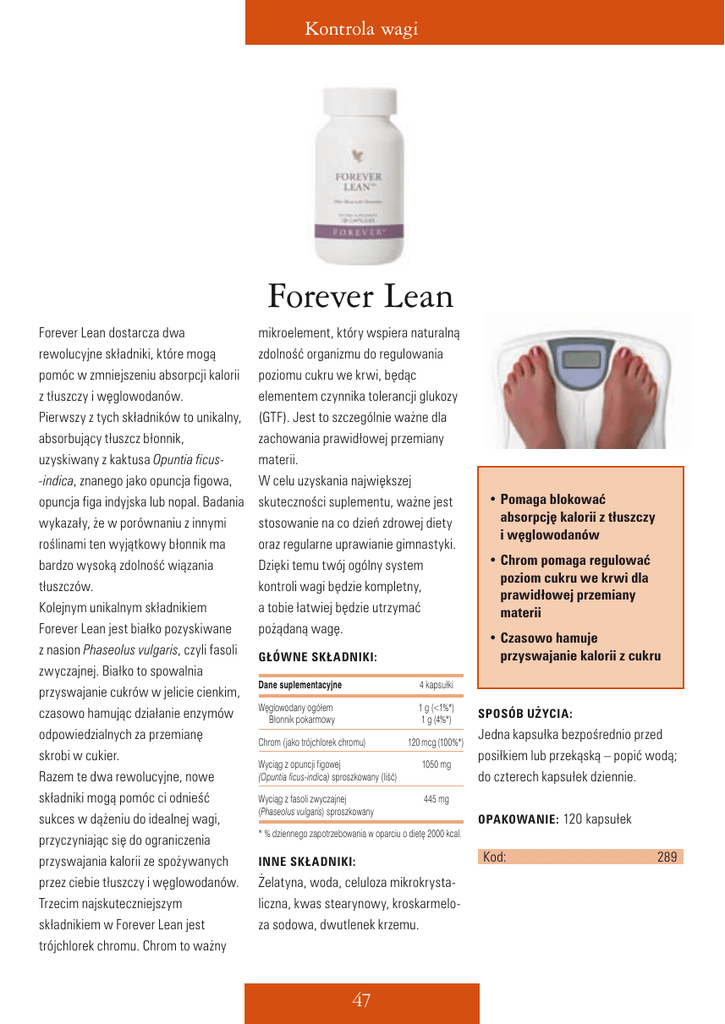 Kontrola wagi Forever Lean Forever Lean dostarcza dwa rewolucyjne składniki, które mogà pomóc w zmniejszeniu absorpcji kalorii z tłuszczy i w´glowodanów. Pierwszy z tych składników to unikalny, absorbujàcy tłuszcz błonnik, uzyskiwany z kaktusa Opuntia ficus-indica, znanego jako opuncja figowa, opuncja figa indyjska lub nopal. Badania wykazały, ˝e w porównaniu z innymi roÊlinami ten wyjàtkowy błonnik ma bardzo wysokà zdolnoÊç wiàzania tłuszczów. Kolejnym unikalnym składnikiem Forever Lean jest białko pozyskiwane z nasion Phaseolus vulgaris, czyli fasoli zwyczajnej. Białko to spowalnia przyswajanie cukrów w jelicie cienkim, czasowo hamujàc działanie enzymów odpowiedzialnych za przemian´ skrobi w cukier. Razem te dwa rewolucyjne, nowe składniki mogà pomóc ci odnieÊç sukces w dà˝eniu do idealnej wagi, przyczyniajàc si´ do ograniczenia przyswajania kalorii ze spo˝ywanych przez ciebie tłuszczy i w´glowodanów. Trzecim najskuteczniejszym składnikiem w Forever Lean jest trójchlorek chromu. Chrom to wa˝ny mikroelement, który wspiera naturalnà zdolnoÊç organizmu do regulowania poziomu cukru we krwi, b´dàc elementem czynnika tolerancji glukozy (GTF). Jest to szczególnie wa˝ne dla zachowania prawidłowej przemiany materii. W celu uzyskania najwi´kszej skutecznoÊci suplementu, wa˝ne jest stosowanie na co dzieƒ zdrowej diety oraz regularne uprawianie gimnastyki. Dzi´ki temu twój ogólny system kontroli wagi b´dzie kompletny, a tobie łatwiej b´dzie utrzymaç po˝àdanà wag´. G¸ÓWNE SK¸ADNIKI: Dane suplementacyjne 4 kapsułki W´glowodany ogółem Błonnik pokarmowy 1 g (<1%*) 1 g (4%*) Chrom (jako trójchlorek chromu) 120 mcg (100%*) Wyciàg z opuncji figowej (Opuntia ficus-indica) sproszkowany (liÊç) 1050 mg Wyciàg z fasoli zwyczajnej (Phaseolus vulgaris) sproszkowany 445 mg * % dziennego zapotrzebowania w oparciu o diet´ 2000 kcal. INNE SKŁADNIKI: ˚elatyna, woda, celuloza mikrokrystaliczna, kwas stearynowy, kroskarmeloza sodowa, dwutlenek krzemu. 47 • Pomaga blokowaç absorpcj´ kalorii z tłuszczy i w´glowodanów • Chrom pomaga regulowaç poziom cukru we krwi dla prawidłowej przemiany materii • Czasowo hamuje przyswajanie kalorii z cukru SPOSÓB U˚YCIA: Jedna kapsułka bezpoÊrednio przed posiłkiem lub przekàskà – popiç wodà; do czterech kapsułek dziennie. OPAKOWANIE: 120 kapsułek Kod: 289