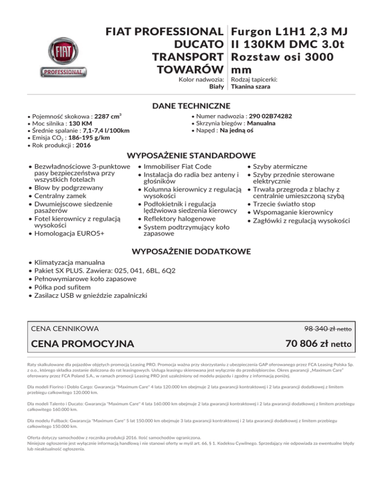FIAT PROFESSIONAL DUCATO TRANSPORT TOWARÓW Kolor nadwozia: Biały Furgon L1H1 2,3 MJ II 130KM DMC 3.0t Rozstaw osi 3000 mm Rodzaj tapicerki: Tkanina szara DANE TECHNICZNE 3 • Numer nadwozia : 290 02B74282 • Skrzynia biegów : Manualna • Napęd : Na jedną oś • Pojemność skokowa : 2287 cm • Moc silnika : 130 KM • Średnie spalanie : 7,1-7,4 l/100km • Emisja CO2 : 186-195 g/km • Rok produkcji : 2016 WYPOSAŻENIE STANDARDOWE • Bezwładnościowe 3-punktowe pasy bezpieczeństwa przy wszystkich fotelach • Blow by podgrzewany • Centralny zamek • Dwumiejscowe siedzenie pasażerów • Fotel kierownicy z regulacją wysokości • Homologacja EURO5+ • Immobiliser Fiat Code • Instalacja do radia bez anteny i głośników • Kolumna kierownicy z regulacją wysokości • Podłokietnik i regulacja lędźwiowa siedzenia kierowcy • Reflektory halogenowe • System podtrzymujący koło zapasowe • Szyby atermiczne • Szyby przednie sterowane elektrycznie • Trwała przegroda z blachy z centralnie umieszczoną szybą • Trzecie światło stop • Wspomaganie kierownicy • Zagłówki z regulacją wysokości WYPOSAŻENIE DODATKOWE • Klimatyzacja manualna • Pakiet SX PLUS. Zawiera: 025, 041, 6BL, 6Q2 • Pełnowymiarowe koło zapasowe • Półka pod sufitem • Zasilacz USB w gnieździe zapalniczki CENA CENNIKOWA CENA PROMOCYJNA 98 340 zł netto 70 806 zł netto Raty skalkulowane dla pojazdów objętych promocją Leasing PRO. Promocja ważna przy skorzystaniu z ubezpieczenia GAP oferowanego przez FCA Leasing Polska Sp. z o.o., którego składka zostanie doliczona do rat leasingowych. Usługa leasingu skierowana jest wyłącznie do przedsiębiorców. Okres gwarancji „Maximum Care” oferowany przez FCA Poland S.A., w ramach promocji Leasing PRO jest uzależniony od modelu pojazdu i zgodny z informacją poniżej. Dla modeli Fiorino i Doblo Cargo: Gwarancja "Maximum Care" 4 lata 120.000 km obejmuje 2 lata gwarancji kontraktowej i 2 lata gwarancji dodatkowej z limitem przebiegu całkowitego 120.000 km. Dla modeli Talento i Ducato: Gwarancja "Maximum Care" 4 lata 160.000 km obejmuje 2 lata gwarancji kontraktowej i 2 lata gwarancji dodatkowej z limitem przebiegu całkowitego 160.000 km. Dla modelu Fullback: Gwarancja "Maximum Care" 5 lat 150.000 km obejmuje 3 lata gwarancji kontraktowej i 2 lata gwarancji dodatkowej z limitem przebiegu całkowitego 150.000 km. Oferta dotyczy samochodów z rocznika produkcji 2016. Ilość samochodów ograniczona. Niniejsze ogłoszenie jest wyłącznie informacją handlową i nie stanowi oferty w myśl art. 66, § 1. Kodeksu Cywilnego. Sprzedający nie odpowiada za ewentualne błędy lub nieaktualność ogłoszenia.