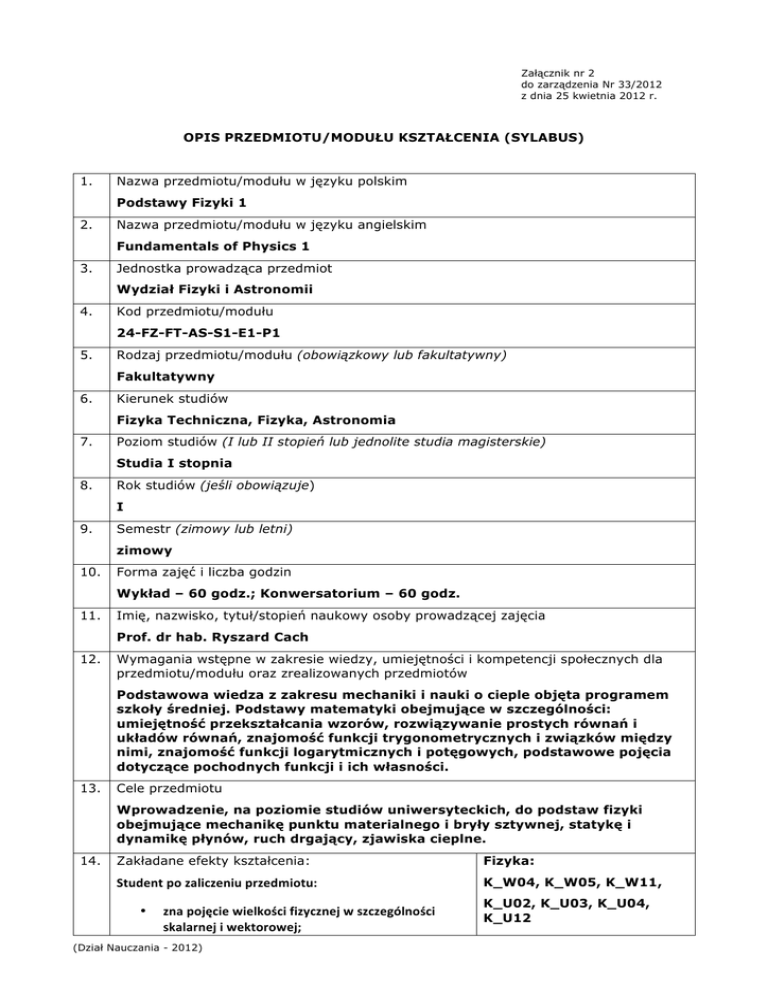 Załącznik nr 2 do zarządzenia Nr 33/2012 z dnia 25 kwietnia 2012 r. OPIS PRZEDMIOTU/MODUŁU KSZTAŁCENIA (SYLABUS) 1. Nazwa przedmiotu/modułu w języku polskim Podstawy Fizyki 1 2. Nazwa przedmiotu/modułu w języku angielskim Fundamentals of Physics 1 3. Jednostka prowadząca przedmiot Wydział Fizyki i Astronomii 4. Kod przedmiotu/modułu 24-FZ-FT-AS-S1-E1-P1 5. Rodzaj przedmiotu/modułu (obowiązkowy lub fakultatywny) Fakultatywny 6. Kierunek studiów Fizyka Techniczna, Fizyka, Astronomia 7. Poziom studiów (I lub II stopień lub jednolite studia magisterskie) Studia I stopnia 8. Rok studiów (jeśli obowiązuje) I 9. Semestr (zimowy lub letni) zimowy 10. Forma zajęć i liczba godzin Wykład – 60 godz.; Konwersatorium – 60 godz. 11. Imię, nazwisko, tytuł/stopień naukowy osoby prowadzącej zajęcia Prof. dr hab. Ryszard Cach 12. Wymagania wstępne w zakresie wiedzy, umiejętności i kompetencji społecznych dla przedmiotu/modułu oraz zrealizowanych przedmiotów Podstawowa wiedza z zakresu mechaniki i nauki o cieple objęta programem szkoły średniej. Podstawy matematyki obejmujące w szczególności: umiejętność przekształcania wzorów, rozwiązywanie prostych równań i układów równań, znajomość funkcji trygonometrycznych i związków między nimi, znajomość funkcji logarytmicznych i potęgowych, podstawowe pojęcia dotyczące pochodnych funkcji i ich własności. 13. Cele przedmiotu Wprowadzenie, na poziomie studiów uniwersyteckich, do podstaw fizyki obejmujące mechanikę punktu materialnego i bryły sztywnej, statykę i dynamikę płynów, ruch drgający, zjawiska cieplne. 14. Zakładane efekty kształcenia: Fizyka: Student po zaliczeniu przedmiotu: K_W04, K_W05, K_W11, • zna pojęcie wielkości fizycznej w szczególności skalarnej i wektorowej; (Dział Nauczania - 2012) K_U02, K_U03, K_U04, K_U12 • • • • • • • • • • • • • • • • • • potrafi wykonać podstawowe operacje na wektorach i wykorzystać je w rozwiązywaniu problemów fizycznych; potrafi zdefiniować wielkości stosowane w opisie ruchu ( tor, droga, prędkość średnia i chwilowa, przyspieszenie średnie i chwilowe) oraz zna relacje miedzy nimi; potrafi opisywać i analizować ruch po prostej, oraz ruchy złożone na płaszczyźnie i w przestrzeni trójwymiarowej; potrafi sformułować prawa dynamiki Newtona i zna ograniczenia w ich stosowalności; potrafi wykorzystać prawa dynamiki do analizy skutków działania sił (sytuacje statyczne i dynamiczne); zna właściwości sił tarcia i potrafi je wykorzystać do analizy konkretnych przypadków; potrafi analizować sytuacje fizyczne w inercjalnych i nieinercjalnych układach odniesienia; zna definicje pracy, mocy, energii kinetycznej, energii potencjalnej i relacje pomiędzy nimi; zna prawo zachowania energii mechanicznej i potrafi je stosować w typowych sytuacjach; rozróżnia siły zachowawcze i niezachowawcze; potrafi zdefiniować pęd, sformułować zasadę zachowania pędu i stosować ją do analizy zjawisk fizycznych w szczególności zderzeń; zna definicje bryły sztywnej i środka masy oraz prawa rządzące jego ruchem; potrafi zdefiniować moment bezwładności, moment siły i moment pędu oraz sformułować i wykorzystać prawa rządzące statyką i dynamiką bryły sztywnej; potrafi sformułować prawo powszechnego ciążenia i omówić własności siły grawitacji; zna Prawa Keplera, rozumie pojęcie pola grawitacyjnego i zna jego opis, potrafi analizować ruch ciała w jednorodnym i radialnym polu grawitacyjnym; potrafi opisać ruch ciała pod wpływem siły harmonicznej; potrafi wytłumaczyć zjawisko rezonansu mechanicznego i dać jego przykłady; zna podstawy statyki i dynamiki płynów – prawo Archimedesa, prawo ciągłości strugi, prawo Bernoulliego; potrafi opisać i wytłumaczyć zjawiska zachodzące w płynach; rozumie na czym polega równowaga cieplna, czym jest temperatura i jak jest mierzona; rozróżnia pojęcia ciepła i temperatury; zna mechanizmy przewodnictwa ciepła i ich opis; zna podstawowe właściwości cieplne ciał w szczególności przemiany cieplne gazów; (Dział Nauczania – 2012) K_K01, K_K03 Fizyka techniczna: K_W04, K_W05, K_W11, K_U02, K_U03, K_U04, K_U12, K_K01, K_K03 Astronomia K1_W04, K1_W05, K1_U03, K1_U04, K1_K01, K1_K02 2 • • • • 15. zna model gazu doskonałego i jego opis; potrafi sformułować I zasadę termodynamiki, obliczyć pracę wykonywaną przez układ termodynamiczny w podstawowych procesach termodynamicznych gazu doskonałego; zna II zasadę termodynamiki i jej konsekwencje; potrafi stosować odpowiednie narzędzia matematyczne do opisu i analizy problemów fizycznych objętych programem wykładu. Treści programowe Wielkości fizyczne i ich charakter; wielkości wektorowe i podstawowe operacje na wektorach; opis ruchu po prostej, na płaszczyźnie i w przestrzeni; zasady dynamiki i ich zastosowanie do analizy ruchu; inercjalne i nieinercjalne układy odniesienia; siły bezwładności; praca, energia kinetyczna i potencjalna, zasada zachowania energii mechanicznej i jej stosowanie; zasada zachowania pędu; zderzenia i ich analiza; dynamika bryły sztywnej; zasada zachowania momentu pędu i jej zastosowania; prawo grawitacji; prawa Keplera; ruch satelitów; pole grawitacyjne; ruch harmoniczny prosty; drgania tłumione i wymuszone -‐ rezonans mechaniczny; składanie drgań; statyka i dynamika płynów; temperatura i ciepło; transport ciepła; gaz doskonały i jego model; przemiany gazowe; I i II zasada termodynamiki. 16. Zalecana literatura (podręczniki) 1. Hugh D. Young, Roger A. Freedman University Physics Pearson International Edition. 2. D. Halliday R. Resnick, J. Walker, Fizyka, tom I. PWN, Warszawa 1994. 3. Kittel, W.D. Knight, M. Ruderman, Mechanika, PWN, Warszawa 1969. 4. A.K. Wróblewski, J. Zakrzewski, Wstęp do fizyki, tom I, PWN, Warszawa 1991. 5. I.W. Sawielew, Kurs fizyki, PWN, Warszawa 1994. 17. Forma zaliczenia poszc