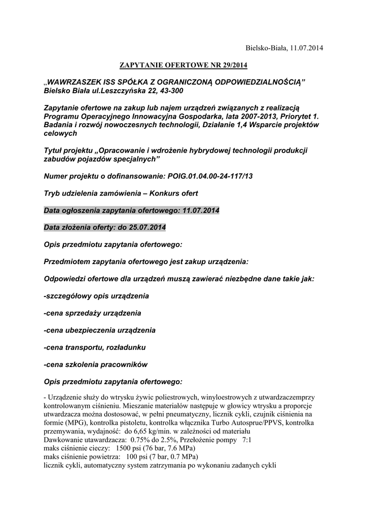 Bielsko-Biała, 11.07.2014 ZAPYTANIE OFERTOWE NR 29/2014 „WAWRZASZEK ISS SPÓŁKA Z OGRANICZONĄ ODPOWIEDZIALNOŚCIĄ” Bielsko Biała ul.Leszczyńska 22, 43-300 Zapytanie ofertowe na zakup lub najem urządzeń związanych z realizacją Programu Operacyjnego Innowacyjna Gospodarka, lata 2007-2013, Priorytet 1. Badania i rozwój nowoczesnych technologii, Działanie 1,4 Wsparcie projektów celowych Tytuł projektu „Opracowanie i wdrożenie hybrydowej technologii produkcji zabudów pojazdów specjalnych” Numer projektu o dofinansowanie: POIG.01.04.00-24-117/13 Tryb udzielenia zamówienia – Konkurs ofert Data ogłoszenia zapytania ofertowego: 11.07.2014 Data złożenia oferty: do 25.07.2014 Opis przedmiotu zapytania ofertowego: Przedmiotem zapytania ofertowego jest zakup urządzenia: Odpowiedzi ofertowe dla urządzeń muszą zawierać niezbędne dane takie jak: -szczegółowy opis urządzenia -cena sprzedaży urządzenia -cena ubezpieczenia urządzenia -cena transportu, rozładunku -cena szkolenia pracowników Opis przedmiotu zapytania ofertowego: - Urządzenie służy do wtrysku żywic poliestrowych, winyloestrowych z utwardzaczemprzy kontrolowanym ciśnieniu. Mieszanie materiałów następuje w głowicy wtrysku a proporcje utwardzacza można dostosować, w pełni pneumatyczny, licznik cykli, czujnik ciśnienia na formie (MPG), kontrolka pistoletu, kontrolka włącznika Turbo Autosprue/PPVS, kontrolka przemywania, wydajność: do 6,65 kg/min. w zależności od materiału Dawkowanie utawardzacza: 0.75% do 2.5%, Przełożenie pompy 7:1 maks ciśnienie cieczy: 1500 psi (76 bar, 7.6 MPa) maks ciśnienie powietrza: 100 psi (7 bar, 0.7 MPa) licznik cykli, automatyczny system zatrzymania po wykonaniu zadanych cykli Recyrkulacja żywicy i utwardzacza, czujnik ciśnienia wtrysku MPG na głowicy (ustawialny; można ustawić zadane ciśnienie wtrysku), zabezpieczenie przed zbyt wysokim ciśnieniem utwardzacza, sygnalizacja dźwiękowa informująca o potrzebie umycia głowicy