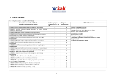 1. Praktyki zawodowe 9.1. Praktyki zawodowe w urzędzie administracji Uszczegółowione efekty kształcenia Uczeń po zrealizowaniu zajęć potrafi: A.68.1(3)1. Identyfikować zadania naczelnych organów administracji A.68.1(3)2. Odróżnić zadania organów naczelnych od zadań organów centralnych administracji A.68.1(3)3. Wyznaczać pozycję wójta, burmistrza, prezydenta A.68.1(3)4. Identyfikować zadania organów uchwałodawczych samorządu terytorialnego na szczeblu powiatu i województwa A.68.1(3)5. Identyfikować zadania organów wykonawczych samorządu terytorialnego A.68.1(3)6. Wyznaczyć organy nadzoru nad samorządem terytorialnym A.68.1(3)7. Określić zadania organów nadzoru nad samorządem terytorialnym A.68.1(3)8. Identyfikować zadania organów administracji zespolonej j w województwie A.68.1(3)9. Wyznaczać zadania administracji niezespolonej w województwie A.68.1(3)10. Analizować zadania wojewody jako przedstawiciela rządu w terenie oraz zwierzchnika administracji zespolonej A.68.1(3)11. Wyjaśnić stosunek wojewody do organów administracji niezespolonej A.68.1(4)1. Analizować i interpretować podstawowe akty prawne A.68.1(4)2. Identyfikować akty wewnętrzne administracji A.68.1(4)3. Posługiwać się aktami zewnętrznymi podczas wykonywania pracy w organach administracji A.68.1(4)4. Odróżnić akty wewnętrzne od aktów zewnętrznych Poziom wymagań programowych (P lub PP) P Kategoria taksonomiczna B P C P C P B P B P B P B P C P C P C P C P C P B P B P B A.68.1(4)5. Stosować przepisy o ochronie danych osobowych P B A.68.1(4)6. Rozróżnić instrukcje, regulaminy, statuty P B 1 Materiał kształcenia Rodzaje organów administracji Zadania organów administracji Organy nadzoru nad samorządem terytorialnym Rodzaje aktów administracyjnych Decyzja administracyjna Postanowienie i ugoda. Wszczęcie postępowania administracyjnego Zawieszenie i umorzenie postępowania administracyjnego Skargi i wnioski Struktura i zakres działania sądów A.68.2(8)1. sporządzić zawiadomienie o wszczęciu postępowania; A.68.2(8)2. sporządzić wezwanie do udziału w czynnościach procesowych i złożenia wyjaśnień; A.68.2(8)3. sporządzić protokoły i adnotacje; A.68.2(8)4. dokonać analizy przykładowej decyzji administracyjnej pod kątem jej treści; A.68.2(8)5. sporządzić postanowienie o zawieszeniu postępowania; A.68.2(8)6. sporządzić decyzję o umorzeniu postępowania; A.68.2(9)1. ustalić elementy konieczne dla decyzji administracyjnej; A.68.2(9)2. opracować projekt postanowienia i decyzji administracyjnej na każdym etapie sprawy; A.68.2(9)3. sklasyfikować wady decyzji administracyjnej; P C P C P C P D P C P C P B P C P C A.68.2(9)4. ocenić prawidłowość decyzji administracyjnej; P C A.68.2(9)5.określić warunki stwierdzenia nieważności decyzji; P B A.68.2(13)1. określić strukturę i zakres działania sądów administracyjnych; P C A.68.2(13)2. sporządzić projekt skargi; P C A.68.2(13)3. ustalić sposób rozpatrzenia skargi lub wniosku; P B A.68.2(13)4. uzasadnić w logiczny sposób rozpatrzenie przykładowej skargi P C lub wniosku; Planowane zadania: Sporządzenie odwołania od decyzji administracyjnej wydanej przez organ I instancji w określonej sprawie. Praca powinna być wykonana indywidualnie i przedstawiona do oceny. Warunki osiągania efektów kształcenia w tym środki dydaktyczne, metody, formy organizacyjne Zajęcia edukacyjne mogą być prowadzone w urzędach administracji publicznej. Środki dydaktyczne Zestawy ćwiczeń, instrukcje do ćwiczeń, ustawy, przykładowe decyzje administracyjne, skargi, wzory dokumentów, gazety i czasopisma branżowe, prawnicze programy komputerowe. Zalecane metody dydaktyczne Zaleca się stosować metody ćwiczeń, które to kształtują kompetencje do wykonywania zadań zawodowych pracownika administracji takie jak: umiejętność korzystania z przepisów prawa, samodzielne rozwiązywanie problemów, sporządzanie dokumentów. Formy organizacyjne Zajęcia powinny być prowadzone z wykorzystaniem zróżnicowanych form: indywidualnie lub grupowo. Propozycje kryteriów oceny i metod sprawdzania efektów kształcenia 2 Uczniowie powinni obserwować czynności zawodowe pracowników urzędu administracji, wykonywać zadania zawodowe pod kierunkiem opiekuna praktyk/ instruktora a następnie samodzielnie realizować powierzone czynności. Sprawdzanie efektów kształcenia będzie przeprowadzone na podstawie obserwacji pracy ucznia i oceny sporządzonej dokumentacji. W ocenie należy uwzględnić następujące kryteria ogólne: zawartość merytoryczna (poprawność wykonywanych zadań, stosowanie się do poleceń przełożonych, przestrzeganie zasad ochrony danych w jednostce organizacyjnej), wydruk dokumentacji (układ, bezbłędny edycyjnie ,poprawność sporządzonego pisma). Formy indywidualizacji pracy uczniów uwzględniające: – dostosowanie warunków, środków, metod i form kształcenia do potrzeb ucznia, – dostosowanie warunków, środków, metod i form kształcenia do możliwości ucznia. 3 9.2. Praktyki zawodowe w przedsiębiorstwie Uszczegółowione efekty kształcenia Uczeń po zrealizowaniu zajęć potrafi: A.68.1(7)1. Identyfikować źródła prawa Poziom wymagań programowych (P lub PP) P Kategoria taksonomiczna B A.68.1(7)2. Wymienić źródła prawa według Konstytucji P A A.68.1(7)3. Wyodrębnić źródła prawa lokalnego P B P B P B A.68.1(7)4. Odróżnić prawo stanowione od prawa naturalnego i zwyczajowego A.68.1(7)5. Wyznaczyć elementy normy prawnej na podstawie wybranych przepisów prawnych A.68.1(7)6. Wyszczególnić podstawowe elementy stosunku prawnego A.68.1(7)7. Rozróżnić rodzaje zdarzeń prawnych A.68.1(7)8. Wskazać cechy charakterystyczne dla poszczególnych gałęzi prawa A.68.1(7)9. Wyznaczyć etapy stosowania prawa P C P B P B P C A.68.1(7)10. Wyjaśnić potrzebę stosowania wykładni prawa P C A.68.1(7)11. Wyszukiwać informacje z różnych źródeł prawa P B P B A.68