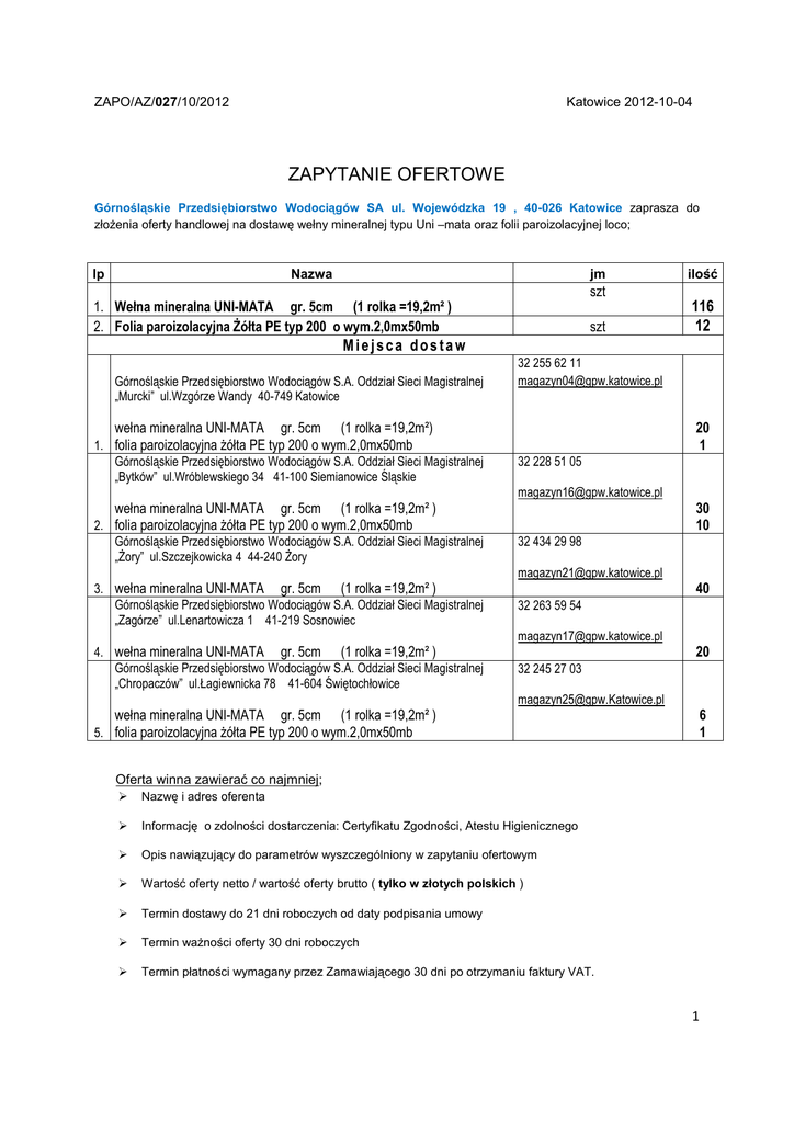 ZAPO/AZ/027/10/2012 Katowice 2012-10-04 ZAPYTANIE OFERTOWE Górnośląskie Przedsiębiorstwo Wodociągów SA ul. Wojewódzka 19 , 40-026 Katowice zaprasza do złoŜenia oferty handlowej na dostawę wełny mineralnej typu Uni –mata oraz folii paroizolacyjnej loco; lp Nazwa jm ilość szt 1. Wełna mineralna UNI-MATA gr. 5cm (1 rolka =19,2m² ) 2. Folia paroizolacyjna śółta PE typ 200 o wym.2,0mx50mb szt 116 12 Miejsca dostaw Górnośląskie Przedsiębiorstwo Wodociągów S.A. Oddział Sieci Magistralnej „Murcki” ul.Wzgórze Wandy 40-749 Katowice wełna mineralna UNI-MATA gr. 5cm 32 255 62 11 [email protected] (1 rolka =19,2m²) 1. folia paroizolacyjna Ŝółta PE typ 200 o wym.2,0mx50mb Górnośląskie Przedsiębiorstwo Wodociągów S.A. Oddział Sieci Magistralnej „Bytków” ul.Wróblewskiego 34 41-100 Siemianowice Śląskie 20 1 32 228 51 05 [email protected] wełna mineralna UNI-MATA gr. 5cm (1 rolka =19,2m² ) 2. folia paroizolacyjna Ŝółta PE typ 200 o wym.2,0mx50mb Górnośląskie Przedsiębiorstwo Wodociągów S.A. Oddział Sieci Magistralnej „śory” ul.Szczejkowicka 4 44-240 śory 30 10 32 434 29 98 [email protected] (1 rolka =19,2m² ) 3. wełna mineralna UNI-MATA gr. 5cm Górnośląskie Przedsiębiorstwo Wodociągów S.A. Oddział Sieci Magistralnej „Zagórze” ul.Lenartowicza 1 41-219 Sosnowiec 40 32 263 59 54 [email protected] (1 rolka =19,2m² ) 4. wełna mineralna UNI-MATA gr. 5cm Górnośląskie Przedsiębiorstwo Wodociągów S.A. Oddział Sieci Magistralnej „Chropaczów” ul.Łagiewnicka 78 41-604 Świętochłowice 20 32 245 27 03 [email protected] wełna mineralna UNI-MATA gr. 5cm (1 rolka =19,2m² ) 5. folia paroizolacyjna Ŝółta PE typ 200 o wym.2,0mx50mb 6 1 Oferta winna zawierać co najmniej; Nazwę i adres oferenta Informację o zdolności dostarczenia: Certyfikatu Zgodności, Atestu Higienicznego Opis nawiązujący do parametrów wyszczególniony w zapytaniu ofertowym Wartość oferty netto / wartość oferty brutto ( tylko w złotych polskich ) Termin dostawy do 21 dni roboczych od daty podpisania umowy Termin waŜności oferty 30 dni roboczych Termin płatności wymagany przez Zamawiającego 30 dni po otrzymaniu faktury VAT. 1 Oferta winna być sporządzona na papierze firmowym oferenta lub opatrzona pieczątką firmową, posiadać datę jej sporządzenia oraz powinna być podpisana. Do oferty naleŜy dołączyć; parafowany wzór umowy Wymagane: Certyfikat Zgodności, Atest Higieniczny Oświadczenie następującej treści – Zapoznaliśmy się ze wszystkimi warunkami podanymi w niniejszym Zapytaniu Ofertowym, ze wzorem umowy i przyjmujemy je bez zastrzeŜeń. W razie wygrania postępowania ZOBOWIĄZUJEMY się podpisać umowę w terminie zaproponowanym przez Zamawiającego, o treści zgodnej z załączonym wzorem. Ofertę naleŜy dostarczyć na adres; Górnośląskie Przedsiębiorstwo Wodociągów SA ul. Wojewódzka 19 40-026 Katowice Wydział Zaopatrzenia pokój 35B Termin złoŜenia ofert upływa w dniu: 16.10.2012 Oferty moŜna dostarczyć ; 1. Za pośrednictwem poczty (kurierem ) 2. Telefaksem – 032 60 38 631 - jeŜeli oferta liczyć będzie w całości nie więcej jak 10 stron 3. Osobiście Informacji technicznych udziela Pan Andrzej Skrzypczyk tel. kontaktowy: 32 60 38 788 Informacji dotyczących realizacji zamówienia udziela Pani Małgorzata Stachowiecka –telefon: 32 60 38 635 lub Pan Tomasz Gnieliński- telefon: 32 60 38 640 Zamawiający nie będzie rozpatrywał ofert alternatywnych, niezgodnych z przedmiotem zapytania ofertowego. Wybór oferty nastąpi w oparciu o kryterium ceny – waga 100% Zastrzegamy sobie prawo do nie skorzystania z Ŝadnej ze złoŜonych ofert, bez podania przyczyny jak równieŜ nie powiadamiania pisemnie oferentów o wyniku postępowania. 2 Wzór umowy do ZAPO/AZ/027/10/2012 U M O W A nr AZ/ /10/2012 zawarta w dniu ................ .2012 roku w Katowicach pomiędzy: Górnośląskim Przedsiębiorstwem Wodociągów Spółka Akcyjna ul. Wojewódzka 19, 40 – 026 Katowice zarejestrowanym w Sądzie Rejonowym Katowice - Wschód, Wydział VIII Gospodarczy Krajowego Rejestru Sądowego pod numerem 0000247533, NIP 634 012 87 88, będącym podatnikiem VAT czynnym, wysokość kapitału zakładowego - 608 393 000 zł – wpłacono w całości zwanym dalej "Zamawiającym", które reprezentuje: 1……………………………………………………………………………………………………….. 2……………………………………………………………………………………………………….. a ………………………………………………………………………………………………………… który reprezentuje: 1…………………………………………………………………………………………………………. o następującej treści: §1 W wyniku postępowania o udzielenie zamówienia prowadzonego na podstawie Wewnętrznego Regulaminu Przetargowego Górnośląskiego Przedsiębiorstwa Wodociągów Spółka Akcyjna w trybie Zapytania Ofertowego nr ZAPO/AZ/027/10/2012, zakończonego wyborem złoŜonej przez Wykonawcę oferty, Wykonawca zobowiązuje się do dostawy : lp Nazwa jm ilość szt 1. Wełna mineralna UNI-MATA gr. 5cm (1 rolka =19,2m² ) 2. Folia paroizolacyjna śółta PE typ 200 o wym.2,0mx50mb szt 116 12 Miejsca dostaw Górnośląskie Przedsiębiorstwo Wodociągów S.A. Oddział Sieci Magistralnej „Murcki” ul.Wzgórze Wandy 40-749 Katowice 32 255 62 11 [email protected] Janina Wózik wełna mineralna UNI-MATA gr. 5cm (1 rolka =19,2m²) 1. folia paroizolacyjna Ŝółta PE typ 200 o wym.2,0mx50mb 20 1 Górnośląskie Przedsiębiorstwo Wodociągów S.A. Oddział Sieci Magistralnej „Bytków” ul.Wróblewskiego 34 41-100 Siemianowice Śląskie 32 228 51 05 [email protected] wełna mineralna UNI-MATA Aniela Gmyrek gr. 5cm (1 rolka =19,2m² ) 2. folia paroizolacyjna Ŝółta PE typ 200 o wym.2,0mx50mb Górnośląskie Pr