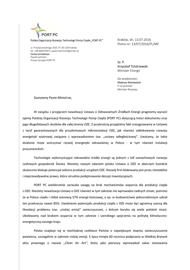 Polska Organizacja Rozwoju Technologii Pomp Ciepła „PORT PC” ul. Przybyszewskiego 29/5, PL 30-128 Kraków tel. +48 664979972, [email protected] Osoba kontaktowa Paweł Lachman Prezes Zarządu PORT PC Kraków, dn. 13.07.2016 Pismo nr: 13/07/2016/PL/ME Sz. P. Krzysztof Tchórzewski Minister Energii Do wiadomości: Szanowny Panie Ministrze, Mateusz Morawiecki V-ce premier Minister Rozwoju W związku z przyjęciem nowelizacji Ustawy o Odnawialnych Źródłach Energii pragniemy wyrazić opinię Polskiej Organizacji Rozwoju Technologii Pomp Ciepła (PORT PC) dotyczącą treści dokumentu oraz jego długofalowych skutków dla całej branży OZE. Z przykrością przyjęliśmy fakt zrezygnowania w Ustawie z taryf gwarantowanych dla przydomowych mikroinstalacji OZE, jak również zablokowanie rozwoju energetyki wiatrowej związane z wprowadzeniem tzw. „ustawy odległościowej”. Uważamy, że takie działanie może wstrzymać rozwój energetyki odnawialnej w Polsce - w tym również instalacji prosumenckich. Technologie wykorzystujące odnawialne źródła energii są jednym z kół zamachowych rozwoju czołowych gospodarek Świata. Niestety naszym zdaniem polska Ustawa o OZE w obecnym kształcie skutecznie blokuje potencjał sektora produkcji urządzeń OZE. Rozwój firm blokowany jest przez niestabilne i nieprzewidywalne prawo, które utrudnia podejmowanie decyzji inwestycyjnych. PORT PC wielokrotnie zwracała uwagę na brak mechanizmów wsparcia dla produkcji ciepła z OZE. Niestety nowelizacja Ustawy o OZE również w tym zakresie nie wprowadza żadnych zmian, pomimo że w Polsce ciepło i chłód stanowią 57% energii końcowej, a np. w budownictwie jednorodzinnym udział ten przekracza nawet 85%. Uwolnienie potencjału produkcji ciepła z OZE może być ogromną szansą dla likwidacji problemu tzw. „niskiej emisji” zanieczyszczeń, z którym boryka się wiele polskich miast. Ubolewamy nad brakiem wsparcia w tym zakresie i szerokiego spojrzenia na politykę klimatycznoenergetyczną naszego kraju. Polska znajduje się w niechlubnej czołówce Państw o największym stopniu zanieczyszczenia powietrza, szczególnie w zakresie niskiej emisji. 5 lipca minęła 60 rocznica podpisania w Wielkiej Brytanii aktu prawnego o nazwie „Clean Air Act”, który jako pierwszy wprowadzał zakaz stosowania w miastach kotłów emitujących zanieczyszczenia pyłowe. Problem tzw. „niskiej emisji” spowodowany jest głównie spalaniem w przydomowych kotłowniach paliw kopalnych, w szczególności węgla. Według szacunków WHO z 2015r. w wyniku złej jakości powietrza co roku w Polsce przedwcześnie umiera ponad 45 000 Polaków, koszty społeczne sięgają kilkuset miliardów złotych rocznie. Jednym ze skutecznych i trwałych sposobów likwidacji problemu jest zamiana kotłów węglowych na mikroinstalacje OZE produkujące ciepło - takie jak pompy ciepła (które korzystają z energii wyprodukowanej tylko i wyłącznie w Polsce). Dobrym przykładem jest tutaj chiński rząd, który poprzez program rządowy wspiera produkcję i zastosowanie pomp ciepła w walce z zanieczyszczeniem powietrza w chińskich miastach. Innym przykładem najlepszych praktyk są systemowe rozwiązania wprowadzone w USA, gdzie w roku 2009 wprowadzono Plan Baracka Obamy o nazwie „Clean Energy Plan”. Już po 7 latach widać sukces Planu, który łączy w sobie aktywną politykę energetyczną ze wzrostem sektorów gospodarczych związanych z energetyką. Skutkiem promowania wykorzystania odnawialnych źródeł energii jest pozycja USA jako jednego z liderów energetyki wiatrowej i słonecznej na Świecie. Zdaniem PORT PC konieczne jest opracowanie kompleksowej strategii rozwoju energetyki w Polsce uwzględniającej wzrost udziału odnawialnych źródeł energii w ogólnym miksie energetycznym kraju, ze szczególnym uwzględnieniem kwestii likwidacji „niskiej emisji” zanieczyszczeń powietrza. Uważamy, że dalsze ograniczanie rozwoju OZE w Polsce wynikające z przyjętych w ostatnim czasie aktów prawnych przyczyni się do brzemiennych w skutkach dysproporcji w stosunku do gospodarek krajów wysokorozwiniętych. Stabilny i sprawiedliwy społecznie system wsparcia dla produkcji energii ze źródeł odnawialnych może stać się motorem napędowym rozwoju polskiej gospodarki. Nowelizacja Ustawy o OZE to kolejny krok do zmian w systemie energetycznym Polski. PORT PC wyraża nadzieję, że następnym będzie opracowanie spójnej strategii w oparciu o obserwacje trendów i doświadczeń czołowych gospodarek Świata. „Polityka Energetyczna Polski do roku 2030” powinna być odpowiedzią na wyzwania przed jakimi staną następne pokolenia, a jej opracowanie naszym zdaniem wymaga dyskusji ponad podziałami politycznymi. W imieniu Polskiej Organizacji Rozwoju Technologii Pomp Ciepła Paweł Lachman Prezes Zarządu