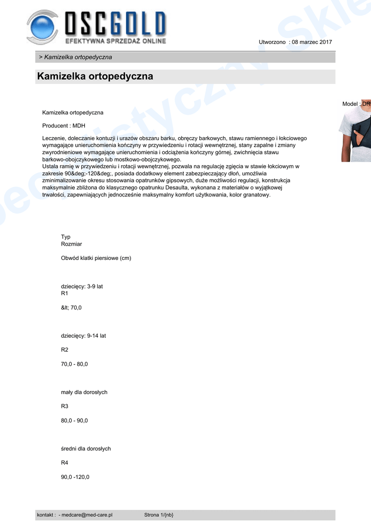 e p S y e l k Utworzono : 08 marzec 2017 n z > Kamizelka ortopedyczna Kamizelka ortopedyczna Kamizelka ortopedyczna c y t s i l a Producent : MDH Leczenie, doleczanie kontuzji i urazów obszaru barku, obręczy barkowych, stawu ramiennego i łokciowego wymagające unieruchomienia kończyny w przywiedzeniu i rotacji wewnętrznej, stany zapalne i zmiany zwyrodnieniowe wymagające unieruchomienia i odciążenia kończyny górnej, zwichnięcia stawu barkowo-obojczykowego lub mostkowo-obojczykowego. Ustala ramię w przywiedzeniu i rotacji wewnętrznej, pozwala na regulację zgięcia w stawie łokciowym w zakresie 90°-120°, posiada dodatkowy element zabezpieczający dłoń, umożliwia zminimalizowanie okresu stosowania opatrunków gipsowych, duże możliwości regulacji, konstrukcja maksymalnie zbliżona do klasycznego opatrunku Desaulta, wykonana z materiałów o wyjątkowej trwałości, zapewniających jednocześnie maksymalny komfort użytkowania, kolor granatowy. j c Typ Rozmiar Obwód klatki piersiowe (cm) dziecięcy: 3-9 lat R1 < 70,0 dziecięcy: 9-14 lat R2 70,0 - 80,0 mały dla dorosłych R3 80,0 - 90,0 średni dla dorosłych R4 90,0 -120,0 kontakt : - [email protected] Strona 1/{nb} Model : DRQ e p S y e l k Utworzono : 08 marzec 2017 n z > Kamizelka ortopedyczna Kamizelka ortopedyczna c y t s i l a duży dla dorosłych R5 120,0 < j c Cena : 250,00 zł Brutto ( 231,48 zł Netto) Dostępne opcje Kamizelka ortopedyczna : Rozmiar R1, R2, R3, R4, R5. Dostępność: Produkt dostępny w naszym sklepie od 21 październik 2008 kontakt : - [email protected] Strona 2/{nb}