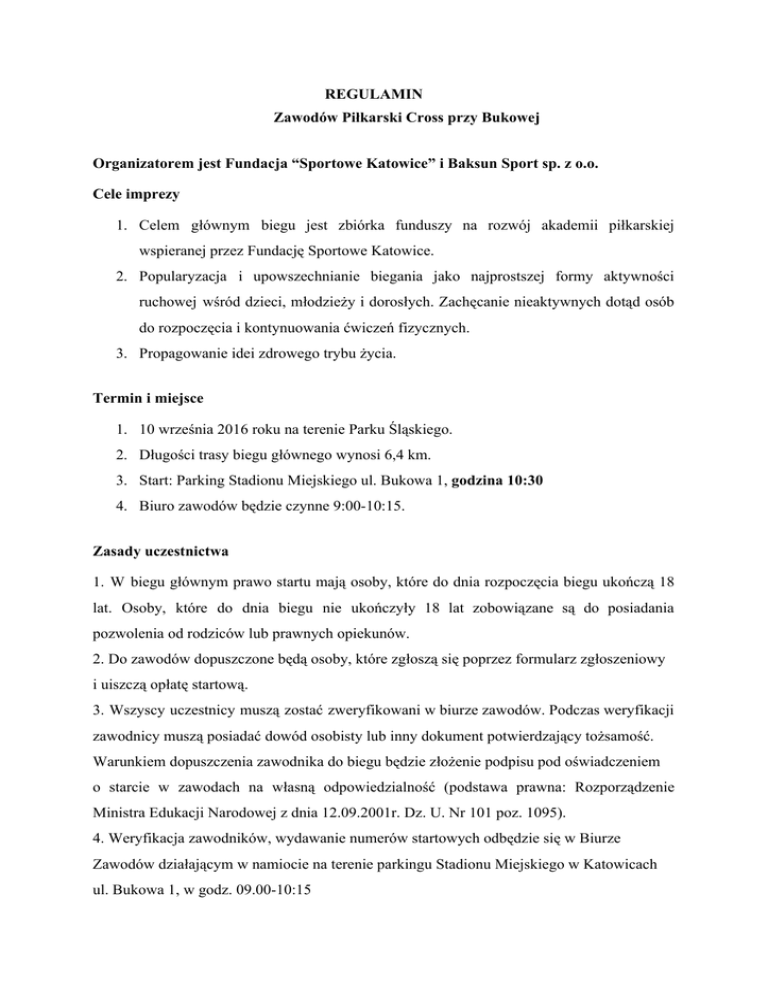 REGULAMIN Zawodów Piłkarski Cross przy Bukowej Organizatorem jest Fundacja “Sportowe Katowice” i Baksun Sport sp. z o.o. Cele imprezy 1. Celem głównym biegu jest zbiórka funduszy na rozwój akademii piłkarskiej wspieranej przez Fundację Sportowe Katowice. 2. Popularyzacja i upowszechnianie biegania jako najprostszej formy aktywności ruchowej wśród dzieci, młodzieży i dorosłych. Zachęcanie nieaktywnych dotąd osób do rozpoczęcia i kontynuowania ćwiczeń fizycznych. 3. Propagowanie idei zdrowego trybu życia. Termin i miejsce 1. 10 września 2016 roku na terenie Parku Śląskiego. 2. Długości trasy biegu głównego wynosi 6,4 km. 3. Start: Parking Stadionu Miejskiego ul. Bukowa 1, godzina 10:30 4. Biuro zawodów będzie czynne 9:0010:15. Zasady uczestnictwa 1. W biegu głównym prawo startu mają osoby, które do dnia rozpoczęcia biegu ukończą 18 lat. Osoby, które do dnia biegu nie ukończyły 18 lat zobowiązane są do posiadania pozwolenia od rodziców lub prawnych opiekunów. 2. Do zawodów dopuszczone będą osoby, które zgłoszą się poprzez formularz zgłoszeniowy i uiszczą opłatę startową. 3. Wszyscy uczestnicy muszą zostać zweryfikowani w biurze zawodów. Podczas weryfikacji zawodnicy muszą posiadać dowód osobisty lub inny dokument potwierdzający tożsamość. Warunkiem dopuszczenia zawodnika do biegu będzie złożenie podpisu pod oświadczeniem o starcie w zawodach na własną odpowiedzialność (podstawa prawna: Rozporządzenie Ministra Edukacji Narodowej z dnia 12.09.2001r. Dz. U. Nr 101 poz. 1095). 4. Weryfikacja zawodników, wydawanie numerów startowych odbędzie się w Biurze Zawodów działającym w namiocie na terenie parkingu Stadionu Miejskiego w Katowicach ul. Bukowa 1, w godz. 09.0010:15 5. Podczas biegu obowiązuje limit czasowy 70 minut. 6. Uczestnicy przyjmują do wiadomości, iż udział w zawodach Piłkarski Cross przy Bukowej wiąże się z wysiłkiem fizycznym i potencjalnym ryzykiem oraz zagrożeniem wypadkami, odniesieniem obrażeń i urazów ciała, za które Organizator nie ponosi odpowiedzialności. 7. Organizator nie zapewnia ubezpieczenia na życie, zdrowotnego lub od odpowiedzialności cywilnej. Zawartość pakietu startowego zostanie podana później. Zgłoszenia 1. Zapisy przyjmowane są poprzez formularz zgłoszeniowy dostępny pod linkiem: 2. Organizator ustala limit uczestników na 200 osób. O udziale uczestników w biegu decyduje kolejność zgłoszeń. 3. Zgłoszenia poprzez formularz przyjmowane będą do 7 września 2016 r. Po tym dniu możliwość rejestracji tylko biurze zawodów. 4. Wysokość wpłaty i termin płatności. a. Koszt udziału w biegu wynosi odpowiednio: 20 zł w terminie od 29.07 do 22.08, 25 zł w terminie od 22.08 do 1.09. 30 zł wpłacone do 7.09.2016 r. 40 zł w dniu zawodów, w przypadku wolnych miejsc b. Płatności można dokonywać w terminie od 29.07.2016 r. do 07.09.2016 r. na konto: Fundacja " Sportowe Katowice" ul. Bukowa 1, 40108 Katowice 18 2490 0005 0000 4600 6663 5610 Alior Bank Tytułem: (wpisać imię i nazwisko) opłata startowa za bieg c. Raz wniesiona opłata nie podlega zwrotowi. d. W przypadku chęci uzyskania faktury należy zgłosić ten fakt organizatorowi w ciągu 7 dni od dokonania opłaty. Klasyfikacja 1. Podczas zawodów Piłkarski Cross przy Bukowej prowadzona będzie klasyfikacja generalna kobiet i mężczyzn z pomiarem czasu w konkurencji biegP 2. Każdy uczestnik biegu spełniający warunki uczestnictwa i kończący bieg otrzyma medal okolicznościowy. 3. Pierwsze 3 osoby w kategorii kobiet oraz mężczyzn zostaną nagrodzone pucharem oraz nagrodą (bieg). 4. Dopuszcza się start zawodników Nordic Walking, jednakże nie będzie prowadzona klasyfikacja NW. Postanowienia końcowe: 1. Bieg odbędzie się bez względu na warunki atmosferyczne. 2. Zysk z zawodów zostanie przekazany na konto Fundacji Sportowe Katowice i rozwój Akademii Piłkarskiej. 3. Podczas biegu wszyscy zawodnicy muszą posiadać numery startowe, przymocowane do koszulek sportowych na klatce piersiowej. Pod karą dyskwalifikacji niedopuszczalne jest zasłanianie numeru startowego ( w części lub całości). 4. Organizator nie ponosi odpowiedzialności materialnej za rzeczy zaginione w trakcie trwania imprezy sportowej oraz za zaginięcie rzeczy cennych pozostawionych w depozycie. 5. Organizator nie ponosi odpowiedzialności za ewentualne szkody wyrządzone przez Uczestników w wyniku uczestnictwa w biegu oraz zwolniony jest z obowiązku naprawienia takich szkód. 6. Organizator ma prawo dokonania zmiany regulaminu, o ile nie wpłynie to na pogorszenie sytuacji uczestników, w szczególności w zakresie praw nabytych na podstawie Regulaminu. 7. Uczestnicy biegu wyrażają zgodę na przetwarzanie ich danych osobowych dla potrzeb wewnętrznych organizatora, a także wyrażają zgodę na wykorzystanie ich wizerunku w materiałach informacyjnych i reklamowych imprezy. 8. Wszelkie kwestie sporne dotyczące biegu rozstrzyga organizator. Jego decyzje są ostateczne i niepodważalne. 9. Ostateczna interpretacja Regulaminu należy do organizatora. 10. Dodatkowe pytania prosimy kierować na adres: [email protected] telefonicznie pod numerem 602 600 289/504 014 245 11. Organizator zapewnia szatnie i depozyt. lub