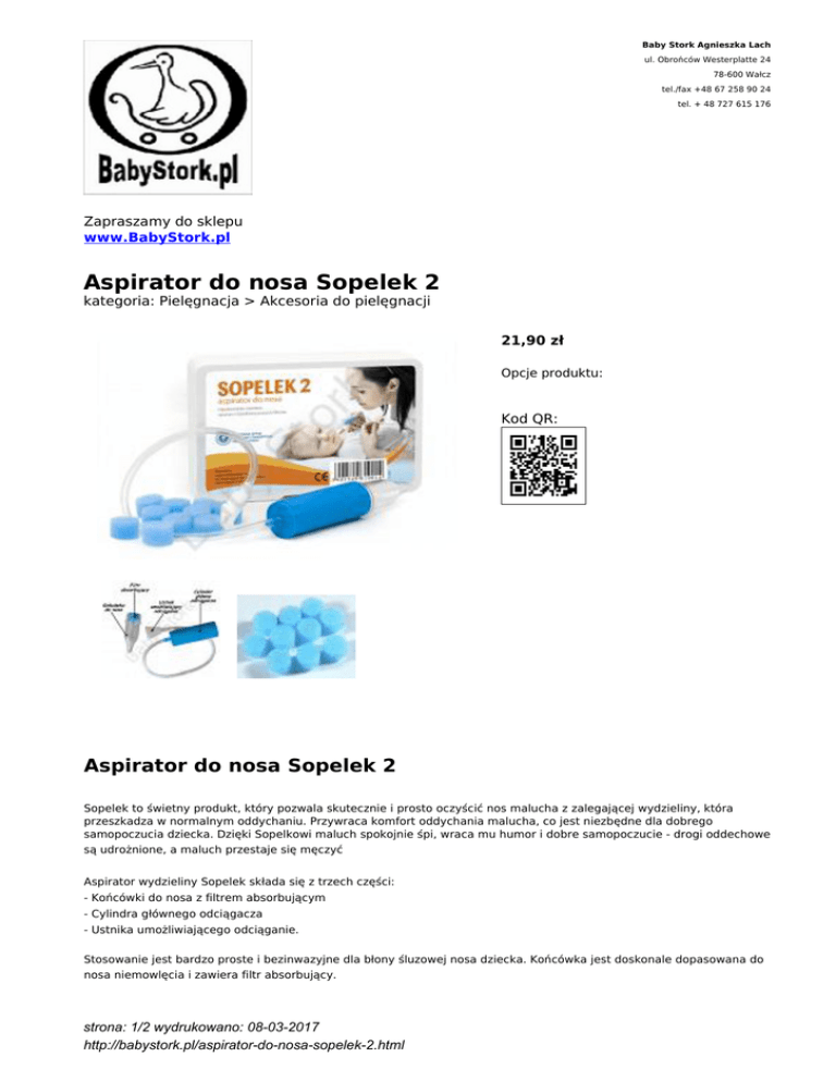 Baby Stork Agnieszka Lach ul. Obrońców Westerplatte 24 78-600 Wałcz tel./fax +48 67 258 90 24 tel. + 48 727 615 176 Zapraszamy do sklepu www.BabyStork.pl Aspirator do nosa Sopelek 2 kategoria: Pielęgnacja > Akcesoria do pielęgnacji 21,90 zł Opcje produktu: Kod QR: Aspirator do nosa Sopelek 2 Sopelek to świetny produkt, który pozwala skutecznie i prosto oczyścić nos malucha z zalegającej wydzieliny, która przeszkadza w normalnym oddychaniu. Przywraca komfort oddychania malucha, co jest niezbędne dla dobrego samopoczucia dziecka. Dzięki Sopelkowi maluch spokojnie śpi, wraca mu humor i dobre samopoczucie - drogi oddechowe są udrożnione, a maluch przestaje się męczyć Aspirator wydzieliny Sopelek składa się z trzech części: - Końcówki do nosa z filtrem absorbującym - Cylindra głównego odciągacza - Ustnika umożliwiającego odciąganie. Stosowanie jest bardzo proste i bezinwazyjne dla błony śluzowej nosa dziecka. Końcówka jest doskonale dopasowana do nosa niemowlęcia i zawiera filtr absorbujący. strona: 1/2 wydrukowano: 08-03-2017 http://babystork.pl/aspirator-do-nosa-sopelek-2.html W ZESTAWIE: - Odciągacz kataru - 10 filtrów jednorazowych (wymienne gąbki) strona: 2/2 wydrukowano: 08-03-2017 http://babystork.pl/aspirator-do-nosa-sopelek-2.html
