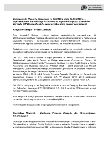 Załącznik do Raportu bieżącego nr 12/2016 z dnia 24.03.2016 r. – wykształcenie, kwalifikacje i stanowiska zajmowane przez członków Zarządu LW Bogdanka S.A., wraz przebiegiem kariery zawodowej Krzysztof Szlaga - Prezes Zarządu Pan Krzysztof Szlaga posiada wyższe wykształcenie ekonomiczne. W 2001 roku uzyskał tytuł magistra ekonomii na Akademii Ekonomicznej w Krakowie na Wydziale Finansów i Bankowości oraz tytuł Diplom-Betriebswirt nadany przez University of Applied Sciences w Kiel (Niemcy), na Wydziale Ekonomii. Doświadczenie zawodowe zdobywał w miedzynarodowych przedsiębiorstwach, od początku swej kariery koncentrując się na branżach kapitałochłonnych. Od 2001 roku Pan Krzysztof Szlaga pracował w KPMG Deutsche TreuhandGesellschaft, jako Audit Senior w Dziale Assurance Commercial Clients. W 2004 roku przeszedł do Ernst & Young Audit Spółka z o.o. jako Audit Senior w Dziale Assurance and Business Services. W latach 2005 – 2008 pracował jako Project Manager w Dziale Restrukturyzacji/Doskonałości Operacyjnej i Corporate Finance w Roland Berger Strategy Consultants Spółka z o.o. W latach 2008 – 2010 pełnił funkcję Członka Zarządu, Dyrektora ds. Zarządzania Łańcuchem Dostaw w CTL Logistics S.A. W okresie 2010 -2012 obejmował stanowisko Dyrektora ds. Zarządzania Łańcuchem Dostaw w spółce Ruch S.A. Od 2013 r. związany z LW Bogdanka, ostatnio w randze Zastępcy Prezesa Zarządu ds. Zakupów i Inwestycji LW BOGDANKA S.A. Od 1 kwietnia 2016 obejmie w niej funkcje Prezesa Zarządu. Pan Krzysztof Szlaga posiada wieloletnie doświadczenie w prowadzeniu złożonych procesów restrukturyzacyjnych w przemyśle ciężkim. Pan Krzysztof Szlaga włada biegle językiem niemieckim i angielskim. Stanisław Misterek - Zastępca Prezesa Zarządu ds. EkonomicznoFinansowych Ukończył studia magisterskie na Wydziale Ekonomicznym Uniwersytetu Marii CurieSkłodowskiej w Lublinie, Studia Podyplomowe w zakresie Standardów europejskich w rachunkowości i finansach na SGH w Warszawie, Studia Podyplomowe w zakresie zamówień publicznych na Europejskiej Wyższej Szkole Prawa i Administracji w Warszawie oraz Międzynarodowych Standardów Rachunkowości / Międzynarodowych Standardów Sprawozdawczości Finansowej spółek na WSPiA w Lublinie. Ukończył wiele szkoleń z zakresu zarządzania finansami oraz rachunkowości. Pan Stanisław Misterek powiązany jest z branżą wydobywczą i energetyczną od trzydziestu siedmiu lat. Z Lubelskim Zagłębiem Węglowym związany od 1979 roku, od 1990 roku pełnił kluczowe funkcje w Grupie Kapitałowej Lubelskiego Węgla Bogdanka. W tym czasie zdobył doświadczenie w zarządzaniu spółką działającą w branży wydobywczej oraz energetycznej, ze szczególnym uwzględnieniem zarządzania obszarem finansowym przedsiębiorstwa. Od maja 2008 roku do stycznia 2016 roku odpowiadał za finanse w Łęczyńskiej Energetyce Sp. z o.o. Od 1 kwietnia obejmie funkcję Zastępcy Prezesa Zarządu ds. Ekonomiczno-Finansowych w LW Bogdanka S.A. Adam Partyka - Zastępca Prezesa Zarządu ds. Pracowniczych i Społecznych Ukończył studia magisterskie na Politechnice Lubelskiej na kierunku Inżynierskie zastosowanie informatyki oraz Studia podyplomowe na Wyższej Szkole Przedsiębiorczości i Administracji w Lublinie na kierunku Rachunkowość i finanse. Ukończył wiele szkoleń z zakresu: audytu, odpowiedzialności i kompetencji kadry zarządzającej, finansów dla menedżerów oraz kursów na członków zarządów i rad nadzorczych spółek. Z Lubelskim Węglem Bogdanka związany od 1985 roku. Od czerwca 2014 roku pełni funkcję Zastępcy Przewodniczącego Związku Zawodowego NSZZ „Solidarność”. W latach 2007-2014 pełnił funkcję sztygara zmianowego urządzeń elektrycznych pod ziemią. W latach 2006-2012 pełnił funkcję członka Rady Nadzorczej LW Bogdanka S.A. Od 1 kwietnia obejmie w niej funkcję Zastępcy Prezesa Zarządu ds. Pracowniczych i Społecznych.