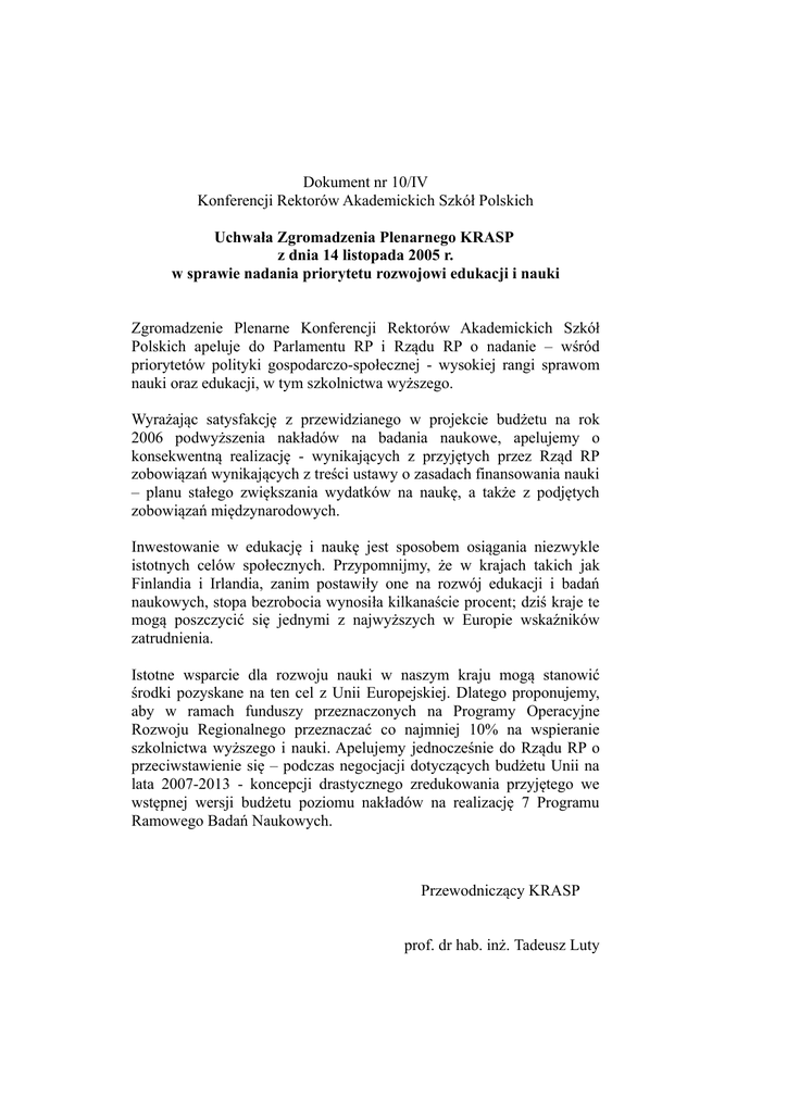 Dokument nr 10/IV Konferencji Rektorów Akademickich Szkół Polskich Uchwała Zgromadzenia Plenarnego KRASP z dnia 14 listopada 2005 r. w sprawie nadania priorytetu rozwojowi edukacji i nauki Zgromadzenie Plenarne Konferencji Rektorów Akademickich Szkół Polskich apeluje do Parlamentu RP i Rządu RP o nadanie – wśród priorytetów polityki gospodarczo-społecznej - wysokiej rangi sprawom nauki oraz edukacji, w tym szkolnictwa wyższego. Wyrażając satysfakcję z przewidzianego w projekcie budżetu na rok 2006 podwyższenia nakładów na badania naukowe, apelujemy o konsekwentną realizację - wynikających z przyjętych przez Rząd RP zobowiązań wynikających z treści ustawy o zasadach finansowania nauki – planu stałego zwiększania wydatków na naukę, a także z podjętych zobowiązań międzynarodowych. Inwestowanie w edukację i naukę jest sposobem osiągania niezwykle istotnych celów społecznych. Przypomnijmy, że w krajach takich jak Finlandia i Irlandia, zanim postawiły one na rozwój edukacji i badań naukowych, stopa bezrobocia wynosiła kilkanaście procent; dziś kraje te mogą poszczycić się jednymi z najwyższych w Europie wskaźników zatrudnienia. Istotne wsparcie dla rozwoju nauki w naszym kraju mogą stanowić środki pozyskane na ten cel z Unii Europejskiej. Dlatego proponujemy, aby w ramach funduszy przeznaczonych na Programy Operacyjne Rozwoju Regionalnego przeznaczać co najmniej 10% na wspieranie szkolnictwa wyższego i nauki. Apelujemy jednocześnie do Rządu RP o przeciwstawienie się – podczas negocjacji dotyczących budżetu Unii na lata 2007-2013 - koncepcji drastycznego zredukowania przyjętego we wstępnej wersji budżetu poziomu nakładów na realizację 7 Programu Ramowego Badań Naukowych. Przewodniczący KRASP prof. dr hab. inż. Tadeusz Luty