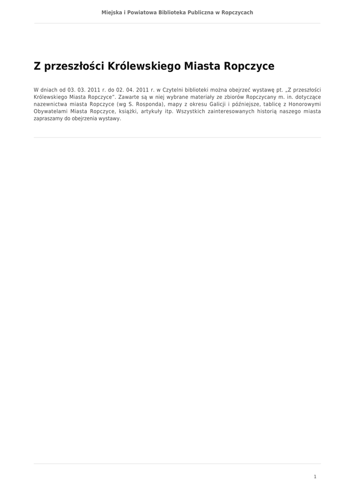 Miejska i Powiatowa Biblioteka Publiczna w Ropczycach Z przeszłości Królewskiego Miasta Ropczyce W dniach od 03. 03. 2011 r. do 02. 04. 2011 r. w Czytelni biblioteki można obejrzeć wystawę pt. „Z przeszłości Królewskiego Miasta Ropczyce”. Zawarte są w niej wybrane materiały ze zbiorów Ropczycany m. in. dotyczące nazewnictwa miasta Ropczyce (wg S. Rosponda), mapy z okresu Galicji i późniejsze, tablicę z Honorowymi Obywatelami Miasta Ropczyce, książki, artykuły itp. Wszystkich zainteresowanych historią naszego miasta zapraszamy do obejrzenia wystawy. 1