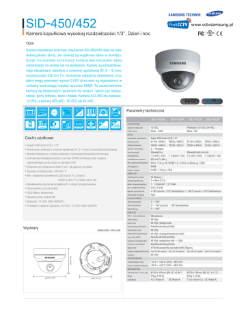 SID-450/452 Kamera kopułkowa wysokiej rozdzielczości 1/3”, Dzień i noc Opis Kamery kopułkowe kolorowe, trzyosiowe SID-450/452 dają nie tylko dobrej jakości obraz, ale również są wyjątkowo łatwe w montażu. Dzięki trzyosiowej konstrukcji kamerę jest niezwykle łatwo zamontować na ścianie lub na pochyłości. Kamery są kompaktowe, maja wbudowany obiektyw o zmiennej ogniskowej 3X (3 ~ 9 mm), rozdzielczość 530 linii TV, minimalne natężenie oświetlenia, przy jakim mogą pracować wynosi 0.002 luksa oraz są wyposażone w unikalną technologię redukcji szumów SSNR. Te wszechstronne kamery są doskonałym wyborem do wnętrz, takich jak sklepy, szkoły, porty lotnicze, banki i hotele. Kamera SID-450 ma zasilanie 12 VDC, a kamera SID-452 - 12 VDC lub 24 VAC. 1/3¨ 410K(N) 470K(P) 530TVL 3X 0.3Lux Color CC D Camera 3-Axis Parametry techniczne V/F SID-450N 50dB SID-450P SID-452N SID-452P ELEKTRyCZNE 12VDC Napięcie wejściowe Pobór mocy 12V DC Maks. 2.5W Podwójne (12V DC/ 24V AC) Maks. 3W WIZJA Cechy użytkowe Urządzenie obrazowania Piksele łącznie • Super HAD kolor CCD, 1/3” Piksele efektywne • Wbudowany obiektyw o zmiennej ogniskowej 3X (3 ~ 9 mm) z automatyczną przysłoną System skanowania • Montaż naścienny z wykorzystaniem trzyosiowej konstrukcji obrotowej • Cyfrowa technologia redukcji szumów SSNR zmniejsza ilość miejsca zajmowanego przez obraz w pamięci DVR Synchronizacja Częstotliwość Rozdzielczość pozioma Min. nateżenie oświetlenia • Zdolność do działania w dzień i noc, 24 godziny na dobę S/N (sygnał y) • Wysoka rozdzielczość, 530 linii TV Wyjście wizyjne Super HAD kolor CCD, 1/3” 811(H) x 508(V) 795(H) x 596(V) 811(H) x 508(V) 795(H) x 596(V) 768(H) x 494(V) 752(H) x 582(V) 768(H) x 494(V) 752(H) x 582(V) 2 : 1 Przeplot Wewnętrzny Wewnętrzna/Line lock H :15.734KHz / V : 59.94Hz H : 15.625KHz / V : 50Hz H :15.734KHz / V : 59.94Hz H : 15.625KHz / V : 50Hz 530 linii TV (Min.) Kolor : 0.3Lux (50 [email protected]), 0.002Lux (Sens-up, 128X) 50dB CVBS : 1.0Vp-p / 75Ω OBIEKTyW • Min. natężenie oświetlenia 0,03 lx przy F1,2 (kolor) Współczynnik zoomu 0.002 lx przy F1,2 (kolor sens-up) Długość ogniskowej • Maskowanie obszarów prywatnych, 4 strefy programowane Maks. stosunek apertury • Wykrywanie ruchu(4 strefy) Min. odległość obiektu • OSD (Menu ekranowe) 3X (Ręczny ) 3 ~ 9mm (F1.2) 1 : 1.2(szeroki) ~ 2.1(Tele) 0.5m (1.64ft) Kątowe pole widzenia H: 90°(szeroki) ~ 31.8°(teleobiektyw) / V : 66.2°(szeroki) ~ 23.9°(teleobiektyw) Sterowanie przysłoną Auto • Współczynnik S/N50 dB PAN/TILT/OBRÓT • Zasilanie: 12 VDC (SID-450N/P) Zakres panoramy • Podwójne napięcie zasilania: 24 VAC / 12 VDC (SID-452N/P) Zakres przechyłu Rotate Range 0° ~ 350° 0° ~ 140°(szeroki) ~ 160°(teleobiektyw) 0° ~ 340° ROBOCZE Balans bieli Wbudowany Wł./Wył. Wł./Wył. (Elektryczne) Niski/Średni/Wysoki/Wył. Wł./Wył. Wł./Wył. (4 programowanych stref) Niski/Średni/Wysoki/Wył. Wł./Wył. (wybieralny limit ~ 128X) Niski/Średni/Wysoki/Wył. ATW/Wewnątrz/Na zewnątrz/AWC/Ręczny Prędkość migawki elektronicznej Stałe (1/60 / Bez migotania) Stałe (1/50 / Bez migotania) Lusterko Wł./Wył. OS D - menu ekranowe Tytuł kamery Dzień i noc Kompensacja podświetlenia Wymiary Jednostka: mm (cal) Wykrywanie ruchu Maskowanie prywatności Noise Filter (SSNR) Czułość sens-up (integracja kadru) 105 (4.13") Kontrola wzmacniania Stałe (1/60 / Bez migotania) Stałe (1/50 / Bez migotania) ŚRODOWISKOWE Temperatura/Wilgotność robocza Temperatura/ Wil gotność przechowywania -10°C ~ +50°C / 20% ~ 80% RH -20°C ~ +60°C / 20% ~ 90% RH MECHANICZNE Wymiary (szer, x wys. x gł.) Waga 130 (5.12") 130 (5.12") Certyfikaty Ø130 x 100mm (Ø5.12” x 3.94”) 570g (1.26 lb) FCC (Klasa A) CE (Klasa A) Ø130 x 105mm (Ø5.12” x 4.13”) 670g (1.48 lb) FCC (Klasa A), rejestrowany UL/cUL CE (Klasa A)