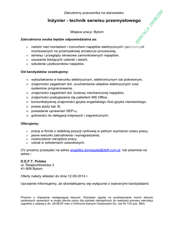 Zatrudnimy pracownika na stanowisko: Inżynier - technik serwisu przemysłowego Miejsce pracy: Bytom Zatrudniona osoba będzie odpowiedzialna za: • • • • JA C TA U KR E R NA O CZ Ń KO A Z nadzór nad montażem i rozruchem napędów elektrycznych i pokrewnych montowanych na przemysłowej armaturze procesowej, serwisy i przeglądy okresowe zamontowanych napędów, usuwanie bieżących usterek i awarii, szkolenie użytkowników napędów. Od kandydatów oczekujemy: • • • • • • • • wykształcenia w kierunku elektrycznym, elektronicznym lub pokrewnym, znajomości zagadnień dot. uruchamiania układów elektrycznych oraz systemów programowania , znajomości zagadnień dot. budowy mechanicznej napędów, znajomości posługiwania się pakietem MS Office, komunikatywnej znajomości języka angielskiego i/lub języka niemieckiego, prawa jazdy kat. B, posiadanie uprawnień SEP-u, gotowości do delegacji krajowych i zagranicznych. Oferujemy: • • • • pracę w firmie o stabilnej pozycji rynkowej w pełnym wymiarze czasu pracy, jasne warunki zatrudnienia i wynagradzania, nowoczesne narzędzia pracy, udział w szkoleniach zawodowych. CV prosimy przesyłać na adres [email protected] lub pisemnie na adres : D.E.F.T. Polska ul. Świętochłowicka 3 41-909 Bytom Oferty należy składać do dnia 12.09.2014 r. Uprzejmie informujemy, że skontaktujemy się wyłącznie z wybranymi kandydatami. Prosimy o dopisanie następującej klauzuli: Wyrażam zgodę na przetwarzanie moich danych osobowych zawartych w mojej ofercie pracy dla potrzeb niezbędnych do realizacji procesu rekrutacji (zgodnie z ustawą z dn. 29.08.97 roku o Ochronie Danych Osobowych Dz. Ust Nr 133 poz. 883)