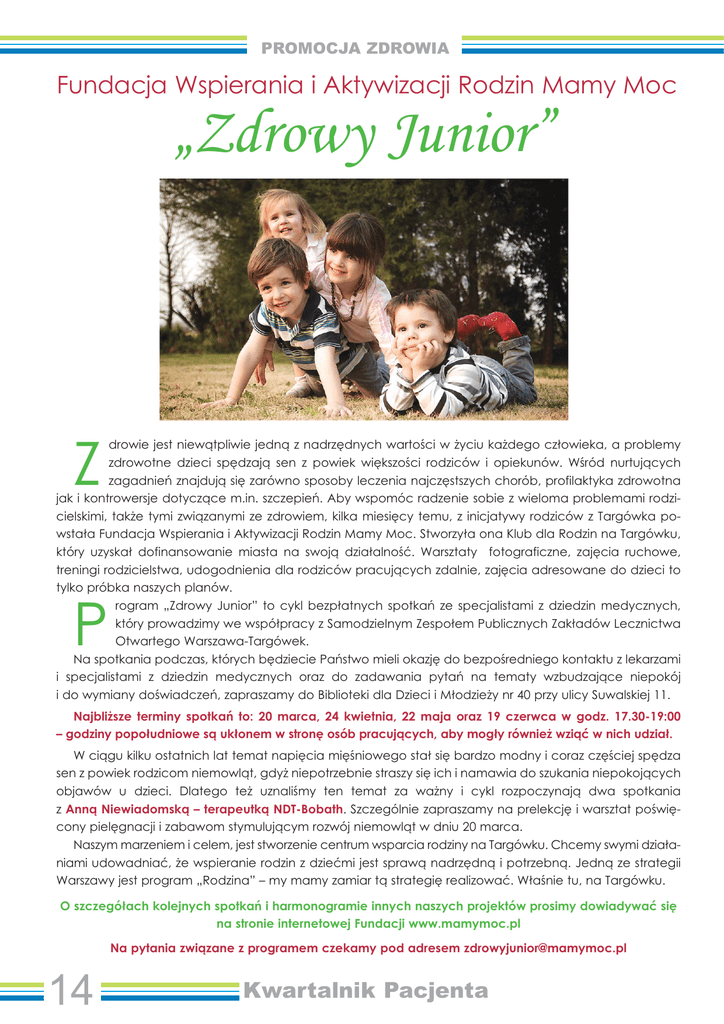 PROMOCJA ZDROWIA Fundacja Wspierania i Aktywizacji Rodzin Mamy Moc „Zdrowy Junior” drowie jest niewątpliwie jedną z nadrzędnych wartości w życiu każdego człowieka, a problemy zdrowotne dzieci spędzają sen z powiek większości rodziców i opiekunów. Wśród nurtujących zagadnień znajdują się zarówno sposoby leczenia najczęstszych chorób, profilaktyka zdrowotna jak i kontrowersje dotyczące m.in. szczepień. Aby wspomóc radzenie sobie z wieloma problemami rodzicielskimi, także tymi związanymi ze zdrowiem, kilka miesięcy temu, z inicjatywy rodziców z Targówka powstała Fundacja Wspierania i Aktywizacji Rodzin Mamy Moc. Stworzyła ona Klub dla Rodzin na Targówku, który uzyskał dofinansowanie miasta na swoją działalność. Warsztaty fotograficzne, zajęcia ruchowe, treningi rodzicielstwa, udogodnienia dla rodziców pracujących zdalnie, zajęcia adresowane do dzieci to tylko próbka naszych planów. rogram „Zdrowy Junior” to cykl bezpłatnych spotkań ze specjalistami z dziedzin medycznych, który prowadzimy we współpracy z Samodzielnym Zespołem Publicznych Zakładów Lecznictwa Otwartego Warszawa-Targówek. Na spotkania podczas, których będziecie Państwo mieli okazję do bezpośredniego kontaktu z lekarzami i specjalistami z dziedzin medycznych oraz do zadawania pytań na tematy wzbudzające niepokój i do wymiany doświadczeń, zapraszamy do Biblioteki dla Dzieci i Młodzieży nr 40 przy ulicy Suwalskiej 11. Z P Najbliższe terminy spotkań to: 20 marca, 24 kwietnia, 22 maja oraz 19 czerwca w godz. 17.30-19:00 – godziny popołudniowe są ukłonem w stronę osób pracujących, aby mogły również wziąć w nich udział. W ciągu kilku ostatnich lat temat napięcia mięśniowego stał się bardzo modny i coraz częściej spędza sen z powiek rodzicom niemowląt, gdyż niepotrzebnie straszy się ich i namawia do szukania niepokojących objawów u dzieci. Dlatego też uznaliśmy ten temat za ważny i cykl rozpoczynają dwa spotkania z Anną Niewiadomską – terapeutką NDT-Bobath. Szczególnie zapraszamy na prelekcję i warsztat poświęcony pielęgnacji i zabawom stymulującym rozwój niemowląt w dniu 20 marca. Naszym marzeniem i celem, jest stworzenie centrum wsparcia rodziny na Targówku. Chcemy swymi działaniami udowadniać, że wspieranie rodzin z dziećmi jest sprawą nadrzędną i potrzebną. Jedną ze strategii Warszawy jest program „Rodzina” – my mamy zamiar tą strategię realizować. Właśnie tu, na Targówku. O szczegółach kolejnych spotkań i harmonogramie innych naszych projektów prosimy dowiadywać się na stronie internetowej Fundacji www.mamymoc.pl Na pytania związane z programem czekamy pod adresem [email protected] 14 Kwartalnik Pacjenta