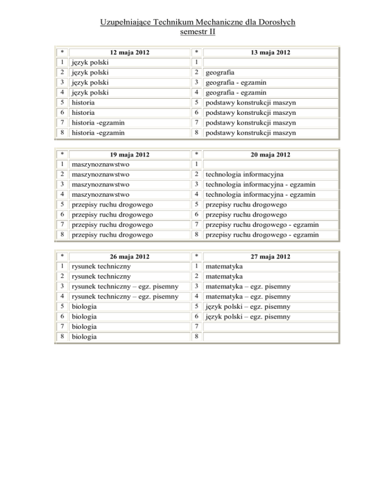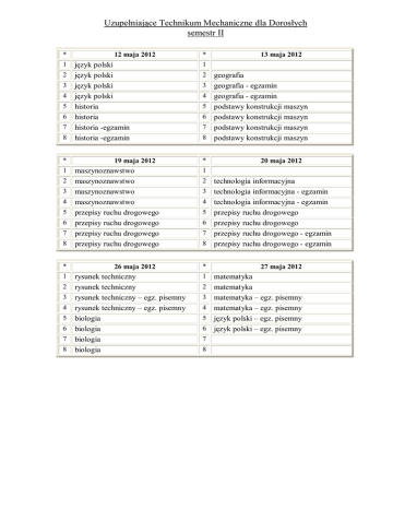 Uzupe niaj ce Technikum Mechaniczne dla Doros ych semestr II * 1 2 3 4 5 6 7 8 * 1 2 3 4 5 6 7 8 * 1 2 3 4 5 6 7 8 12 maja 2012 zyk polski zyk polski zyk polski zyk polski historia historia historia -egzamin historia -egzamin 19 maja 2012 maszynoznawstwo maszynoznawstwo maszynoznawstwo maszynoznawstwo przepisy ruchu drogowego przepisy ruchu drogowego przepisy ruchu drogowego przepisy ruchu drogowego 26 maja 2012 rysunek techniczny rysunek techniczny rysunek techniczny – egz. pisemny rysunek techniczny – egz. pisemny biologia biologia biologia biologia * 1 2 3 4 5 6 7 8 * 1 2 3 4 5 6 7 8 * 1 2 3 4 5 6 7 8 13 maja 2012 geografia geografia - egzamin geografia - egzamin podstawy konstrukcji maszyn podstawy konstrukcji maszyn podstawy konstrukcji maszyn podstawy konstrukcji maszyn 20 maja 2012 technologia informacyjna technologia informacyjna - egzamin technologia informacyjna - egzamin przepisy ruchu drogowego przepisy ruchu drogowego przepisy ruchu drogowego - egzamin przepisy ruchu drogowego - egzamin 27 maja 2012 matematyka matematyka matematyka – egz. pisemny matematyka – egz. pisemny zyk polski – egz. pisemny zyk polski – egz. pisemny Uzupe niaj ce Technikum Technologii Drewna dla Doros ych semestr II * 1 2 3 4 5 6 7 8 * 1 2 3 4 5 6 7 8 * 1 2 3 4 5 6 7 8 12 maja 2012 zyk polski zyk polski zyk polski zyk polski historia historia historia -egzamin historia -egzamin 19 maja 2012 rysunek techniczny rysunek techniczny rysunek techniczny rysunek techniczny technologia technologia technologia technologia 26 maja 2012 technologia technologia technologia technologia biologia biologia biologia biologia * 1 2 3 4 5 6 7 8 * 1 2 3 4 5 6 7 8 * 1 2 3 4 5 6 7 8 13 maja 2012 geografia geografia - egzamin geografia - egzamin materia oznawstwo materia oznawstwo materia oznawstwo materia oznawstwo 20 maja 2012 technologia informacyjna technologia informacyjna - egzamin technologia informacyjna - egzamin rysunek techniczny rysunek techniczny rysunek techniczny - egzamin rysunek techniczny - egzamin 27 maja 2012 matematyka matematyka matematyka – egz. pisemny matematyka – egz. pisemny zyk polski – egz. pisemny zyk polski – egz. pisemny Uzupe niaj ce Technikum Handlowe dla Doros ych semestr II * 1 2 3 4 5 6 7 8 * 1 2 3 4 5 6 7 8 * 1 2 3 4 5 6 12 maja 2012 historia historia historia - egzamin historia - egzamin zyk polski zyk polski zyk polski zyk polski 19 maja 2012 marketing marketing marketing marketing ekonomika handlu ekonomika handlu ekonomika handlu - egzamin ekonomika handlu - egzamin 26 maja 2012 biologia biologia biologia biologia zyk polski – egz. pisemny zyk polski – egz. pisemny * 1 2 3 4 5 6 7 13 maja 2012 rachunkowo handlowa rachunkowo handlowa rachunkowo handlowa rachunkowo handlowa geografia geografia - egzamin geografia - egzamin 8 * 1 2 3 4 5 6 7 8 * 1 2 3 4 5 6 7 7 8 8 20 maja 2012 zyk polski zyk polski zyk polski zyk polski rachunkowo handlowa – egz. pisemny rachunkowo handlowa – egz. pisemny marketing - egzamin marketing - egzamin 27 maja 2012 towaroznawstwo towaroznawstwo towaroznawstwo - egzamin towaroznawstwo - egzamin matematyka matematyka matematyka – egz. pisemny matematyka – egz. pisemny Uzupe niaj ce Technikum Mechaniczne dla Doros ych semestr IV * 1 2 3 4 5 6 7 8 * 1 2 3 4 5 6 7 8 * 1 12 maja 2012 zyk polski zyk polski zyk polski zyk polski matematyka matematyka matematyka matematyka 5 6 7 8 19 maja 2012 technologia mechaniczna - egzamin technologia mechaniczna - egzamin wyposa enie elektr. poj. samochod. egzamin wyposa enie elektr. poj. samochod. egzamin uk ady sterowania i regulacji uk ady sterowania i regulacji uk ady sterowania i regulacji uk ady sterowania i regulacji 26 maja 2012 3 4 fizyka i astronomia 5 fizyka i astronomia - egzamin fizyka i astronomia - egzamin chemia - egzamin chemia - egzamin 6 7 8 13 maja 2012 technologia mechaniczna 2 technologia mechaniczna 3 technologia mechaniczna 4 technologia mechaniczna fizyka i astronomia fizyka i astronomia fizyka i astronomia 2 * 1 * 1 20 maja 2012 4 ekspoatacja maszyn i urz dze - egzamin ekspoatacja maszyn i urz dze 2 ekspoatacja maszyn i urz dze 3 ekspoatacja maszyn i urz dze - egzamin 5 matematyka – egz. pisemny 6 matematyka – egz. pisemny 7 8 * 1 27 maja 2012 uk ady sterowania i regulacji - egzamin 2 uk ady sterowania i regulacji - egzamin 3 podstawy konstrukcji maszyn – egzamin pisemny 4 podstawy konstrukcji maszyn – egzamin pisemny 5 6 7 8 Uzupe niaj ce Technikum Technologii Drewna dla Doros ych semestr IV * 1 2 3 4 5 6 7 8 * 1 12 maja 2012 zyk polski zyk polski zyk polski zyk polski matematyka matematyka matematyka matematyka * 1 2 3 4 5 6 7 8 19 maja 2012 * 1 2 2 3 3 4 4 5 5 6 6 7 8 7 8 * 1 2 3 4 5 6 7 8 26 maja 2012 fizyka i astronomia fizyka i astronomia fizyka i astronomia fizyka i astronomia fizyka i astronomia - egzamin fizyka i astronomia - egzamin chemia - egzamin chemia - egzamin * 1 2 3 4 5 6 7 8 13 maja 2012 konstrukcje konstrukcje elektrotechnika i automatyka elektrotechnika i automatyka maszyny i urz dzenia maszyny i urz dzenia technologia technologia 20 maja 2012 konstrukcje konstrukcje konstrukcje konstrukcje matematyka – egz. pisemny matematyka – egz. pisemny 27 maja 2012 technologia technologia technologia – egz. pisemny technologia – egz. pisemny konstrukcje konstrukcje elektrotechnika i automatyka elektrotechnika i automatyka Uzupe niaj ce Technikum Handlowe dla Doros ych semestr IV * 1 2 3 4 5 6 7 8 * 1 2 3 4 12 maja 2012 zyk polski zyk polski zyk polski zyk polski matematyka matematyka matematyka matematyka 19 maja 2012 ekonomika handlu ekonomika handlu ekonomika handlu ekonomika handlu * 1 elementy prawa 2 elementy prawa 3 elementy prawa 4 elementy prawa 5 rachunkowo 6 rachunkowo 7 rachunkowo 8 rachunkowo handlowa handlowa handlowa handlowa * 1 20 maja 2012 rachunkowo 2 rachunkowo 3 rachunkowo 4 rachunkowo 5 6 7 elementy prawa elementy prawa elementy prawa – egz. pisemny 5 6 7 8 elementy prawa – egz. pisemny 8 * 1 2 3 4 5 6 7 8 26 maja 2012 fizy