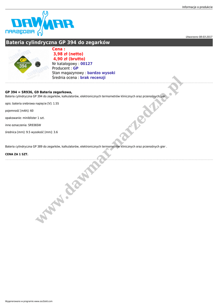 Informacje o produkcie Utworzono 08-03-2017 Bateria cylindryczna GP 394 do zegarków Cena : 3,98 zł (netto) 4,90 zł (brutto) zi a. p l Nr katalogowy : 00127 Producent : GP Stan magazynowy : bardzo wysoki Średnia ocena : brak recenzji GP 394 = SR936, G9 Bateria zegarkowa, Bateria cylindryczna GP 394 do zegarków, kalkulatorów, elektronicznych termometrów klinicznych oraz przenośnych gier opis: bateria srebrowa napięcie [V]: 1.55 ar ze d pojemność [mAh]: 60 opakowanie: miniblister 1 szt. inne oznaczenia: SR936SW ar -n średnica [mm]: 9.5 wysokość [mm]: 3.6 Bateria cylindryczna GP 389 do zegarków, kalkulatorów, elektronicznych termometrów klinicznych oraz przenośnych gier . w w w .d aw m CENA ZA 1 SZT. Wygenerowano w programie www.oscGold.com