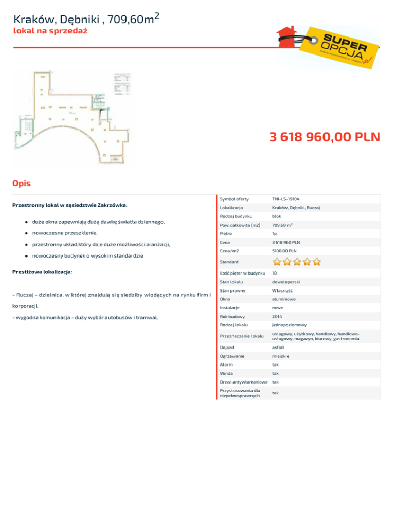Kraków, Dębniki , 709,60m2 lokal na sprzedaż 3 618 960,00 PLN Opis Przestronny lokal w sąsiedztwie Zakrzówka: duże okna zapewniają dużą dawkę światła dziennego, Symbol oferty TNI-LS-19104 Lokalizacja Kraków, Dębniki, Ruczaj Rodzaj budynku blok Pow. całkowita [m2] 709,60 m² nowoczesne przeszklenie, Piętro 1p przestronny układ,który daje duże możliwości aranżacji, Cena 3 618 960 PLN Cena/m2 5100.00 PLN nowoczesny budynek o wysokim standardzie Standard Prestiżowa lokalizacja: Ilość pięter w budynku 10 Stan lokalu deweloperski Stan prawny Własność Okna aluminiowe korporacji, Instalacje nowe - wygodna komunikacja - duży wybór autobusów i tramwai, Rok budowy 2014 Rodzaj lokalu jednopoziomowy Przeznaczenie lokalu usługowy, użytkowy, handlowy, handlowousługowy, magazyn, biurowy, gastronomia Dojazd asfalt Ogrzewanie miejskie Alarm tak Winda tak - Ruczaj - dzielnica, w której znajdują s ię siedziby wiodących na rynku firm i Drzwi antywłamaniowe tak Przystosowania dla niepełnosprawnych tak SUPEROPCJA Sp. z o.o. Morawskiego 5, 30-102 Kraków 12 423 22 50 Możliwość parkowania tak Wejście z klatki schodowej 533311775 Karolina Czopek