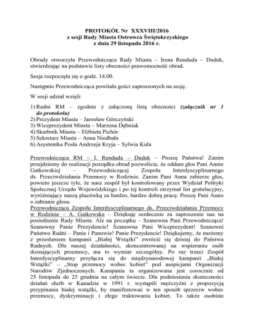 PROTOKÓŁ Nr XXXVIII/2016 z sesji Rady Miasta Ostrowca Świętokrzyskiego z dnia 29 listopada 2016 r. Obrady otworzyła Przewodnicząca Rady Miasta – Irena Renduda – Dudek, stwierdzając na podstawie listy obecności prawomocność obrad. Sesja rozpoczęła się o godz. 14.00. Następnie Przewodnicząca powitała gości zaproszonych na sesję. W sesji udział wzięli: 1) Radni RM – zgodnie z załączoną listą obecności (załącznik nr 1 do protokołu) 2) Prezydent Miasta – Jarosław Górczyński 3) Wiceprezydent Miasta – Marzena Dębniak 4) Skarbnik Miasta – Elżbieta Pichór 5) Sekretarz Miasta – Anna Niedbała 6) Asystentka Posła Andrzeja Kryja – Sylwia Kula Przewodnicząca RM – I. Renduda – Dudek – Proszę Państwa! Zanim przejdziemy do realizacji porządku obrad pozwolicie, że oddam głos Pani Annie Gatkowskiej – Przewodniczącej Zespołu Interdyscyplinarnego ds. Przeciwdziałania Przemocy w Rodzinie. Zanim Pani Anna zabierze głos, powiem jeszcze tyle, że nasz zespół był kontrolowany przez Wydział Polityki Społecznej Urzędu Wojewódzkiego i po tej kontroli otrzymał list gratulacyjny, wyróżniający naszą placówką za bardzo, bardzo dobrą pracę. Proszę Pani Anno o zabranie głosu. Przewodnicząca Zespołu Interdyscyplinarnego ds. Przeciwdziałania Przemocy w Rodzinie – A. Gatkowska – Dziękuję serdecznie za zaproszenie nas na posiedzenie Rady Miasta. Ale na początku – Szanowna Pani Przewodnicząca! Szanowny Panie Prezydencie! Szanowna Pani Wiceprezydent! Szanowni Państwo Radni – Panie i Panowie! Panie Prezydencie! Dziękujemy, że możemy z przesłaniem kampanii „Białej Wstążki” zwrócić się dzisiaj do Państwa Radnych. Dla naszej działalności, skoncentrowanej na wspieraniu osób doznających przemocy, ma to wymiar szczególny. Po raz trzeci Zespół Interdyscyplinarny przyłącza się do międzynarodowej kampanii „Białej Wstążki” – „Stop przemocy wobec kobiet” pod auspicjami Organizacji Narodów Zjednoczonych. Kampania ta organizowana jest corocznie od 25 listopada do 25 grudnia na całym świecie. Dla podniesienia skuteczności działań służb w Kanadzie w 1991 r. wystąpili mężczyźni z propozycją przypinania białej wstążki, by manifestować w ten sposób sprzeciw wobec przemocy, dyskryminacji i złego traktowania kobiet. To także osobiste zobowiązanie noszącego je mężczyzny, że nie będzie akceptować lub milczeć na temat przemocy wobec kobiet. W czasie kampanii, proszę państwa, zwracamy się do wszystkich znaczących osób na terenie miasta, aby zechciały swoim autorytetem wesprzeć tak niezwykle ważne przedsięwzięcie. Autorytet Państwa i funkcje, jaką Państwo pełnicie dla naszego miasta, ma szczególne znaczenie. Dla podkreślenia ważności podejmowanych działań przez nasz zespół w zakresie ochrony i wspierania osób krzywdzonych. Taka forma wsparcia z Państwa strony jest niezwykle ważna dla kobiet doznających przemocy, a które po latach złego traktowania żyją w wyuczonej bezradności. Organizując kampanię białej wstążki chcemy promować i propagować ideę życia bez przemocy, krzywdzenia i podkreślać godność i szacunek, jakim powinniśmy darzyć drugą osobę. Poprzez nasze działania chcemy przede wszystkim wspierać kobiety, by przerwały milczenie i zdecydowały o swoim życiu bez gwałcenia ich praw. Chcemy, by przy naszym i Państwa wsparciu osoby krzywdzone nabrały siły sprawczej do działania. Dlatego w tych dniach rozdajemy ulotki informujące o przemocy, jej formach i stereotypach. Mężczyznom przypinamy białe wstążki na znak sprzeciwu wobec przemocy i wspierania działalności służb, a dla kobiet – róże jako symbol szacunku, który przysługuje kobiecie i każdemu człowiekowi. Dziękuję serdecznie. A za chwilę Państwo, którzy mi dzisiaj towarzyszą, w trakcie przypinania białych wstążek, jest Pani Anna Wasilewska, reprezentująca Komendę Powiatową Policji, Pan Damian Łasak – też z Komendy Powiatowej Policji, Pani Magdalena Kłys – ze Straży Miejskiej i Pan Michał Sierant – również ze Straży Miejskiej. I Pani Agnieszka Piotrowska, która jest pracownikiem socjalnym Miejskiego Ośrodka Pomocy Społecznej, ale również pełni funkcję Zastępcy Przewodniczącej Zespołu Interdyscyplinarnego ds. Przeciwdziałania Przemocy w Rodzinie. Wobec powyższego zapraszam Państwa: Panów do przypinania białych wstążek Panom, a Paniom – właśnie róża jako znak szacunku dla kobiet i dla każdego człowieka z osobna. Dziękuję serdecznie Państwu! (oklaski) Prezydent Miasta – J. Górczyński – Pani Przewodnicząca! Panie i Panowie Radni! Ja pozwolę sobie być wyrazicielem słów od nas wszystkich: radnych Rady Miasta, mężczyzn, osób funkcyjnych zgromadzonych tutaj, dyrektorów, naczelników, prezesów. Pani Anna Gatkowska – Przewodnicząca Zespołu Interdyscyplinarnego przy Miejskim Ośrodku Pomocy Społecznej – chciałbym bardzo serdecznie podziękować Pani za Pani pracę, za Pani inicjatywę, za wkład, za uświadamianie, jak ważna to jest idea, jak ważna jest rola wszystkich, aby to uświadamiać, aby tych „niebieskich kart” w naszym mieście było jak najmniej, aby przemoc nie wzrastała. To niestety, są takie przypadku, o których w większości nie wiemy, gdzieś w zaciszu domowego ogniska dzieją się trudne, brudne rzeczy, nie do końca mamy świadomość, jak to wygląda. Więc myślę, że taka akcja, upublicznienie, pokazywanie potrzeby i pokazywanie potrzeby wsparcia dla naszych najpiękniejszych pań jest bardzo ważne. Z tego miejsca 2 w imieniu wszystkich bardzo serdecznie dziękuję. Myślę, że brawa dla całego zespołu się należą. (oklaski) Przewodnicząca Zespołu Interdyscyplinarnego ds. Przeciwdziałania Przemocy w Rodzinie – A. Gatkowska – Ja bardzo serdecznie dziękuję za te ciepłe słowa, które Pan Prezydent skierował do mnie i do wszystkich członków Zespoł
