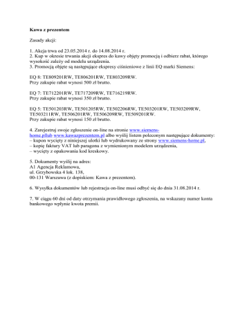 Kawa z prezentem Zasady akcji: 1. Akcja trwa od 23.05.2014 r. do 14.08.2014 r. 2. Kup w okresie trwania akcji ekspres do kawy objęty promocją i odbierz rabat, którego wysokość zależy od modelu urządzenia. 3. Promocją objęte są następujące ekspresy ciśnieniowe z linii EQ marki Siemens: EQ 8: TE809201RW, TE806201RW, TE803209RW. Przy zakupie rabat wynosi 500 zł brutto. EQ 7: TE712201RW, TE717209RW, TE716219RW. Przy zakupie rabat wynosi 350 zł brutto. EQ 5: TE501203RW, TE501205RW, TE502206RW, TE503201RW, TE503209RW, TE503211RW, TE506201RW, TE506209RW, TE509201RW. Przy zakupie rabat wynosi 150 zł brutto. 4. Zarejestruj swoje zgłoszenie on-line na stronie www.siemenshome.pllub www.kawazprezentem.pl albo wyślij listem poleconym następujące dokumenty: – kupon wycięty z niniejszej ulotki lub wydrukowany ze strony www.siemens-home.pl, – kopię faktury VAT lub paragonu z wymienionym modelem urządzenia, – wycięty z opakowania kod kreskowy. 5. Dokumenty wyślij na adres: A1 Agencja Reklamowa, ul. Grzybowska 4 lok. 138, 00-131 Warszawa (z dopiskiem: Kawa z prezentem). 6. Wysyłka dokumentów lub rejestracja on-line musi odbyć się do dnia 31.08.2014 r. 7. W ciągu 60 dni od daty otrzymania prawidłowego zgłoszenia, na wskazany numer konta bankowego wpłynie kwota premii.