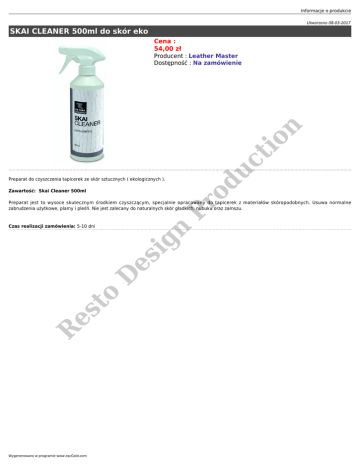 Informacje o produkcie Utworzono 08-03-2017 SKAI CLEANER 500ml do skór eko Cena : 54,00 zł Preparat do czyszczenia tapicerek ze skór sztucznych ( ekologicznych ). Zawartość: Skai Cleaner 500ml Pr od uc ti o n Producent : Leather Master Dostępność : Na zamówienie Preparat jest to wysoce skutecznym środkiem czyszczącym, specjalnie opracowany do tapicerek z materiałów skóropodobnych. Usuwa normalne zabrudzenia użytkowe, plamy i pleśń. Nie jest zalecany do naturalnych skór gładkich, nubuku oraz zamszu. R es t o D es ig n Czas realizacji zamówienia: 5-10 dni Wygenerowano w programie www.oscGold.com