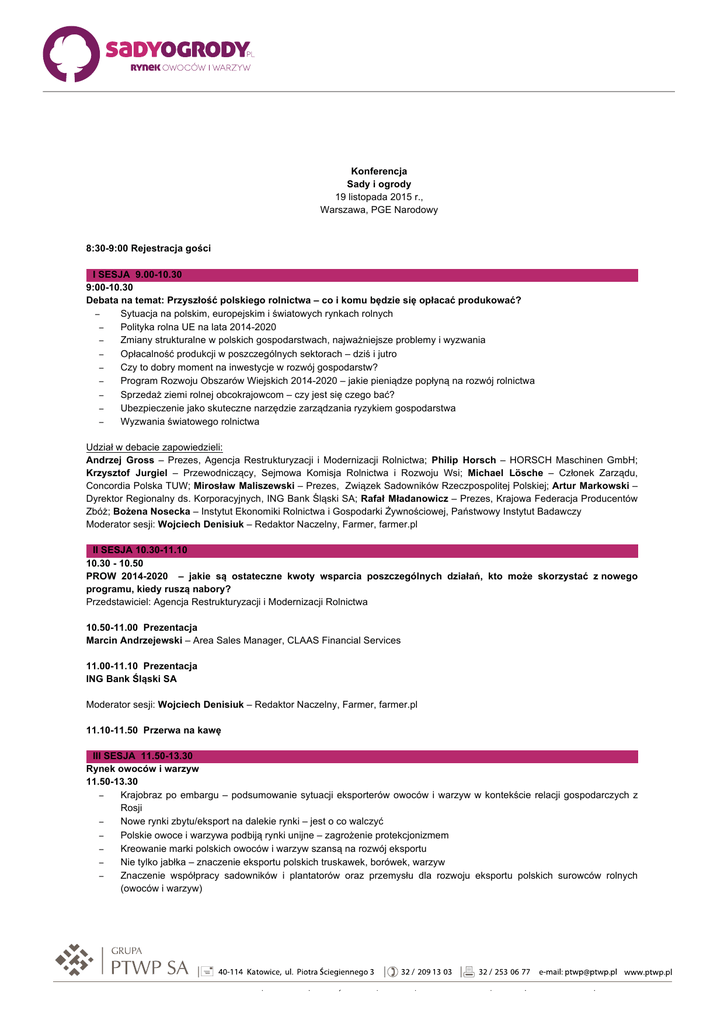 Konferencja Sady i ogrody 19 listopada 2015 r., Warszawa, PGE Narodowy 8:30-9:00 Rejestracja gości I SESJA 9.00-10.30 9:00-10.30 Debata na temat: Przyszłość polskiego rolnictwa – co i komu będzie się opłacać produkować? − Sytuacja na polskim, europejskim i światowych rynkach rolnych − Polityka rolna UE na lata 2014-2020 − Zmiany strukturalne w polskich gospodarstwach, najważniejsze problemy i wyzwania − Opłacalność produkcji w poszczególnych sektorach – dziś i jutro − Czy to dobry moment na inwestycje w rozwój gospodarstw? − Program Rozwoju Obszarów Wiejskich 2014-2020 – jakie pieniądze popłyną na rozwój rolnictwa − Sprzedaż ziemi rolnej obcokrajowcom – czy jest się czego bać? − Ubezpieczenie jako skuteczne narzędzie zarządzania ryzykiem gospodarstwa − Wyzwania światowego rolnictwa Udział w debacie zapowiedzieli: Andrzej Gross – Prezes, Agencja Restrukturyzacji i Modernizacji Rolnictwa; Philip Horsch – HORSCH Maschinen GmbH; Krzysztof Jurgiel – Przewodniczący, Sejmowa Komisja Rolnictwa i Rozwoju Wsi; Michael Lösche – Członek Zarządu, Concordia Polska TUW; Mirosław Maliszewski – Prezes, Związek Sadowników Rzeczpospolitej Polskiej; Artur Markowski – Dyrektor Regionalny ds. Korporacyjnych, ING Bank Śląski SA; Rafał Mładanowicz – Prezes, Krajowa Federacja Producentów Zbóż; Bożena Nosecka – Instytut Ekonomiki Rolnictwa i Gospodarki Żywnościowej, Państwowy Instytut Badawczy Moderator sesji: Wojciech Denisiuk – Redaktor Naczelny, Farmer, farmer.pl II SESJA 10.30-11.10 10.30 - 10.50 PROW 2014-2020 – jakie są ostateczne kwoty wsparcia poszczególnych działań, kto może skorzystać z nowego programu, kiedy ruszą nabory? Przedstawiciel: Agencja Restrukturyzacji i Modernizacji Rolnictwa 10.50-11.00 Prezentacja Marcin Andrzejewski – Area Sales Manager, CLAAS Financial Services 11.00-11.10 Prezentacja ING Bank Śląski SA Moderator sesji: Wojciech Denisiuk – Redaktor Naczelny, Farmer, farmer.pl 11.10-11.50 Przerwa na kawę III SESJA 11.50-13.30 Rynek owoców i warzyw 11.50-13.30 − Krajobraz po embargu – podsumowanie sytuacji eksporterów owoców i warzyw w kontekście relacji gospodarczych z Rosji − Nowe rynki zbytu/eksport na dalekie rynki – jest o co walczyć − Polskie owoce i warzywa podbiją rynki unijne – zagrożenie protekcjonizmem − Kreowanie marki polskich owoców i warzyw szansą na rozwój eksportu − Nie tylko jabłka – znaczenie eksportu polskich truskawek, borówek, warzyw − Znaczenie współpracy sadowników i plantatorów oraz przemysłu dla rozwoju eksportu polskich surowców rolnych (owoców i warzyw) − Przyszłość i finansowanie rozwoju sektora grup producentów owoców i warzyw w kontekście PROW 2014-20. Uczestnicy panelu: • Janusz Andziak – Prezes, Stowarzyszenie Plantatorów Truskawki • Zbigniew Chołyk – Prezes Zarządu, Grupa Stryjno-Sad, Prezes LubApple Sp. z o.o. • Mariusz Dziwulski – Analityk, Bank BGZ BNP Paribas • Roman Jagieliński – Prezes, Grupa Producentów Owoców Roja • Dominika Kozarzewska – Prezes Zarządu, Grupa Producentów Owoców „Polskie Jagody” Sp. z o.o. • Michał Lachowicz – Prezes, Grupa Producentów Owoców La-Sad Sp. z o.o., zes, Appolonia Sp. z o.o. • Eberhard Makosz – Przewodniczący Zarządu, Towarzystwo Rozwoju Sadów Karłowych • Andrzej Szwaja – Prezes, Grupa Producentów Owoców i Warzyw Carota Sp. z o.o. Moderacja: Magdalena Brzózka – Redaktor Prowadząca, sadyogrody.pl; Paulina Mroziak – Redaktor Prowadząca, sadyogrody.pl 13.30-14.00 Przerwa obiadowa IV SESJA 14.00-15.30 Agrotechnika 14.00-14.15 ADOB – nawozy schelatowane dla ogrodnictwa Przemysław Kucharczyk – Kierownik Działu Nawozów Ogrodniczych, ADOB Sp. z o.o., Sp. k. 14.15-14.25 Prezentacja Agnieszka Lenart – Regionalny Dyrektor Sprzedaży ds. Sadownictwa, Timac Agro Polska 14.25- 15.30 Wpływ i rodzaj stosowanej ochrony roślin na bezpieczeństwo żywnościowe − Integrowana ochrona roślin i ograniczanie pozostałości środków ochrony roślin priorytetem w produkcji ogrodniczej − Ekologiczne uprawy przyszłością w sadownictwie i warzywnictwie − Nielegalne, podrobione środki ochrony roślin zagrożeniem dla upraw i środowiska. Skutki działania nielegalnych produktów − Racjonalne nawożenie w sadach jabłoni gwarantem wysokiego owocowania − Jaki jest wpływ nawożenia na warzywa w zależności od rodzaju podłoża, na którym są uprawiane? − Znaczenie owadów zapylających w produkcji ogrodniczej. Uczestnicy panelu: • Grzegorz Gorzała – Główny Specjalista, Biuro Ochrony Roślin i Techniki, Państwowa Inspekcja Ochrony Roślin i Nasiennictwa • Przemysław Kucharczyk – Kierownik Działu Nawozów Ogrodniczych, ADOB Sp. z o.o., Sp. k. • Agnieszka Lenart – Regionalny Dyrektor Sprzedaży ds. Sadownictwa, Timac Agro Polska • Marek Mrówczyński – Kierownik, Zakład Entomologii, Instytut Ochrony Roślin - Państwowy Instytut Badawczy w Poznaniu • Roel de Rooij – Dyrektor Sprzedaży Europa, Ferm O Feed BV • Elżbieta Rozpara – Kierownik, Zakładu Odmianoznawstwa, Szkółkarstwa i Nasiennictwa Roślin Ogrodniczych, Instytut Ogrodnictwa • Dariusz Teper – Zakład Pszczelnictwa, Instytut Ogrodnictwa w Puławach • Anna Uzdalewicz – Koordynator Sprzedazy Polska, Ferm O Feed BV • Dariusz Wrona – Wydział Ogrodnictwa, Biotechnologii i Architektury Krajobrazu, Katedra Sadownictwa, Szkoła Główna Gospodarstwa Wiejskiego Moderator sesji: Wojciech Konieczny – Zastępca Redaktora Naczelnego, Farmer, farmer.pl 16.00-17.00 Zwiedzanie stadionu PGE Narodowego z przewodnikiem