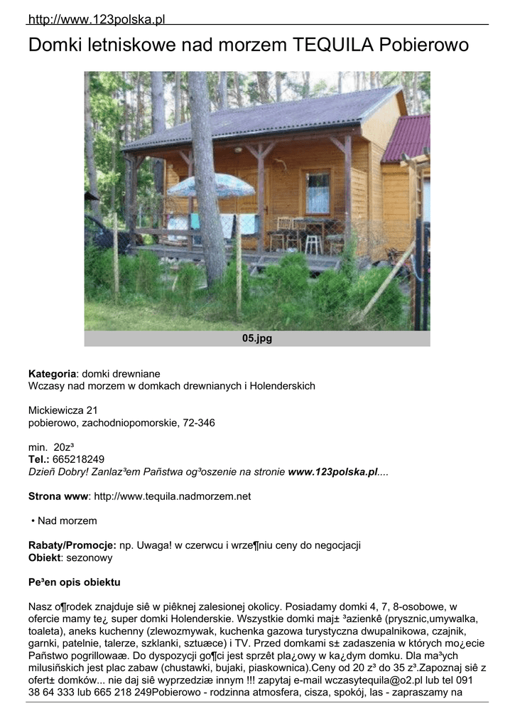 http://www.123polska.pl Domki letniskowe nad morzem TEQUILA Pobierowo 05.jpg Kategoria: domki drewniane Wczasy nad morzem w domkach drewnianych i Holenderskich Mickiewicza 21 pobierowo, zachodniopomorskie, 72-346 min. 20z³ Tel.: 665218249 Dzieñ Dobry! Zanlaz³em Pañstwa og³oszenie na stronie www.123polska.pl.... Strona www: http://www.tequila.nadmorzem.net • Nad morzem Rabaty/Promocje: np. Uwaga! w czerwcu i wrze¶niu ceny do negocjacji Obiekt: sezonowy Pe³en opis obiektu Nasz o¶rodek znajduje siê w piêknej zalesionej okolicy. Posiadamy domki 4, 7, 8-osobowe, w ofercie mamy te¿ super domki Holenderskie. Wszystkie domki maj± ³azienkê (prysznic,umywalka, toaleta), aneks kuchenny (zlewozmywak, kuchenka gazowa turystyczna dwupalnikowa, czajnik, garnki, patelnie, talerze, szklanki, sztuæce) i TV. Przed domkami s± zadaszenia w których mo¿ecie Pañstwo pogrillowaæ. Do dyspozycji go¶ci jest sprzêt pla¿owy w ka¿dym domku. Dla ma³ych milusiñskich jest plac zabaw (chustawki, bujaki, piaskownica).Ceny od 20 z³ do 35 z³.Zapoznaj siê z ofert± domków... nie daj siê wyprzedziæ innym !!! zapytaj e-mail [email protected] lub tel 091 38 64 333 lub 665 218 249Pobierowo - rodzinna atmosfera, cisza, spokój, las - zapraszamy na http://www.123polska.pl wczasy nad morzem !!Pobieramy op³ate klimatyczna na miejscu od wszystkich go¶ci.Zaliczki 20% pe³nej kwoty prosze wp³acaæ przekazem pocztowym. Mamy równie¿ w ofercie Dom Go¶cinny Korona - Pokoje z ³azienkami www.korona.nadmorzem.net P O L E C A M Y Oferowane pokoje: Wy¿ywienie: • Aneks kuchenny w pokojach/domkach Na terenie obiektu: • grill • parking W KA¯DYM pokoju apartamencie domku: • toaleta • ³azienka • prysznic • lodówka • czajnik elektryczny • garnki • podstawowe naczynia • sztuæce • telewizor W pobli¿u: do sklepu: 0.1 km