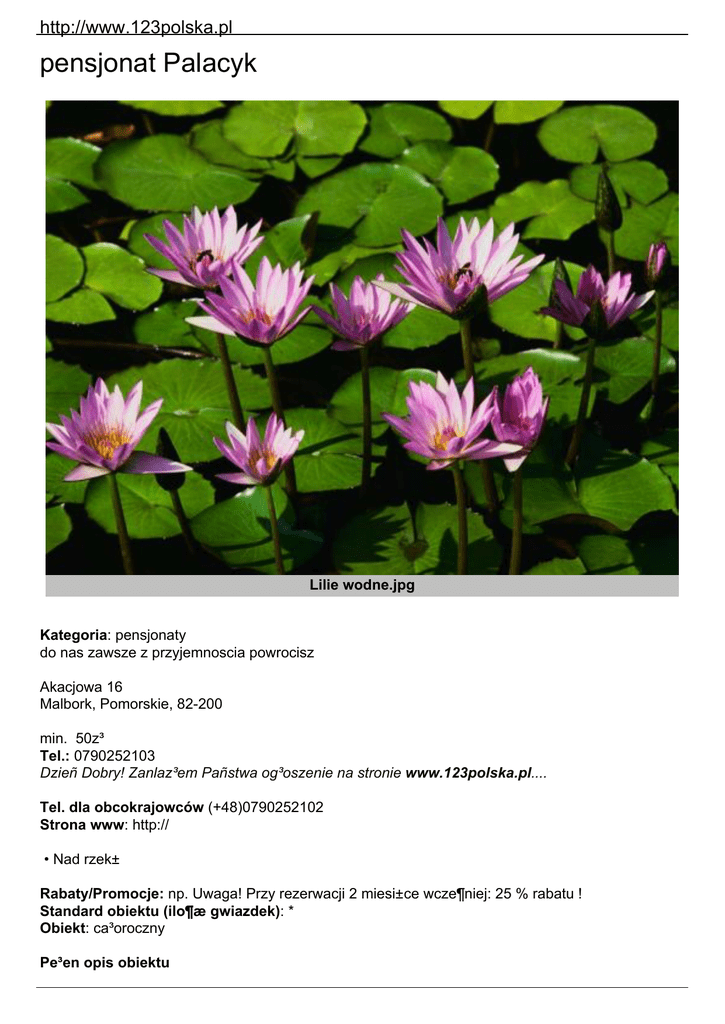 http://www.123polska.pl pensjonat Palacyk Lilie wodne.jpg Kategoria: pensjonaty do nas zawsze z przyjemnoscia powrocisz Akacjowa 16 Malbork, Pomorskie, 82-200 min. 50z³ Tel.: 0790252103 Dzieñ Dobry! Zanlaz³em Pañstwa og³oszenie na stronie www.123polska.pl.... Tel. dla obcokrajowców (+48)0790252102 Strona www: http:// • Nad rzek± Rabaty/Promocje: np. Uwaga! Przy rezerwacji 2 miesi±ce wcze¶niej: 25 % rabatu ! Standard obiektu (ilo¶æ gwiazdek): * Obiekt: ca³oroczny Pe³en opis obiektu http://www.123polska.pl Pensjonat Pa³acyk polozony na osiedlu domkow jednorodzinnych w Malborku posiada 3 pokoje 2 osobowe w cenie od 50 do 50 zlotych za osobe doba , pokoje posiadaja wlasne natryski toalety oraz tv sat i radio oraz 2 pokoje 3 osobowe w cenie od 50 do 50 zlotych za osobe doba , pokoje posiadaja wlasne natryski toalety oraz tv sat i radio oraz 1 pokuj 4 osobowy w cenie od 50 do 50 zlotych za osobe doba , pokoj posiada wlasny natrysk toalete oraz tv sat i radio . polozony jest 200 metrow od rzeki nogat i 500 metrow od zamku krzyzackiego posiada prywatny parking sklep miejsce na grilowanie oraz jest mozliwosc przyjazdu ze zwierzetami Oferowane pokoje: 2-osobowe: 3 pokoi(-je) 3-osobowe: 2 pokoi(-je) 4-osobowe: 1 pokoi(-je) Cena za ca³o¶æ: Cena za dobê (za ca³o¶æ): 1000 z³ Cena za miesi±c (za ca³o¶æ): 30000 z³ Ca³kowieta ilo¶c miejsc noclegowych: ok. 16 Cena za osobê (w SEZONIE): w pokoju 2-osob: 50 z³ w pokoju 3-osob: 50 z³ w pokoju 4 osob: 50 z³ Cena za ma³e dzieci: - dzieci do 4 lat GRATIS ! Cena za dzieci: - dzieci do 14 lat 50-75% ceny Cennik: inne np. od 25.12 do 2.01 - +20% od 23.06 do 31.08 - -5% dla studentów Mo¿liwo¶æ wykupienia obiadów w cenie 12z³/os...; ceny do negocjacji; cena za ca³y domek 200z³/db; cena za ³ó¿ko dostawiane 30z³; sylwester +20%, ..., Za basen symboliczna op³ata... Na terenie obiektu: • mo¿liwo¶æ przechowania rowerów • parking Pozosta³e: • mówimy po angielsku • mówimy po rosyjsku W KA¯DYM pokoju apartamencie domku: • toaleta • ³azienka • prysznic • klimatyzacja • czajnik elektryczny • telewizor • balkon W NIEKTÓRYCH pokojach apartamentach domkach: • czajnik elektryczny • balkon http://www.123polska.pl Opis otoczenia np. O¶rodek le¿y w przepiêknie po³o¿onej dolinie....., tu¿ nad potokiem..... Z tarasu widaæ szczyty gór..., które szczególnie piêknie prezentuj± siê w blasku zachodz±cego s³oñca. Bezpo¶rednie s±siedztwo jeziora sprawia, ¿e powietrze latem jest..... Atrakcje turystyczne: np. 2 km do Jaskini Jana, ruiny zamku XIII w., gor±ce ¬ród³a Czarne, itd. Dojazd: np. szczegó³y na stronie internetowej np. Jad±c tras± z ... do ..., ok. 30 km od ....., skrêæ w lewo w stronê wsi ... . Po przejechaniu 1,5km w±sk± szos± skrêæ ponownie w lewo na brukowana drogê, która nale¿y przejechaæ kolejne 1,5km do skraju lasu, n W pobli¿u: do sklepu: 0.1 km do supermarketu / marketu: 0,5 km do morza: 40 km do pla¿y strze¿onej: 1 km do wypozyczalni sprzêtu wodnego: 1 km szlaki turystyczne: 100 km restauracje / kawiarnie / bary: 1 km dyskoteka / dancing / klub nocny: 1 km s³u¿by medyczne: 0.5 km poczta: 0,5 km bank / bankomat: 1 km Internet Cafe: 1 km dworzec / przystanek PKS: 1.2 km dworzec PKP: 1,2 km parking strze¿ony (je¿eli brak w obiekcie): 0,4 km