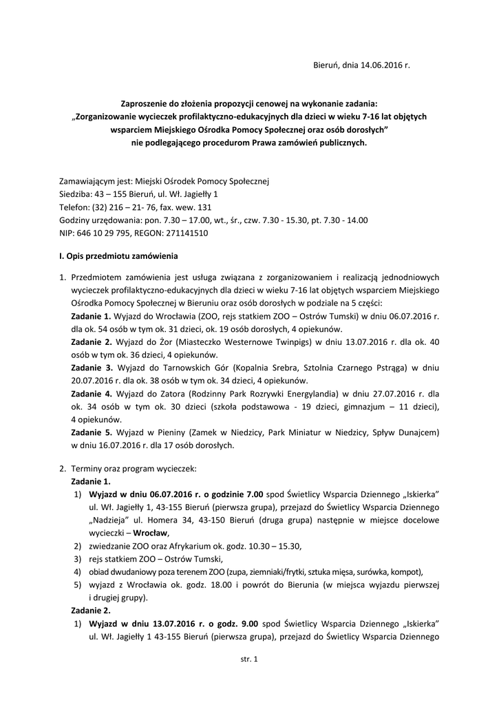 Bieruń, dnia 14.06.2016 r. Zaproszenie do złożenia propozycji cenowej na wykonanie zadania: „Zorganizowanie wycieczek profilaktyczno-edukacyjnych dla dzieci w wieku 7-16 lat objętych wsparciem Miejskiego Ośrodka Pomocy Społecznej oraz osób dorosłych” nie podlegającego procedurom Prawa zamówień publicznych. Zamawiającym jest: Miejski Ośrodek Pomocy Społecznej Siedziba: 43 – 155 Bieruń, ul. Wł. Jagiełły 1 Telefon: (32) 216 – 21- 76, fax. wew. 131 Godziny urzędowania: pon. 7.30 – 17.00, wt., śr., czw. 7.30 - 15.30, pt. 7.30 - 14.00 NIP: 646 10 29 795, REGON: 271141510 I. Opis przedmiotu zamówienia 1. Przedmiotem zamówienia jest usługa związana z zorganizowaniem i realizacją jednodniowych wycieczek profilaktyczno-edukacyjnych dla dzieci w wieku 7-16 lat objętych wsparciem Miejskiego Ośrodka Pomocy Społecznej w Bieruniu oraz osób dorosłych w podziale na 5 części: Zadanie 1. Wyjazd do Wrocławia (ZOO, rejs statkiem ZOO – Ostrów Tumski) w dniu 06.07.2016 r. dla ok. 54 osób w tym ok. 31 dzieci, ok. 19 osób dorosłych, 4 opiekunów. Zadanie 2. Wyjazd do Żor (Miasteczko Westernowe Twinpigs) w dniu 13.07.2016 r. dla ok. 40 osób w tym ok. 36 dzieci, 4 opiekunów. Zadanie 3. Wyjazd do Tarnowskich Gór (Kopalnia Srebra, Sztolnia Czarnego Pstrąga) w dniu 20.07.2016 r. dla ok. 38 osób w tym ok. 34 dzieci, 4 opiekunów. Zadanie 4. Wyjazd do Zatora (Rodzinny Park Rozrywki Energylandia) w dniu 27.07.2016 r. dla ok. 34 osób w tym ok. 30 dzieci (szkoła podstawowa - 19 dzieci, gimnazjum – 11 dzieci), 4 opiekunów. Zadanie 5. Wyjazd w Pieniny (Zamek w Niedzicy, Park Miniatur w Niedzicy, Spływ Dunajcem) w dniu 16.07.2016 r. dla 17 osób dorosłych. 2. Terminy oraz program wycieczek: Zadanie 1. 1) Wyjazd w dniu 06.07.2016 r. o godzinie 7.00 spod Świetlicy Wsparcia Dziennego „Iskierka” ul. Wł. Jagiełły 1, 43-155 Bieruń (pierwsza grupa), przejazd do Świetlicy Wsparcia Dziennego „Nadzieja” ul. Homera 34, 43-150 Bieruń (druga grupa) następnie w miejsce docelowe wycieczki – Wrocław, 2) zwiedzanie ZOO oraz Afrykarium ok. godz. 10.30 – 15.30, 3) rejs statkiem ZOO – Ostrów Tumski, 4) obiad dwudaniowy poza terenem ZOO (zupa, ziemniaki/frytki, sztuka mięsa, surówka, kompot), 5) wyjazd z Wrocławia ok. godz. 18.00 i powrót do Bierunia (w miejsca wyjazdu pierwszej i drugiej grupy). Zadanie 2. 1) Wyjazd w dniu 13.07.2016 r. o godz. 9.00 spod Świetlicy Wsparcia Dziennego „Iskierka” ul. Wł. Jagiełły 1 43-155 Bieruń (pierwsza grupa), przejazd do Świetlicy Wsparcia Dziennego str. 1 „Nadzieja” ul. Homera 34, 43-150 Bieruń (druga grupa) następnie w miejsce docelowe wycieczki – Żory, 2) pobyt w Miasteczku Westernowym Twinpigs 10.30 – 15.00, 3) obiad jednodaniowy na terenie miasteczka (ziemniaki/frytki, sztuka mięsa, surówka, kompot) ok. godz. 13.00, 4) wyjazd z Żor ok. godz. 15.00, 5) ognisko z kiełbaskami w drodze powrotnej, 6) powrót do Bierunia (w miejsca wyjazdu pierwszej i drugiej grupy). Zadanie 3. 1) Wyjazd w dniu 20.07.2016 r. o godz. 9.00 spod Świetlicy Wsparcia Dziennego „Iskierka” ul. Wł. Jagiełły 1, 43-155 Bieruń (pierwsza grupa), przejazd do Świetlicy Wsparcia Dziennego „Nadzieja” ul. Homera 34, 43-150 Bieruń (druga grupa) następnie w miejsce docelowe wycieczki - Tarnowskie Góry, 2) zwiedzanie z przewodnikiem: Kopalnia Srebra, Skansen maszyn parowych oraz spływ łodziami Sztolnią Czarnego Pstrąga, spacer do Zamku w Starych Tarnowicach, spacer po Rynku ok. 10.30 – 17.00, 3) obiad dwudaniowy (zupa, ziemniaki/frytki, sztuka mięsa, surówka, kompot), ok. godz. 14.00, 4) wyjazd z Tarnowskich Gór ok. godz. 17.00 i powrót do Bierunia (w miejsca wyjazdu pierwszej i drugiej grupy). Zadanie 4. 1) Wyjazd w dniu 27.07.2016 r. o godz. 8.15 spod Świetlicy Wsparcia Dziennego „Iskierka” ul. Wł. Jagiełły 1, 43-155 Bieruń (pierwsza grupa), przejazd do Świetlicy Wsparcia Dziennego „Nadzieja” ul. Homera 34, 43-150 Bieruń (druga grupa) w miejsce docelowe wycieczki – Zator, 2) pobyt w Rodzinnym Parku Rozrywki Energylandia ok. godz. 09.00-17.00, 3) obiad jednodaniowy na terenie miasteczka (ziemniaki/frytki, sztuka mięsa, surówka, kompot) ok. godz. 13.00, 4) wyjazd z Zatora ok. godz. 17.00 i powrót do Bierunia (w miejsca wyjazdu pierwszej i drugiej grupy). Zadanie 5. 1) Wyjazd w dniu 16.07.2016 r. o godz. 6.00 spod Świetlicy Wsparcia Dziennego „Iskierka” ul. Wł. Jagiełły 1, 43-155 Bieruń (pierwsza grupa), przejazd do Świetlicy Wsparcia Dziennego „Nadzieja” ul. Homera 34, 43-150 Bieruń (druga grupa) do Niedzicy (może ulec zmianie kolejność zwiedzania), 2) zwiedzanie Zamku w Niedzicy, 3) zwiedzanie Parku Miniatur w Niedzicy, 4) Spływ Dunajcem (tratwy) – krótsza trasa Sromowce Niżne do Szczawnicy, 5) dwudaniowy obiad (zupa + kluski i rolada lub frytki i kotlet de volaille lub frytki i kurczak + surówki), spacer po Szczawnicy, 6) wieczorna biesiada przy ognisku (kiełbaski), 7) wyjazd ze Szczawnicy ok. godz. 20.00 i powrót do Bierunia (w miejsca wyjazdu pierwszej i drugiej grupy). 3. W sytuacji, gdyby np. z przyczyn organizacyjnych, technicznych zrealizowanie wycieczki zgodnie z ww. planem okazało się niemożliwe do wykonania, dopuszcza się możliwość dokonania korekty planu wycieczki. Korekta planu winna być skonsultowana z Zamawiającym i wymaga jego zgody. str. 2 4. 5. 6. 7. Może ona polegać na zastosowaniu zamiennych rozwiązań w stosunku do opisanych powyżej (np. na zaproponowaniu odmiennych od przyjętych powyżej obiektów zwiedzania), nie może jednak prowadzić do wykroczenia poza przedmiot zamówienia, nie może powodować wzrostu wynagrodzenia Wykonawcy zaproponowanego w ofercie. Niniejsze zamówienie obejmuje ponadto: 1) przejazd jednym środkiem transportu przystosowanym do bezpiecznego i komfortowego przewozu osób. Pojazd, którym będzie odbywał się przewóz, musi spełniać warunki techniczne i wymagania zapewniające bezpieczeństwo ruchu dr