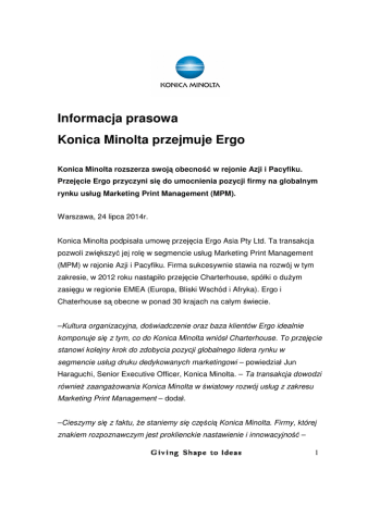 Informacja prasowa Konica Minolta przejmuje Ergo Konica Minolta rozszerza swoją obecność w rejonie Azji i Pacyfiku. Przejęcie Ergo przyczyni się do umocnienia pozycji firmy na globalnym rynku usług Marketing Print Management (MPM). Warszawa, 24 lipca 2014r. Konica Minolta podpisała umowę przejęcia Ergo Asia Pty Ltd. Ta transakcja pozwoli zwiększyć jej rolę w segmencie usług Marketing Print Management (MPM) w rejonie Azji i Pacyfiku. Firma sukcesywnie stawia na rozwój w tym zakresie, w 2012 roku nastąpiło przejęcie Charterhouse, spółki o dużym zasięgu w regionie EMEA (Europa, Bliski Wschód i Afryka). Ergo i Chaterhouse są obecne w ponad 30 krajach na całym świecie. –Kultura organizacyjna, doświadczenie oraz baza klientów Ergo idealnie komponuje się z tym, co do Konica Minolta wniósł Charterhouse. To przejęcie stanowi kolejny krok do zdobycia pozycji globalnego lidera rynku w segmencie usług druku dedykowanych marketingowi – powiedział Jun Haraguchi, Senior Executive Officer, Konica Minolta. – Ta transakcja dowodzi również zaangażowania Konica Minolta w światowy rozwój usług z zakresu Marketing Print Management – dodał. –Cieszymy się z faktu, że staniemy się częścią Konica Minolta. Firmy, której znakiem rozpoznawczym jest proklienckie nastawienie i innowacyjność – 1 powiedział Eugene Cora, CEO w Ergo. Konica Minolta należy do liderów europejskiego rynku cyfrowego druku produkcyjnego. Firma jest również obecna w segmencie usług z zakresu Marketing Print Management (MPM), które pozwalają na usprawnienie procesów związanych z produkcją i rozszerzenie oferty produktów dostosowanych do potrzeb branży marketingowej. *** Konica Minolta Business Solutions Polska Sp. z o.o. należy do Konica Minolta, Inc. z siedzibą w Japonii. Konica Minolta dostarcza kompleksowe rozwiązania i usługi dla biznesu, usprawniające procesy związane z drukowaniem, kopiowaniem i archiwizacją dokumentów. Konica Minolta jest producentem i dostawcą drukarek, urządzeń wielofunkcyjnych i cyfrowych systemów produkcyjnych monochromatycznych i kolorowych. Firma stale powiększa swoją ofertę, koncentrując się na urządzeniach do druku w kolorze. Kontakt dla mediów: Magdalena Rudecka PR Manager Konica Minolta Business Solutions Polska Sp. z o.o. tel. 22 560 33 30, +48 668 133 251 e-mail: [email protected] Katarzyna Dawidowska 2 Fischer&Zubek PR Partners Sp. z o.o. tel. 22 551 54 71, +48 503 004 066 e-mail: [email protected] 3