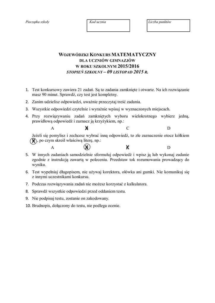Pieczątka szkoły Liczba punktów Kod ucznia WOJEWÓDZKI KONKURS MATEMATYCZNY DLA UCZNIÓW GIMNAZJÓW W ROKU SZKOLNYM 2015/2016 STOPIEŃ SZKOLNY – 09 LISTOPAD 2015 R. 1. Test konkursowy zawiera 21 zadań. Są to zadania zamknięte i otwarte. Na ich rozwiązanie masz 90 minut. Sprawdź, czy test jest kompletny. 2. Zanim udzielisz odpowiedzi, uważnie przeczytaj treść zadania. 3. Wszystkie odpowiedzi czytelnie i wyraźnie wpisuj w wyznaczonych miejscach. 4. Przy rozwiązywaniu zadań zamkniętych wyboru wielokrotnego wybierz jedną, prawidłową odpowiedź i zaznacz ją krzyżykiem, np.: A XB C D Jeżeli się pomylisz i zechcesz wybrać inną odpowiedź, to złe zaznaczenie otocz kółkiem XB , po czym skreśl właściwą literę, np.: A XB XC D 5. W innych zadaniach samodzielnie sformułuj odpowiedź i wpisz ją lub wykonaj zadanie zgodnie z instrukcją zawartą w poleceniu. Przedstaw tok rozumowania prowadzący do wyniku. 6. Test wypełniaj długopisem, nie używaj korektora, ołówka ani gumki. Nie komunikuj się z innymi uczestnikami konkursu. 7. Podczas rozwiązywania zadań nie możesz korzystać z kalkulatora. 8. Sprawdź wszystkie odpowiedzi przed oddaniem testu. 9. Nie podpisuj testu, zostanie on zakodowany. 10. Brudnopis, dołączony do testu, nie podlega ocenie. WOJEWÓDZKIE KONKURSY PRZEDMIOTOWE 2015/2016 – GIMNAZJUM STOPIEŃ SZKOLNY Zadanie 1. (1 p.) 3 3 Ile jest liczb wymiernych wśród liczb √24; √36; 0,(73); √3 8; A. 8 B. 7 C. 5 √5 √25 ; 2 ; 4 3 0,66666…; 0; -14 ? D. 6 Zadanie 2. (1 p.) Pięciocyfrowa liczba naturalna 24a8b jest podzielna przez 4, przez 5 i przez 9. Suma cyfr a i b jest równa A. 13 B. 10 C. 9 D. 4 Zadanie 3. (1 p.) Kąty α i β są kątami przyległymi. Kąt wyznaczony przez dwusieczne kątów α i β ma miarę A. 180o B. 45o C. 90o D. 60o Zadanie 4. (1 p.) Liczba 1 3 jest równa A. 1 3 B. 3 1 C. 3 1 D. 3 1 Zadanie 5. (1 p.) Miara kąta wewnętrznego wielokąta foremnego jest równa 150 o. Ile boków ma ten wielokąt? A. 8 B. 16 C. 10 D. 12 Zadanie 6. (1 p.) Powierzchnia działki rekreacyjnej jest równa 3,8 ∙ 103 m2. Ile to arów? A. 0,38 a B. 380 a C. 3,8 a D. 38 a Zadanie 7. (1p.) W szufladzie leżały klocki. Dziecko zabrało 6 klocków, co stanowiło 2 czwartej części liczby 3 wszystkich klocków. Ile klocków było w tej szufladzie? A. 9 B. 36 C. 24 D. 18 Zadanie 8. (1p.) Trójkąt prostokątny można utworzyć z odcinków o długościach A. 5, 5, √10 B. √2, √2, 2 C. √3, √3, 3 D. 2, 3, 4 Zadanie 9. (1p.) Dwie jednakowe maszyny zużywają 2 litry smaru w ciągu 2 dni. Ile litrów smaru zużyje 7 takich maszyn w ciągu 20 dni, przy stałym zużyciu przez każdą maszynę? A. 70 B. 35 C. 140 D. 280 Zadanie 10. (1p.) Janek ma o cztery lata więcej niż wynosi podwojony wiek jego siostry. Za cztery lata będzie od niej starszy o jedenaście lat. Ile lat ma teraz Janek? A. 7 B. 10 C. 16 2z7 D. 18 WOJEWÓDZKIE KONKURSY PRZEDMIOTOWE 2015/2016 – GIMNAZJUM STOPIEŃ SZKOLNY Zadanie 11. (1 p.) Cena akcji zmalała w ciągu dnia o 60%. Cena na początku dnia to A. B. C. D. 40% końcowej ceny akcji. 60% końcowej ceny akcji. 250% końcowej ceny akcji. 150% końcowej ceny akcji. Zadanie 12. (1 p.) Prosta m jest styczną do okręgu w punkcie B, a kąt α = 110o. Miara kąta β zaznaczonego na rysunku jest równa A. 35o B. 45o C. 55o D. 65o Zadanie 13. (1 p.) Przekształcając wyrażenie 𝑡 = 𝑎𝑥 − 𝑏𝑥 i wyznaczając x, otrzymasz A. x t a b B. x a b t C. x t b a D. x t a b Zadanie 14. (1 p.) Każdy równoległobok nie będący rombem ani prostokątem A. B. C. D. ma dwie osie symetrii i środek symetrii. ma dwie osie symetrii i nie ma środka symetrii. nie ma osi symetrii, ale ma środek symetrii. nie ma osi symetrii i nie ma środka symetrii. Zadanie 15. (1 p.) Które z podanych równań trzeba dopisać do równania x 2 y 1 , aby otrzymać układ oznaczony? A. x 2 y 4 B. x 2 y 1 C. x 2 y 3 D. x 2 y 1 Zadanie 16. (1 p.) Na przygotowanie maszyny do produkcji pewnych detali potrzeba 3 minuty. Po uruchomieniu maszyna wytwarza jeden detal w ciągu 2,5 minuty. Funkcja wyrażająca całkowity czas potrzebny do produkcji x detali wyraża się wzorem A. y 3x 2,5 B. y 3x 2,5 C. y 5 x3 2 D. y Zadanie 17. (1 p.) Ile wierzchołków ma graniastosłup o 54 krawędziach? A. 18 B. 36 C. 28 Zadanie 18. (1 p.) Pole trapezu przedstawionego na rysunku jest równe A. 2xy + 1,5x B. 2xy + 3x C. 4xy + 3x D. 2y + 1,5x 3z7 D. 27 5 x3 2 WOJEWÓDZKIE KONKURSY PRZEDMIOTOWE 2015/2016 – GIMNAZJUM STOPIEŃ SZKOLNY Zadanie 19. (4 p.) 112016 112015 Dane są liczby a oraz b – najmniejsza dwucyfrowa liczba pierwsza. Oblicz 112015 odległość na osi liczbowej między liczbą odwrotną do a i liczbą przeciwną do b. Wynik przedstaw w najprostszej postaci. 4z7 WOJEWÓDZKIE KONKURSY PRZEDMIOTOWE 2015/2016 – GIMNAZJUM STOPIEŃ SZKOLNY Zadanie 20. (4 p.) Pole zamalowanego wycinka koła o środku w punkcie S, zaznaczonego na rysunku, jest równe 14π cm2. Oblicz pole rombu SPQR. R Q 45° S 5z7 P WOJEWÓDZKIE KONKURSY PRZEDMIOTOWE 2015/2016 – GIMNAZJUM STOPIEŃ SZKOLNY Zadanie 21. (4 p.) Zbiornik o pojemności 144 litrów ma kształt graniastosłupa, którego podstawą jest sześciokąt foremny. Stosunek wysokości pojemnika do długości krawędzi podstawy wynosi 3 : 2 . Jaką wysokość ma zbiornik? Odpowiedź podaj z jednostką. 6z7 WOJEWÓDZKIE KONKURSY PRZEDMIOTOWE 2015/2016 – GIMNAZJUM STOPIEŃ SZKOLNY Brudnopis (nie jest oceniany) 7z7