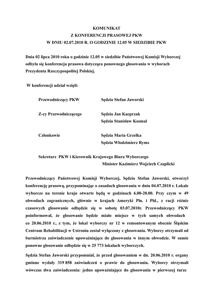 KOMUNIKAT Z KONFERENCJI PRASOWEJ PKW W DNIU 02.07.2010 R. O GODZINIE 12.05 W SIEDZIBIE PKW Dnia 02 lipca 2010 roku o godzinie 12.05 w siedzibie Państwowej Komisji Wyborczej odbyła się konferencja prasowa dotycząca ponownego głosowania w wyborach Prezydenta Rzeczypospolitej Polskiej. W konferencji udział wzięli: Przewodniczący PKW Sędzia Stefan Jaworski Z-cy Przewodniczącego Sędzia Jan Kacprzak Sędzia Stanisław Kosmal Członkowie Sędzia Maria Grzelka Sędzia Włodzimierz Ryms Sekretarz PKW i Kierownik Krajowego Biura Wyborczego Minister Kazimierz Wojciech Czaplicki Przewodniczący Państwowej Komisji Wyborczej, Sędzia Stefan Jaworski, otworzył konferencję prasową, przypominając o zasadach głosowania w dniu 04.07.2010 r. Lokale wyborcze na terenie kraju otwarte będą w godzinach 6.00-20.00. Przy czym w 49 obwodach zagranicznych, głównie w krajach Ameryki Płn. i Płd., z racji różnic czasowych głosowanie odbędzie się w sobotę 03.07.2010r. Przewodniczący PKW poinformował, że głosowanie będzie miało miejsce w tych samych obwodach co 20.06.2010 r., z tym, że lokal wyborczy nr 12 w remontowanym obecnie Śląskim Centrum Rehabilitacji w Ustroniu został wyłączony z głosowania. Wyborcy otrzymali od burmistrza zaświadczenie upoważniające do głosowania w innym obwodzie. W sumie ponowne głosowanie odbędzie się w 25 773 lokalach wyborczych. Sędzia Stefan Jaworski przypomniał, że przed głosowaniem w dn. 20.06.2010 r. organy gminne wydały 319 858 zaświadczeń o prawie do głosowania. Wyborcy otrzymali wówczas dwa zaświadczenia: jedno upoważniające do głosowania w pierwszej turze i drugie - upoważniające do głosowania w dniu 04.07.2010r. Dnia 20.06.2010 r. na podstawie zaświadczeń głosowało 297 622 osób. Urzędy gmin poinformowały, że w przeciągu ostatnich dwóch tygodni wydały ponad 40 tys. zaświadczeń upoważniających do głosowania, a dokument taki można odbierać w dniu 02.07.20001 r. do zamknięcia urzędów. Na zaświadczeniu obligatoryjnie musi widnieć pieczęć urzędu gminy. Osoby okazujące się zaświadczeniami mogą oddać głos w dowolnym obwodzie głosowania na terenie kraju i zagranicą, są natomiast wykreślane ze spisu wyborców właściwego dla stałego miejsca zamieszkania. W dniu głosowania Obwodowe Komisje Wyborcze dopisują wyborców do spisu tylko na podstawie zaświadczenia upoważniającego do głosowania w drugiej turze wyborów. Zaświadczenia o prawie do głosowania z dn. 20.06.2010r. nie są honorowane. Osoby, które są ujęte w spisie wyborców w szpitalach lub domach opieki społecznej, a opuściły te placówki, są dopisywane do spisów na podstawie dokumentów potwierdzających wypis. Do spisu wyborców mogą być też dopisane osoby, które zostały pominięte w spisie, a stale zamieszkują w danym obwodzie i potwierdzi to urząd gminy. Ponadto możliwość głosowania mają obywatele, którzy udokumentują stałe zamieszkiwanie za granicą i wylegitymują się ważnym polskim paszportem. Do spisu wyborców mogą również być dopisane osoby, które zostały przyjęte do szpitala. Przewodniczący PKW przypomniał, że do głosowania upoważnia wylegitymowanie się przed OKW dokumentem tożsamości ze zdjęciem. Sędzia Stefan Jaworski zaprezentował kartę do glosowania, na której widnieją nazwiska kandydatów w kolejności alfabetycznej. Głosowanie odbywa się poprzez postawienie znaku X przy nazwisku tylko jednego kandydata. Przewodniczący poinformował, że na każdej karcie do głosowania musi obowiązkowo widnieć pieczęć PKW i pieczęć Obwodowej Komisji Wyborczej. Sędzia Włodzimierz Ryms zaznaczył, że Państwowa Komisja Wyborcza z satysfakcją odebrała fakt, że pierwsza tura wyborów prezydenckich na terenach popowodziowych przebiegła bez zakłóceń. Sędzia podkreślił, że sytuacja tam jest stale monitorowana. Stwierdzono znaczną poprawę warunków komunikacyjnych, co pozwala sądzić, że głosowanie przebiegać będzie jeszcze sprawniej niż 20.06.2010 r. Sędzia Jan Kacprzak podkreślił, że od momentu wejścia w życie nowej Konstytucji Rzeczpospolitej Polskiej, tj. od 17 października 1997 roku, organem mającym prawo ingerencji w działalność mediów w czasie kampanii i ciszy wyborczej jest Krajowa Rada Radiofonii i Telewizji, a nie PKW. PKW jest organem opiniodawczym i podejmuje takie działania w przypadku własnych wątpliwości bądź zapytań z zewnątrz. Sędzia Maria Grzelka dokładnie wyjaśniła kwestię ciszy wyborczej, szczególnie w odniesieniu do akcji Wielkiej Orkiestry Świątecznej Pomocy, która w dniu ponownego głosowania na Prezydenta RP ma kwestować na rzecz powodzian. Zdaniem PKW prowadzenie tego typu działalności nie jest naruszeniem ciszy wyborczej. Jednak organizatorzy tej akcji muszą zadbać, by tego typu kwesta nie stała się okazją do agitacji. PKW uznała również, iż dopuszczalna jest licytacja przez Wielką Orkiestrę Świątecznej Pomocy egzemplarza Konstytucji Rzeczypospolitej Polskiej z podpisami obu kandydatów. Fakt ten nie będzie naruszeniem ciszy wyborczej. Sędzia Maria Grzelka podkreśliła, że w dniu głosowania można propagować udział w głosowaniu, jednak nie powinni tego dokonywać kandydaci na Prezydenta RP, osoby z ich komitetów, a także osoby publiczne, których poglądy lub sympatie wobec danego kandydata są powszechnie znane. Sekretarz PKW Minister Kazimierz W. Czaplicki poruszył kwestię głosowania w miejscach letniego wypoczynku. Poinformował, że PKW podjęła działania, aby obwodowe komisje wyborcze zostały wyposażone w dodatkowe karty do głosowania. W sumie wydano ich tam ponad 2 mln. Dystrybucją ok. 10% rezerwy zajmą się burmistrzowie i wójtowie gmin. Sędzia Maria Grzelka wyjaśniła także wątpliwości dziennikarzy dotyczące relacjonowania spotkania szefa polskiej dyplomacji Radosława Sikorskiego z Sekretarz Stanu USA Hillary Clinton. Relacjonowanie ewentualnego udziału w