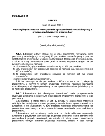 Dz.U.03.90.844 USTAWA z dnia 13 marca 2003 r. o szczególnych zasadach rozwiązywania z pracownikami stosunków pracy z przyczyn niedotyczących pracowników (Dz. U. z dnia 22 maja 2003 r.) (nieoficjalny tekst jednolity) Art. 1. 1. Przepisy ustawy stosuje się w razie konieczności rozwiązania przez pracodawcę zatrudniającego co najmniej 20 pracowników stosunków pracy z przyczyn niedotyczących pracowników, w drodze wypowiedzenia dokonanego przez pracodawcę, a także na mocy porozumienia stron, jeżeli w okresie nieprzekraczającym 30 dni zwolnienie obejmuje co najmniej: 1) 10 pracowników, gdy pracodawca zatrudnia mniej niż 100 pracowników, 2) 10% pracowników, gdy pracodawca zatrudnia co najmniej 100, jednakże mniej niż 300 pracowników, 3) 30 pracowników, gdy pracodawca zatrudnia co najmniej 300 lub więcej pracowników - zwanego dalej "grupowym zwolnieniem". 2. Liczby odnoszące się do pracowników, o których mowa w ust. 1, obejmują pracowników, z którymi w ramach grupowego zwolnienia następuje rozwiązanie stosunków pracy z inicjatywy pracodawcy na mocy porozumienia stron, jeżeli dotyczy to co najmniej 5 pracowników. Art. 2. 1. Pracodawca jest obowiązany skonsultować zamiar przeprowadzenia grupowego zwolnienia z zakładowymi organizacjami związkowymi działającymi u tego pracodawcy. 2. Konsultacja, o której mowa w ust. 1, dotyczy w szczególności możliwości uniknięcia lub zmniejszenia rozmiaru grupowego zwolnienia oraz spraw pracowniczych związanych z tym zwolnieniem, w tym zwłaszcza możliwości przekwalifikowania lub przeszkolenia zawodowego, a także uzyskania innego zatrudnienia przez zwolnionych pracowników. 3. Pracodawca jest obowiązany zawiadomić na piśmie zakładowe organizacje związkowe o przyczynach zamierzonego grupowego zwolnienia, liczbie zatrudnionych pracowników i grupach zawodowych, do których oni należą, grupach zawodowych pracowników objętych zamiarem grupowego zwolnienia, okresie, w ciągu którego nastąpi takie zwolnienie, proponowanych kryteriach doboru pracowników do grupowego zwolnienia, kolejności dokonywania zwolnień pracowników, propozycjach rozstrzygnięcia spraw pracowniczych związanych z zamierzonym grupowym zwolnieniem, a jeżeli obejmują one świadczenia pieniężne, pracodawca jest obowiązany dodatkowo przedstawić sposób ustalania ich wysokości. 4. Pracodawca przekazuje zakładowym organizacjom związkowym informacje, o których mowa w ust. 3, w terminie umożliwiającym tym organizacjom zgłoszenie w ramach konsultacji propozycji dotyczących spraw określonych w ust. 2. 5. W trakcie konsultacji pracodawca jest obowiązany przekazać zakładowym organizacjom związkowym także inne niż określone w ust. 3 informacje, jeżeli mogą one mieć wpływ na przebieg konsultacji oraz treść porozumienia, o którym mowa w art. 3. 6. Pracodawca przekazuje na piśmie właściwemu powiatowemu urzędowi pracy informacje, o których mowa w ust. 3, z wyłączeniem informacji dotyczących sposobu ustalania wysokości świadczeń pieniężnych przysługujących pracownikom. 7. Jeżeli u danego pracodawcy nie działają zakładowe organizacje związkowe, uprawnienia tych organizacji w zakresie wynikającym z ust. 1-5 przysługują przedstawicielom pracowników wyłonionym w trybie przyjętym u danego pracodawcy. Art. 3. 1. W terminie nie dłuższym niż 20 dni od dnia zawiadomienia, o którym mowa w art. 2 ust. 3, pracodawca i zakładowe organizacje związkowe zawierają porozumienie. 2. W porozumieniu, o którym mowa w ust. 1, określa się zasady postępowania w sprawach dotyczących pracowników objętych zamiarem grupowego zwolnienia, a także obowiązki pracodawcy w zakresie niezbędnym do rozstrzygnięcia innych spraw pracowniczych związanych z zamierzonym grupowym zwolnieniem. 3. Jeżeli nie jest możliwe uzgodnienie treści porozumienia z wszystkimi zakładowymi organizacjami związkowymi, pracodawca uzgadnia treść porozumienia z organizacjami związkowymi reprezentatywnymi w rozumieniu art. 24125a Kodeksu pracy. 4. Jeżeli nie jest możliwe zawarcie porozumienia zgodnie z ust. 1 i 3, zasady postępowania w sprawach dotyczących pracowników objętych zamiarem grupowego zwolnienia ustala pracodawca w regulaminie, uwzględniając, w miarę możliwości, propozycje przedstawione w ramach konsultacji przez zakładowe organizacje związkowe. 5. Jeżeli u danego pracodawcy nie działają zakładowe organizacje związkowe, zasady postępowania w sprawach dotyczących pracowników objętych zamiarem grupowego zwolnienia ustala pracodawca w regulaminie, po konsultacji z przedstawicielami pracowników wyłonionymi w trybie przyjętym u danego pracodawcy. Art. 4. 1. Pracodawca - po zawarciu porozumienia, a w razie niezawarcia porozumienia po spełnieniu obowiązku, o którym mowa w art. 3 ust. 4 lub 5 zawiadamia na piśmie właściwy powiatowy urząd pracy o przyjętych ustaleniach dotyczących grupowego zwolnienia, w tym o liczbie zatrudnionych i zwalnianych pracowników oraz o przyczynach ich zwolnienia, okresie, w ciągu którego ma być dokonane zwolnienie, a także o przeprowadzonej konsultacji zamierzonego grupowego zwolnienia z zakładowymi organizacjami związkowymi lub z przedstawicielami pracowników wyłonionymi w trybie przyjętym u danego pracodawcy. 2. Kopię zawiadomienia, o którym mowa w ust. 1, pracodawca przekazuje zakładowym organizacjom związkowym. Zakładowe organizacje związkowe mogą przedstawić właściwemu powiatowemu urzędowi pracy swoją opinię w sprawie grupowego zwolnienia. 3. Jeżeli u danego pracodawcy nie działają zakładowe organizacje związkowe, przepis ust. 2 stosuje się odpowiednio do przedstawicieli pracowników wyłonionych w trybie przyjętym u danego pracodawcy. 4. W razie zakończenia działalności pracodawcy wskutek prawomocnego orzeczenia sądowego zawiadomienie, o którym mowa w ust. 1, jest wymagane, gdy z takim wnioskiem wystąpi właściwy powiatowy urz