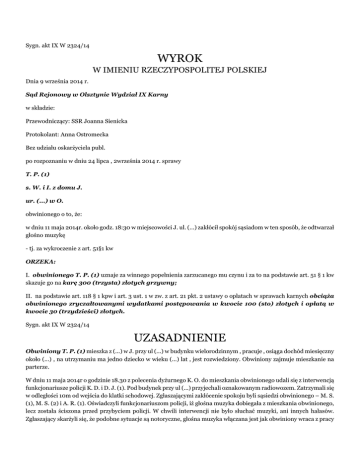 Sygn. akt IX W 2324/14 WYROK W IMIENIU RZECZYPOSPOLITEJ POLSKIEJ Dnia 9 września 2014 r. Sąd Rejonowy w Olsztynie Wydział IX Karny w składzie: Przewodniczący: SSR Joanna Sienicka Protokolant: Anna Ostromecka Bez udziału oskarżyciela publ. po rozpoznaniu w dniu 24 lipca , 2września 2014 r. sprawy T. P. (1) s. W. i I. z domu J. ur. (...) w O. obwinionego o to, że: w dniu 11 maja 2014r. około godz. 18:30 w miejscowości J. ul. (...) zakłócił spokój sąsiadom w ten sposób, że odtwarzał głośno muzykę - tj. za wykroczenie z art. 51§1 kw ORZEKA: I. obwinionego T. P. (1) uznaje za winnego popełnienia zarzucanego mu czynu i za to na podstawie art. 51 § 1 kw skazuje go na karę 300 (trzysta) złotych grzywny; II. na podstawie art. 118 § 1 kpw i art. 3 ust. 1 w zw. z art. 21 pkt. 2 ustawy o opłatach w sprawach karnych obciąża obwinionego zryczałtowanymi wydatkami postępowania w kwocie 100 (sto) złotych i opłatą w kwocie 30 (trzydzieści) złotych. Sygn. akt IX W 2324/14 UZASADNIENIE Obwiniony T. P. (1) mieszka z (...) w J. przy ul (...) w budynku wielorodzinnym , pracuje , osiąga dochód miesięczny około (...) , na utrzymaniu ma jedno dziecko w wieku (...) lat , jest rozwiedziony. Obwiniony zajmuje mieszkanie na parterze. W dniu 11 maja 2014r o godzinie 18.30 z polecenia dyżurnego K. O. do mieszkania obwinionego udali się z interwencją funkcjonariusze policji K. D. i D. J. (1). Pod budynek przy ul (...) przyjechali oznakowanym radiowozem. Zatrzymali się w odległości 10m od wejścia do klatki schodowej. Zgłaszającymi zakłócenie spokoju byli sąsiedzi obwinionego – M. S. (1), M. S. (2) i A. R. (1). Oświadczyli funkcjonariuszom policji, iż głośna muzyka dobiegała z mieszkania obwinionego, lecz została ściszona przed przybyciem policji. W chwili interwencji nie było słuchać muzyki, ani innych hałasów. Zgłaszający skarżyli się, że podobne sytuacje są notoryczne, głośna muzyka włączana jest jak obwiniony wraca z pracy i gra do późnych godzin nocnych, uniemożliwia im wypoczynek i zaśnięcie ich małemu dziecku. Funkcjonariusze policji udali się do mieszkania nr (...). Drzwi otworzył im obwiniony . W mieszkaniu przebywała także jego córka P.. Obwiniony zapytał, czy w czasie interwencji jest cisza. Nie ustosunkował się do zarzutów sąsiadów. Córka obwinionego P. P. (2) uczy się (...), zajęcia ma w tygodniu w godzinach 15-20. Obwiniony pracuje w godzinach 8-16, niekiedy do 18. (d. notatka k 3-3v, zeznania D. J. k 23v-24, K.D. k 23v, A. R. k 24-24v, 4v, M. S. k 24v,9v, M. S. k 24v-25,6v, wyjaśnienia obwinionego k 23-23v, zeznania P. P. k 31-31v) Obwiniony T. P. (1) nie przyznał siędo popełnienia zarzucanego mu czynu. Wyjaśnił, iż jest przekonany, że tego dnia nie było głośno. Oświadczył ,że tego dnia nie włączał muzyki. Nikt jej nie włączał. Jednocześnie wyjaśnił, iż możliwe jest , że w jego mieszkaniu grała muzyka 11 maja 2014r około godziny 18.30. Mieszka z córką. Być może muzyka grała przez chwilę. Przyznał, że sąsiedzi przychodzili do niego ze skargami, najpierw na psa , który głośno szczekał, potem na głośną muzykę. Skargi te nie były uzasadnione. Nie wie czym są podyktowane. Wyjaśnił, że i on i córka słuchają muzyki , ale nie głośno. W toku rozprawy podał, iż wie, że sąsiedzi mają małe dziecko. Wyjaśnił, iż psa oddał marcu, kwietniu lub maju br. Sąd nie dał wiary wyjaśnieniom obwinionego dotyczącym stawianego mu zarzutu , uznając je za przejaw przyjętej przez niego linii obrony zmierzającej do uniknięcia odpowiedzialności za zarzucane mu wykroczenie. Twierdzenia obwinionego pozostają w sprzeczności z zeznaniami świadków- M. S. (1), M. S. (2) i A. R. (1). Zawierają one także wewnętrzną sprzeczność. Obwiniony z jednej stronny zaprzeczył by ktokolwiek w dniu zdarzenia włączał muzykę w jego mieszkaniu , by po chwili przyznać, iż muzyka grała około 18.30. A. R. (1) zeznała, iż mieszka na drugim piętrze w tym samym pionie co obwiniony. Z mieszkania T. P. (1) bardzo często dobiega głośna muzyka. W okresie od marca do połowy maja zdarzało się to codziennie w godzinach 16-22. Muzyka dobiegająca z mieszkania obwinionego była bardzo uciążliwa. W dniu 11 maja 2014r świadek przebywała w domu. W mieszkaniu obwinionego grała muzyka. Świadek w toku rozprawy podała ,że muzyka została ściszona podczas interwencji , gdy funkcjonariusze policji wyszli z jej mieszkania, po odczytaniu zeznań złożonych w toku czynności wyjaśniających, w których twierdziła, iż muzyka grała aż do przyjazdu policji, oświadczyła, iż nie pamięta już kiedy muzyka została ściszona. Jednocześnie zeznała, iż zanim przyjechali policjanci muzyka jeszcze grała. Dodatkowo podała, iż córka obwinionego poinformowała sąsiada, iż obwiniony puszcza muzykę złośliwie za psa , którego musiał się pozbyć. Według świadka w przeszłości sąsiedzi skarżyli się obwinionemu na jego psa, który godzinami wył. M. S. (1) zeznał, iż mieszka nad obwinionym na pierwszym piętrze. Sąsiedztwo obwinionego było dotychczas bardzo uciążliwe, poprawa nastąpiła dopiero po złożeniu przez niego zeznań w niniejszej sprawie. Wcześniej obwiniony puszczał głośno muzykę od 16 do 20. Jest pewien że dobiegała z mieszkania obwinionego, słyszał ją na klatce schodowej przechodząc obok drzwi mieszkania T. P. oraz w swoim lokalu, gdyż „wibrowała podłoga”. Muzyka ta stanowiła dużą uciążliwość, zwłaszcza, że w lutym br żona świadka urodziła dziecko. Zwracał uwagę córce obwinionego, która powiedziała, że muzykę puszcza i ona i ojciec, ona może ją ściszać, ale ojciec nie . Z jej słów wynikało, że ojciec robi to złośliwie. W dniu 11 maja 2014r świadek wrócił do domu po chrzcinach dziecka około 17.30 . Muzyka z mieszkania obwinionego grała bardzo głośno. Wezwali policję. W czasie gdy policjanci podjęl