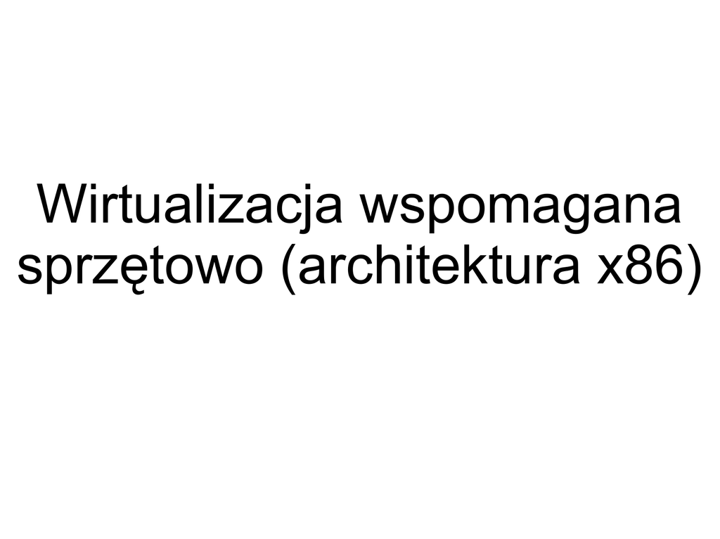 Wirtualizacja wspomagana sprzętowo (architektura x86) problemy z wirtualizacją programową ● odpowiednie wsparcie sprzętowe może rozwiązać te problemy ● ● ● Architektura x86 nie spełnia założeń twierdzenia Popkego-Goldberga Można zbudować na takim komputerze maszynę wirtualną, lecz bez spełnienia warunku wydajności - obsługa tzw. instrukcji krytycznych: – dynamiczna rekompilacja (patching) – parawirtualizacja Nowoczesne metody sprzętowego wspomagania wirtualizacji: AMD-V ● Intel-VT ● Itanium VT-i ● Intel Virtualization Technology ● Zwany także Vanderpool, IVT, VT-x i VMX ● Dwa rodzaje operacji procesora: ● – główne (root mode) – niegłówne (non-root mode) Oba rodzaje operacji mogą wykonywać się we wszystkich trybach uprzywilejowania (Ring 0 Ring 3) Intel Virtualization Technology ● ● ● Przejścia pomiędzy operacjami głównymi a niegłównymi i vice versa nazywają się (odpowiednio) wejściami i wyjściami maszyny wirtualnej (VM entries, VM exits) W trybie niegłównym wyjścia maszyny wirtualnej zachodzą automatycznie dla niektórych (w pewnym stopniu konfigurowalnych) instrukcji i zdarzeń Następuje przesunięcie monitora maszyn wirtualnych z kontekstu gościa do kontekstu gospodarza Intel Virtualization Technology ● ● Wejścia i wyjścia maszyny wirtualnej są zarządzane specjalną strukturą danych - Virtual Machine Control Structure (VMCS) Zawiera obszar stanu gościa i obszar stanu gospodarza (guest-state area, host-state area), posiadające pola określające różne aspekty stanu procesora Intel Virtualization Technology ● ● ● Wejście maszyny wirtualnej polega na załadowaniu danych z obszaru stanu gościa Wyjście maszyny wirtualnej polega na zapamiętaniu stanu w obszarze stanu gościa i załadowaniu danych z obszaru stanu gospodarza VMCS zawiera także pola sterujące obsługą niektórych instrukcji Intel Virtualization Technology Zalety i wady wirtualizacji wspomaganej sprzętowo ● ● Zalety: – efektywność – minimalizuje (idealnie: eliminuje) potrzebę modyfikacji gościnnego oprogramowania Wady: – musi być – problemy z bezpieczeństwem – duże użycie procesora => słaba skalowalność Shadow Page Tables Problem - gościnny OS utrzymuje własne tablice stron. Rozwiązanie - shadow page tables, „przykrywające” tablice stron gościa Shadow Page Tables Shadow Page Tables Shadow Page Tables Wady: desynchronizacja pomiędzy tablicami stron gościa a shadow tables i stąd konieczność ich uaktualniania. Techniki: ➢ write-protecting ➢ virtual TLB ● mechanizm programowy, a nie sprzętowy ● AMD Nested Paging Tłumaczenie adresu jest dwuetapowe: 1. Zmapuj adres wirtualny gościa na adres fizyczny gościa 2. Zmapuj adres fizyczny gościa na adres fizyczny gospodarza AMD Nested Paging Translacje adresów zagnieżdżonych są wykrywane i wykonywane przez procesor utrzymuje on odpowiednie tablice (nested paging tables) AMD Nested Paging Intel Extended Page Tables