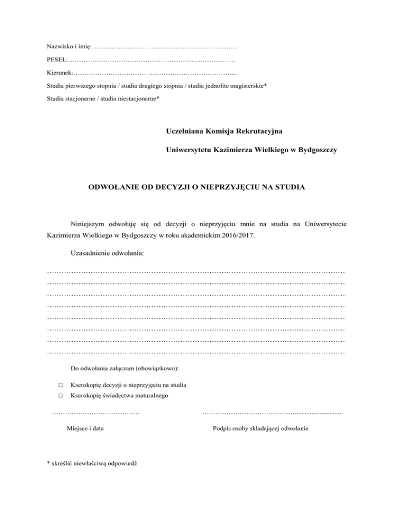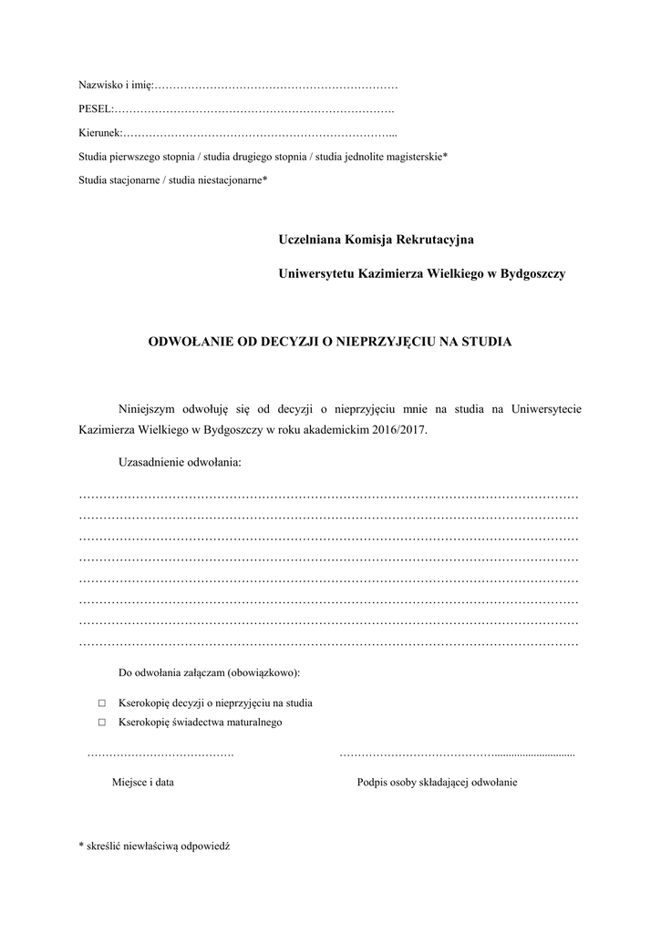 Nazwisko i imię:………………………………………………………… PESEL:…………………………………………………………………. Kierunek:………………………………………………………………... Studia pierwszego stopnia / studia drugiego stopnia / studia jednolite magisterskie* Studia stacjonarne / studia niestacjonarne* Uczelniana Komisja Rekrutacyjna Uniwersytetu Kazimierza Wielkiego w Bydgoszczy ODWOŁANIE OD DECYZJI O NIEPRZYJĘCIU NA STUDIA Niniejszym odwołuję się od decyzji o nieprzyjęciu mnie na studia na Uniwersytecie Kazimierza Wielkiego w Bydgoszczy w roku akademickim 2016/2017. Uzasadnienie odwołania: …………………………………………………………………………………………………………… …………………………………………………………………………………………………………… …………………………………………………………………………………………………………… …………………………………………………………………………………………………………… …………………………………………………………………………………………………………… …………………………………………………………………………………………………………… …………………………………………………………………………………………………………… …………………………………………………………………………………………………………… Do odwołania załączam (obowiązkowo): □ Kserokopię decyzji o nieprzyjęciu na studia □ Kserokopię świadectwa maturalnego …………………………………. Miejsce i data * skreślić niewłaściwą odpowiedź ……………………………………............................. Podpis osoby składającej odwołanie