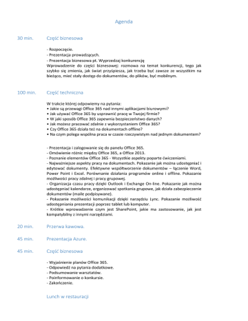 Agenda 30 min. Część biznesowa - Rozpoczęcie. - Prezentacja prowadzących. - Prezentacja biznesowa pt. Wyprzedzaj konkurencję Wprowadzenie do części biznesowej: rozmowa na temat konkurencji, tego jak szybko się zmienia, jak świat przyśpiesza, jak trzeba być zawsze ze wszystkim na bieżąco, mieć stały dostęp do dokumentów, do plików, być mobilnym. 100 min. Część techniczna W trakcie której odpowiemy na pytania: • Jakie są przewagi Office 365 nad innymi aplikacjami biurowymi? • Jak używać Office 365 by usprawnić pracę w Twojej firmie? • W jaki sposób Office 365 zapewnia bezpieczeństwo danych? • Jak możesz pracować zdalnie z wykorzystaniem Office 365? • Czy Office 365 działa też na dokumentach offline? • Na czym polega wspólna praca w czasie rzeczywistym nad jednym dokumentem? - Prezentacja i zalogowanie się do panelu Office 365. - Omówienie różnic między Office 365, a Office 2013. - Poznanie elementów Office 365 - Wszystkie aspekty poparte ćwiczeniami. - Najważniejsze aspekty pracy na dokumentach. Pokazanie jak można udostępniać i edytować dokumenty. Efektywne współtworzenie dokumentów – łączenie Word, Power Point i Excel. Porównanie działania programów online i offline. Pokazanie możliwości pracy zdalnej i pracy grupowej. - Organizacja czasu pracy dzięki Outlook i Exchange On-line. Pokazanie jak można udostępniać kalendarze, organizować spotkania grupowe, jak działa zabezpieczenie dokumentów (maile podpisywane). - Pokazanie możliwości komunikacji dzięki narzędziu Lync. Pokazanie możliwość udostępniania prezentacji poprzez tablet lub komputer. - Krótkie wprowadzenie czym jest SharePoint, jakie ma zastosowanie, jak jest kompatybilny z innymi narzędziami. 20 min. Przerwa kawowa. 45 min. Prezentacja Azure. 45 min. Część biznesowa - Wyjaśnienie planów Office 365. - Odpowiedź na pytania dodatkowe. - Podsumowanie warsztatów. - Poinformowanie o konkursie. - Zakończenie. Lunch w restauracji
