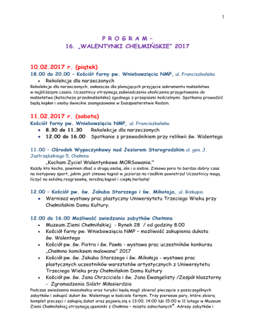 1 P R O G R A M – 16. „WALENTYNKI CHEŁMIŃSKIE” 2017 10.02.2017 r. (piątek) 18.00 do 20.00 – Kościół farny pw. Wniebowzięcia NMP, ul. Franciszkańska  Rekolekcje dla narzeczonych Rekolekcje dla narzeczonych, zwłaszcza dla planujących przyjęcie sakramentu małżeństwa w najbliższym czasie. Uczestnicy otrzymają zaświadczenia ukończenia przygotowania do małżeństwa (katecheza przedmałżeńska) zgodnego z przepisami kościelnymi. Spotkania prowadzić będą kapłan i osoby świeckie zaangażowane w Duszpasterstwie Rodzin. 11.02.2017 r. (sobota) Kościół farny pw. Wniebowzięcia NMP, ul. Franciszkańska  8.30 do 11.30 Rekolekcje dla narzeczonych  12.00 do 16.00 Spotkanie z przewodnikiem przy relikwii św. Walentego 11.00 – Ośrodek Wypoczynkowy nad Jeziorem Starogrodzkim ul. gen. J. Jastrzębskiego 5, Chełmno „Kocham Życie! Walentynkowe MORSowanie." Każdy kto kocha, powinien dbać o drugą osobę, ale i o siebie. Zimowa pora to bardzo dobry czas na nietypowy sport, jakim jest zimowa kąpiel w jeziorze na rześkim powietrzu! Uczestnicy mogą liczyć na solidną rozgrzewkę, mroźną kąpiel i ciepłą herbatę! 12.00 – Kościół pw. św. Jakuba Starszego i św. Mikołaja, ul. Biskupia  Wernisaż wystawy prac plastyczny Uniwersytetu Trzeciego Wieku przy Chełmińskim Domu Kultury. 12.00 do 16.00 Możliwość zwiedzania zabytków Chełmna  Muzeum Ziemi Chełmińskiej - Rynek 28 / od godziny 8.00  Kościół farny pw. Wniebowzięcia NMP – możliwość zakupienia dukata św. Walentego  Kościół pw. św. Piotra i św. Pawła - wystawa prac uczestników konkursu „Chełmno komiksem malowane” 2017  Kościół pw. św. Jakuba Starszego i św. Mikołaja - wystawa prac plastycznych uczestników warsztatów artystycznych z Uniwersytetu Trzeciego Wieku przy Chełmińskim Domu Kultury  Kościół pw. św. Jana Chrzciciela i św. Jana Ewangelisty /Zespół klasztorny - Zgromadzenia Sióstr Miłosierdzia Podczas zwiedzania mieszkańcy oraz turyści będą mogli zbierać pieczęcie z poszczególnych zabytków i zakupić dukat św. Walentego w kościele farnym. Trzy pierwsze pary, które zbiorą komplet pieczęci i zakupią dukat oraz pojawią się o 13:00; 14:00 lub 15:00 w 11 lutego w Muzeum Ziemi Chełmińskiej otrzymają upominki z Chełmna – miasta zakochanych®. Adresy zabytków i 2 mapki z miejscem na pieczęcie dostępne będą w każdym z w.w. punktów oraz do pobrania na stronie: www.chelmno.pl 13.00 – Chełmiński Dom Kultury, ul. Dworcowa 40a Warsztaty komiksowe „Miłość (nie)poważna w satyrze i komiksie” Jarosław Jaro Wojtasiński – karykaturzysta i satyryk Warsztaty z Jarosławem Jaro Wojtasińskim, karykaturzystą i satyrykiem w tematyce przypadków bohaterów komiksowych, ich uniesień i zawodów miłosnych w satyrycznym zwierciadle piórkiem rysującego na żywo karykaturzysty. 16.00 – Kościół pw. św. Piotra i św. Pawła, ul. Wodna  Otwarcie wystawy i rozstrzygnięcie konkursu „Chełmno komiksem malowane”.  Otwarcie wystawy Wojciecha Łowickiego „Miłosne przypadki słynnych komiksowych bohaterów”.  Prelekcja Michała Siromskiego „Skomplikowane życie uczuciowe superbohaterów”. Ogłoszeniu wyników i wręczenie nagród laureatom konkursu „Chełmno komiksem malowane” oraz otwarcie wystawy, która obejmować będzie prace zgłoszone do konkursu w ramach „Walentynek Chełmińskich” 2017. Wydarzeniu towarzyszyć będzie specjalnie stworzona na tę okazję wystawa „Miłosne przypadki słynnych komiksowych bohaterów" Wojciecha Łowickiego oraz prelekcja Michała Siromskiego „Skomplikowane życie uczuciowe superbohaterów" o modnych oraz znanych komiksowych parach i ich miłosnych przypadkach - superbohaterowie spod znaku Marvela i DC! 19.00 – Kościół farny pw. Wniebowzięcia NMP  Otwarcie wystawy prac z XII Ogólnopolskiego Konkursu Plastyczno – Literackiego „Na Świętego Walentego - różne oblicza miłości”. KONCERT MARTYNY JAKUBOWICZ JUBILEUSZOWY RECITAL - NAJWIĘKSZE HITY NA 40-STO LECIE! Martyna Jakubowicz – gitara, wokal Agnieszka Kural – gitara basowa Dariusz Bafeltowski – gitary klasyczna /elektryczna/ akustyczna, mandolina Przemysław Pacan – instrumenty perkusyjne W 2017 roku przypada czterdziestolecie pracy twórczej Martyny Jakubowicz. Z tej okazji Artystka przygotowała repertuar zawierający jej największe przeboje z lat 80-tych, 90-tych, a także z ostatnich dwóch płyt, w tym nagrodzonej Mateuszem 2016 płyty „Prosta Piosenka”. Wstęp wolny! 3 12.02.2017 r.(niedziela) 12.00 do 16.00 Możliwość zwiedzania zabytków Chełmna  Muzeum Ziemi Chełmińskiej - Rynek 28  Kościół farny pw. Wniebowzięcia NMP – możliwość zakupienia dukata św. Walentego  Baszta Panieńska – wybijanie denara chełmińskiego  Kościół pw. św. Piotra i św. Pawła - wystawa prac uczestników konkursu „Chełmno komiksem malowane” 2017  Kościół pw. św. Jakuba Starszego i św. Mikołaja - wystawa prac plastycznych uczestników warsztatów artystycznych z Uniwersytetu Trzeciego Wieku przy Chełmińskim Domu Kultury  Kościół pw. św. Jana Chrzciciela i św. Jana Ewangelisty /Zespół klasztorny Zgromadzenia Sióstr Miłosierdzia Podczas zwiedzania mieszkańcy oraz turyści będą mogli zbierać pieczęcie z poszczególnych zabytków i zakupić dukat św. Walentego w kościele farnym. Trzy pierwsze pary, które zbiorą komplet pieczęci i zakupią dukat oraz pojawią się o 13:00; 14:00 lub 15:00 w 12 lutego w Muzeum Ziemi Chełmińskiej otrzymają upominki z Chełmna – miasta zakochanych®. Adresy zabytków i mapki z miejscem na pieczęcie dostępne będą w każdym z w.w. punktów oraz do pobrania na stronie: www.chelmno.pl Kościół farny pw. Wniebowzięcia NMP  9.00 do 11.00 Rekolekcje dla narzeczonych  14.00 do 17.00 Spotkanie z przewodnikiem przy relikwii św. Walentego 13.00 – Kościół farny pw. Wniebowzięcia NMP  Msza dla jubilatów i małżeństw obchodzących