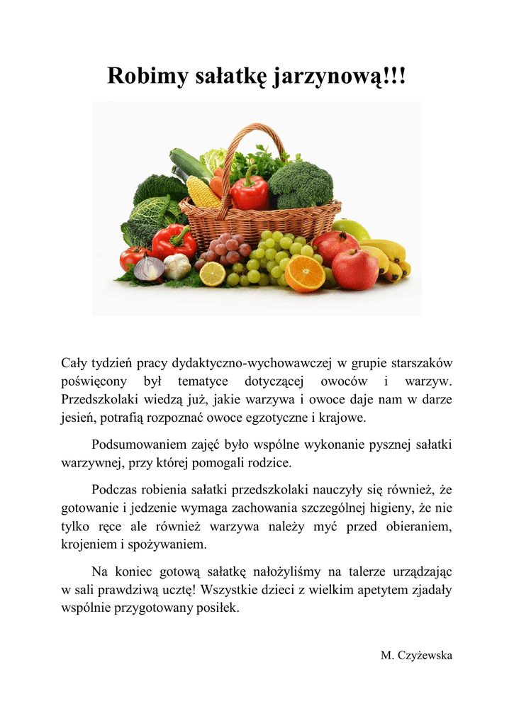 Robimy sałatkę jarzynową!!! Cały tydzień pracy dydaktyczno-wychowawczej w grupie starszaków poświęcony był tematyce dotyczącej owoców i warzyw. Przedszkolaki wiedzą już, jakie warzywa i owoce daje nam w darze jesień, potrafią rozpoznać owoce egzotyczne i krajowe. Podsumowaniem zajęć było wspólne wykonanie pysznej sałatki warzywnej, przy której pomogali rodzice. Podczas robienia sałatki przedszkolaki nauczyły się również, że gotowanie i jedzenie wymaga zachowania szczególnej higieny, że nie tylko ręce ale również warzywa należy myć przed obieraniem, krojeniem i spożywaniem. Na koniec gotową sałatkę nałożyliśmy na talerze urządzając w sali prawdziwą ucztę! Wszystkie dzieci z wielkim apetytem zjadały wspólnie przygotowany posiłek. M. Czyżewska