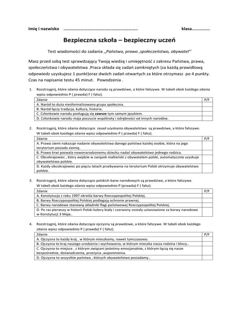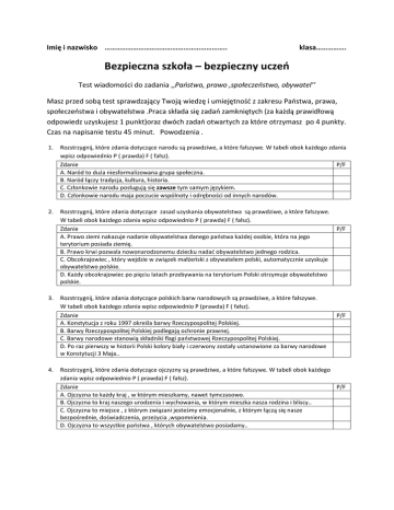 Imię i nazwisko ……………………………………………………….. klasa……………. Bezpieczna szkoła – bezpieczny uczeń Test wiadomości do zadania ,,Państwo, prawo ,społeczeństwo, obywatel’’ Masz przed sobą test sprawdzający Twoją wiedzę i umiejętność z zakresu Państwa, prawa, społeczeństwa i obywatelstwa .Praca składa się zadań zamkniętych (za każdą prawidłową odpowiedz uzyskujesz 1 punkt)oraz dwóch zadań otwartych za które otrzymasz po 4 punkty. Czas na napisanie testu 45 minut. Powodzenia . 1. Rozstrzygnij, które zdania dotyczące narodu są prawdziwe, a które fałszywe. W tabeli obok każdego zdania wpisz odpowiednio P ( prawda) F ( fałsz). Zdanie P/F A. Naród to duża niesformalizowana grupa społeczna. B. Naród łączy tradycja, kultura, historia. C. Członkowie narodu posługują się zawsze tym samym językiem. D. Członkowie narodu maja poczucie wspólnoty i odrębności od innych narodów. 2. Rozstrzygnij, które zdania dotyczące zasad uzyskania obywatelstwa są prawdziwe, a które fałszywe. W tabeli obok każdego zdania wpisz odpowiednio P ( prawda) F ( fałsz). Zdanie A. Prawo ziemi nakazuje nadanie obywatelstwa danego państwa każdej osobie, która na jego terytorium posiada ziemię. B. Prawo krwi pozwala nowonarodzonemu dziecku nadać obywatelstwo jednego rodzica. C. Obcokrajowiec , który wejdzie w związek małżeński z obywatelem polski, automatycznie uzyskuje obywatelstwo polskie. D. Każdy obcokrajowiec po pięciu latach przebywania na terytorium Polski otrzymuje obywatelstwo polskie. 3. 4. Rozstrzygnij, które zdania dotyczące polskich barw narodowych są prawdziwe, a które fałszywe. W tabeli obok każdego zdania wpisz odpowiednio P (prawda) F ( fałsz). Zdanie A. Konstytucja z roku 1997 określa barwy Rzeczypospolitej Polskiej. B. Barwy Rzeczypospolitej Polskiej podlegają ochronie prawnej. C. Barwy narodowe stanowią składniki flagi państwowej Rzeczypospolitej Polskiej. D. Po raz pierwszy w historii Polski kolory biały i czerwony zostały ustanowione za barwy narodowe w Konstytucji 3 Maja.. P/F P/F Rozstrzygnij, które zdania dotyczące ojczyzny są prawdziwe, a które fałszywe. W tabeli obok każdego zdania wpisz odpowiednio P ( prawda) F ( fałsz). Zdanie P/F A. Ojczyzna to każdy kraj , w którym mieszkamy, nawet tymczasowo. B. Ojczyzna to kraj naszego urodzenia i wychowania, w którym mieszka nasza rodzina i bliscy.. C. Ojczyzna to miejsce , z którym związani jesteśmy emocjonalnie, z którym łączą się nasze bezpośrednie, doświadczenia, przeżycia ,wspomnienia. D. Ojczyzna to wszystkie państwa , których obywatelstwo posiadamy.. 5. Rozstrzygnij, które zdania dotyczące prezydenckiego systemu rządów są prawdziwe, a które fałszywe. W tabeli obok każdego zdania wpisz odpowiednio P ( prawda) F ( fałsz). Zdanie P/F A. Prezydent w swoich rękach skupia władzę ustawodawczą i wykonawczą . B. Prezydent pełni zarówno funkcje głowy państwa jak i szefa rządu. C. Prezydent stoi na czele państwa demokratycznego. D. Wybory prezydenckie odbywają się co 5 lat. . 6. Zaznacz fałszywą odpowiedz. Zgodnie z Konstytucją Rzeczypospolitej Polskiej obywatele maja : A. Prawo do wolności słowa. B. Prawo zrzeszania się. C. Prawo do ochrony zdrowia. D. Obowiązek służby wojskowej. 7. Elementem składającym się na pojęcie państwa nie jest A. Ludność. B. Religia C. Terytorium D. Władza. 8. Zasada trójpodziału władzy oznacza, że A. Uprawnienia organów władzy państwowej regulowane są przez prawo. B. W państwie możliwe jest istnienie wielu organizacji politycznych, społecznych i gospodarczych. C. W państwie istnieje podział na władzę ustawodawczą , wykonawczą i sadowniczą . D. Władza państwowa jest powoływana przez ogół obywateli i przed nimi odpowiada. 9. Wymień dwa przykłady i uzasadnij świadczące o łamaniu praw człowieka we współczesnym świecie. 1………………………………………………………………………………………………………………………………………………………………….. …………………………………………………………………………………………………………………………………………………………………….. …………………………………………………………………………………………………………………………………………………………………….. 2…………………………………………………………………………………………………………………………………………………………………… …………………………………………………………………………………………………………………………………………………………………….. …………………………………………………………………………………………………………………………………………………………………….. 10. Napisz które prawo przysługujące uczniom uważasz za najistotniejsze . Wypowiedz uzasadnij podając dwa argumenty. Wypowiedz………………………………………………………………………………………………………………………………………………… ………………………………………………………………………………………………………………………………………………………………….. ……………………………………………………………………………………………………………………………………………………………………. 1 argument………………………………………………………………………………………………………………………………………………….. ………………………………………………………