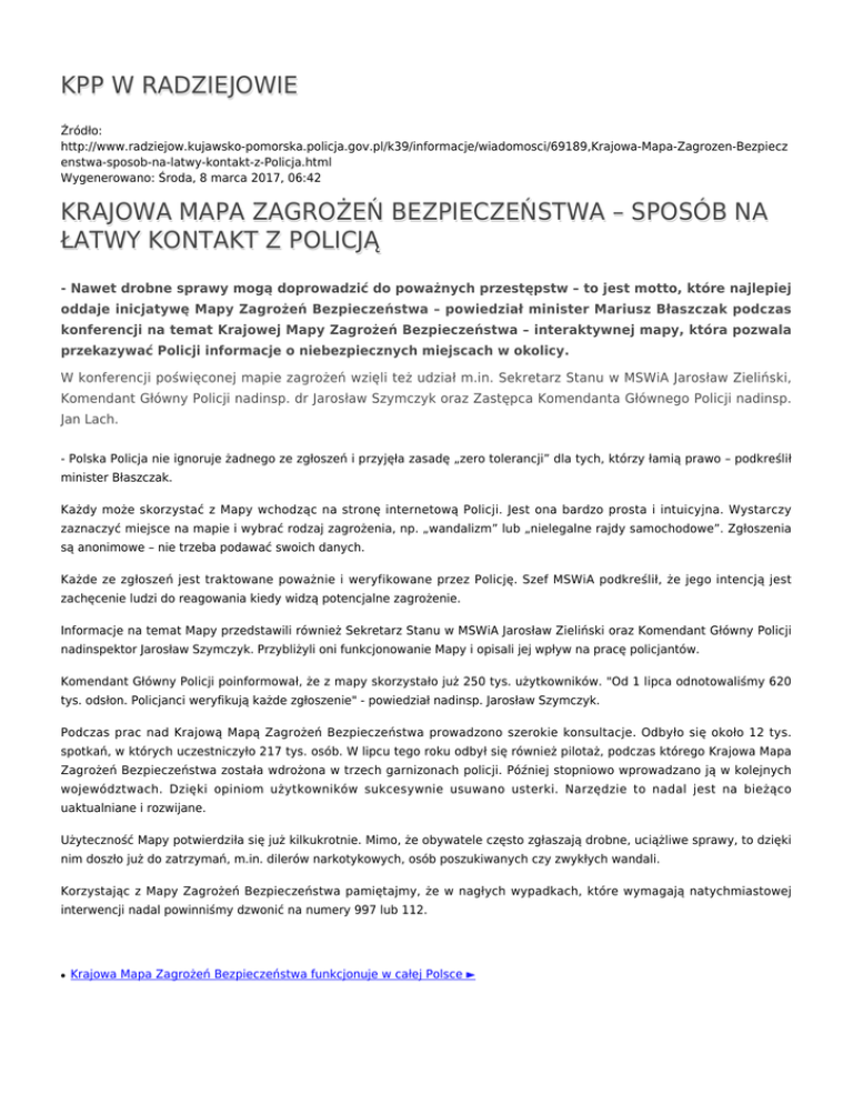 KPP W RADZIEJOWIE Źródło: http://www.radziejow.kujawsko-pomorska.policja.gov.pl/k39/informacje/wiadomosci/69189,Krajowa-Mapa-Zagrozen-Bezpiecz enstwa-sposob-na-latwy-kontakt-z-Policja.html Wygenerowano: Środa, 8 marca 2017, 06:42 KRAJOWA MAPA ZAGROŻEŃ BEZPIECZEŃSTWA – SPOSÓB NA ŁATWY KONTAKT Z POLICJĄ - Nawet drobne sprawy mogą doprowadzić do poważnych przestępstw – to jest motto, które najlepiej oddaje inicjatywę Mapy Zagrożeń Bezpieczeństwa – powiedział minister Mariusz Błaszczak podczas konferencji na temat Krajowej Mapy Zagrożeń Bezpieczeństwa – interaktywnej mapy, która pozwala przekazywać Policji informacje o niebezpiecznych miejscach w okolicy. W konferencji poświęconej mapie zagrożeń wzięli też udział m.in. Sekretarz Stanu w MSWiA Jarosław Zieliński, Komendant Główny Policji nadinsp. dr Jarosław Szymczyk oraz Zastępca Komendanta Głównego Policji nadinsp. Jan Lach. - Polska Policja nie ignoruje żadnego ze zgłoszeń i przyjęła zasadę „zero tolerancji” dla tych, którzy łamią prawo – podkreślił minister Błaszczak. Każdy może skorzystać z Mapy wchodząc na stronę internetową Policji. Jest ona bardzo prosta i intuicyjna. Wystarczy zaznaczyć miejsce na mapie i wybrać rodzaj zagrożenia, np. „wandalizm” lub „nielegalne rajdy samochodowe”. Zgłoszenia są anonimowe – nie trzeba podawać swoich danych. Każde ze zgłoszeń jest traktowane poważnie i weryfikowane przez Policję. Szef MSWiA podkreślił, że jego intencją jest zachęcenie ludzi do reagowania kiedy widzą potencjalne zagrożenie. Informacje na temat Mapy przedstawili również Sekretarz Stanu w MSWiA Jarosław Zieliński oraz Komendant Główny Policji nadinspektor Jarosław Szymczyk. Przybliżyli oni funkcjonowanie Mapy i opisali jej wpływ na pracę policjantów. Komendant Główny Policji poinformował, że z mapy skorzystało już 250 tys. użytkowników. "Od 1 lipca odnotowaliśmy 620 tys. odsłon. Policjanci weryfikują każde zgłoszenie" - powiedział nadinsp. Jarosław Szymczyk. Podczas prac nad Krajową Mapą Zagrożeń Bezpieczeństwa prowadzono szerokie konsultacje. Odbyło się około 12 tys. spotkań, w których uczestniczyło 217 tys. osób. W lipcu tego roku odbył się również pilotaż, podczas którego Krajowa Mapa Zagrożeń Bezpieczeństwa została wdrożona w trzech garnizonach policji. Później stopniowo wprowadzano ją w kolejnych województwach. Dzięki opiniom użytkowników sukcesywnie usuwano usterki. Narzędzie to nadal jest na bieżąco uaktualniane i rozwijane. Użyteczność Mapy potwierdziła się już kilkukrotnie. Mimo, że obywatele często zgłaszają drobne, uciążliwe sprawy, to dzięki nim doszło już do zatrzymań, m.in. dilerów narkotykowych, osób poszukiwanych czy zwykłych wandali. Korzystając z Mapy Zagrożeń Bezpieczeństwa pamiętajmy, że w nagłych wypadkach, które wymagają natychmiastowej interwencji nadal powinniśmy dzwonić na numery 997 lub 112. ● Krajowa Mapa Zagrożeń Bezpieczeństwa funkcjonuje w całej Polsce ► Autor: źródło KGP Publikacja: Kamila Ogonowska Ocena: 0/5 (0) Tweetnij